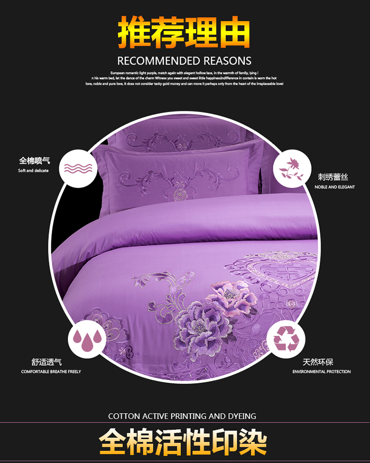 商品名称:慕她家纺 婚庆四件套大红蕾丝刺绣全棉纯棉花蔓喜多雪青