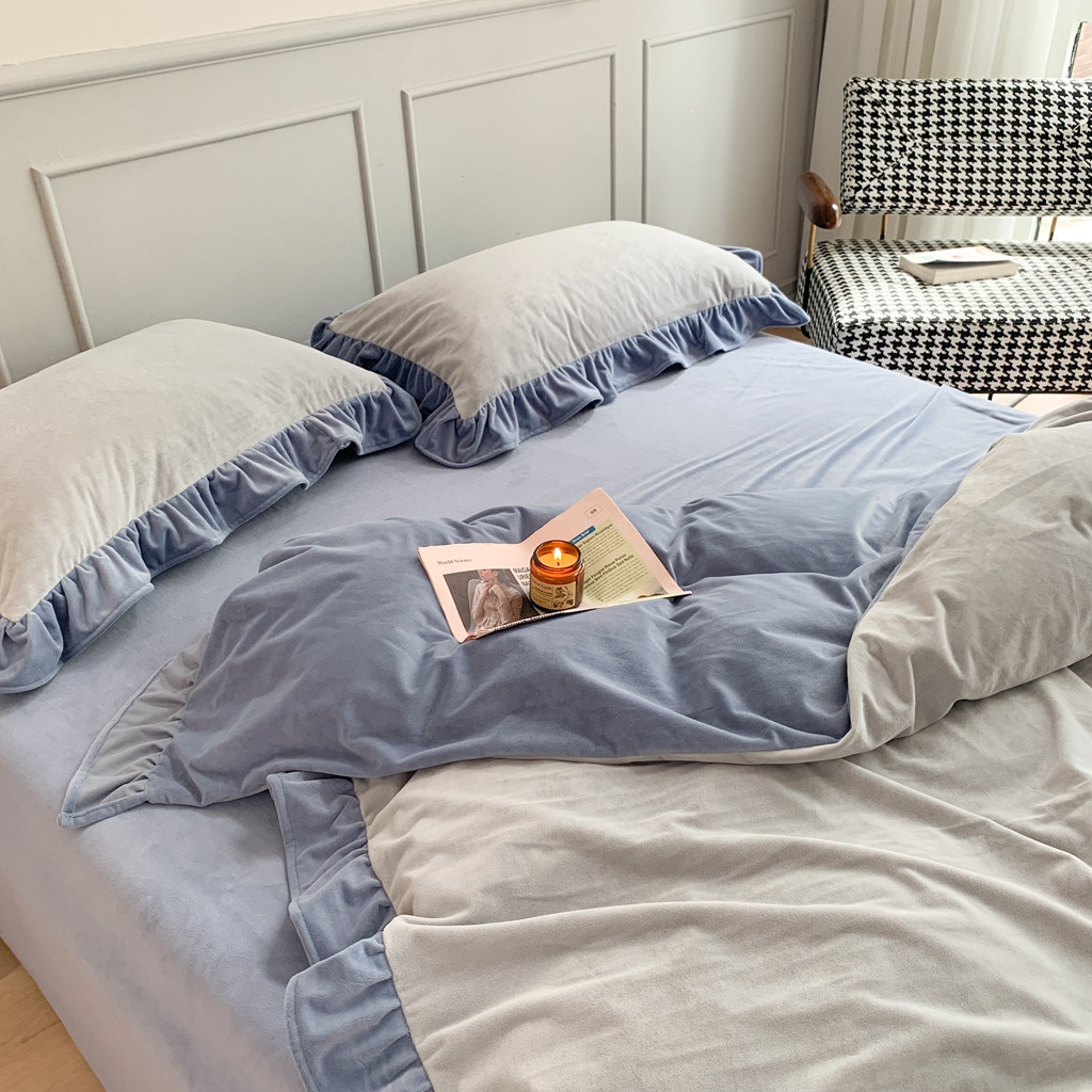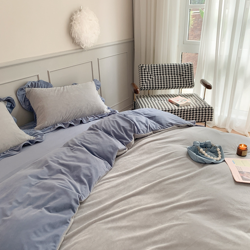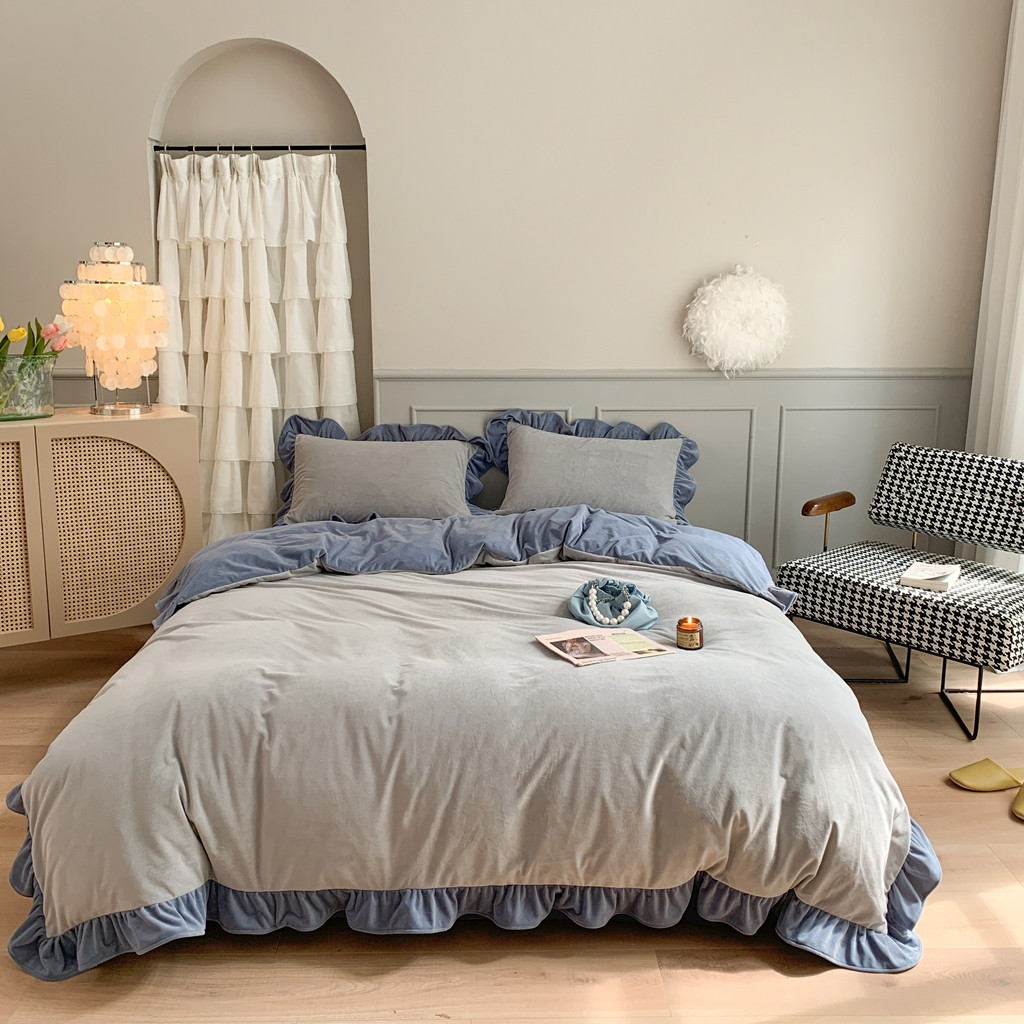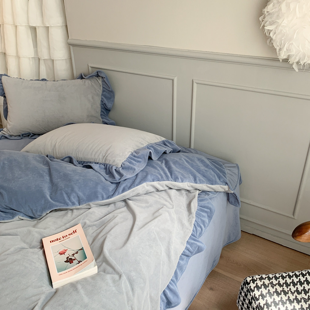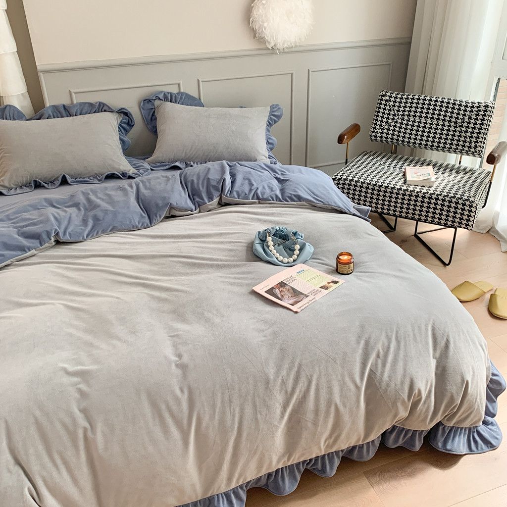 时年 2021新款婴肤绒纯色花边款四件套 丝绒蓝灰