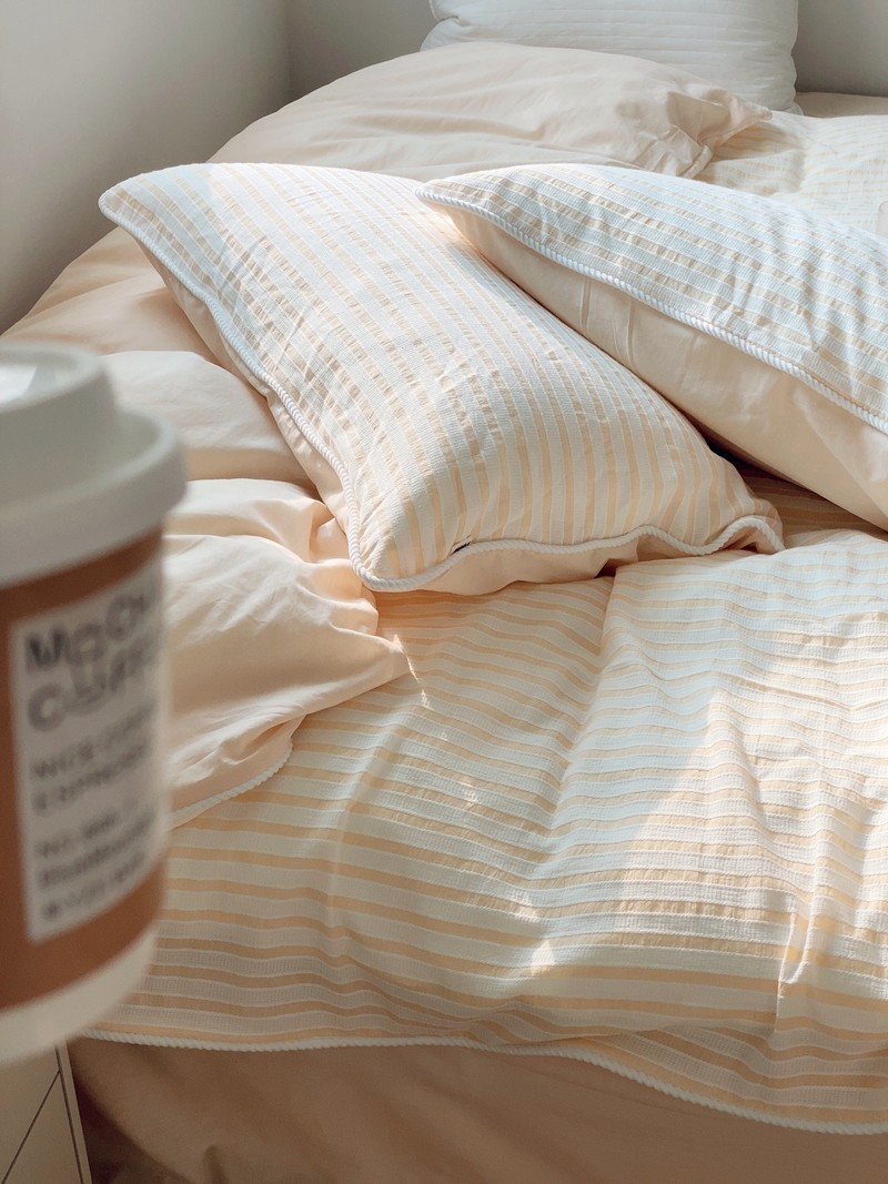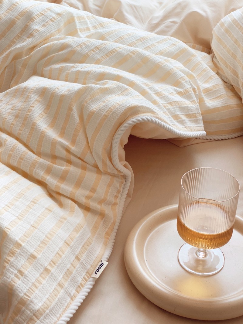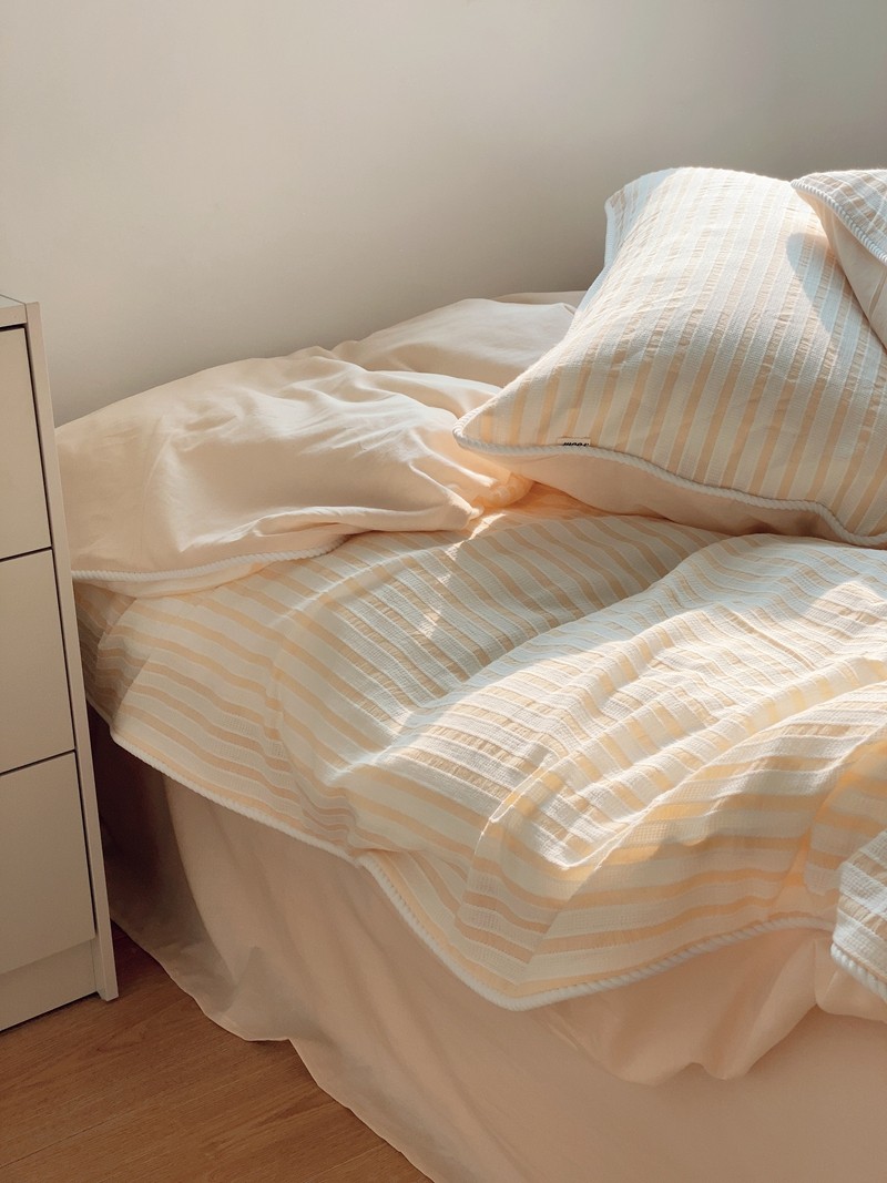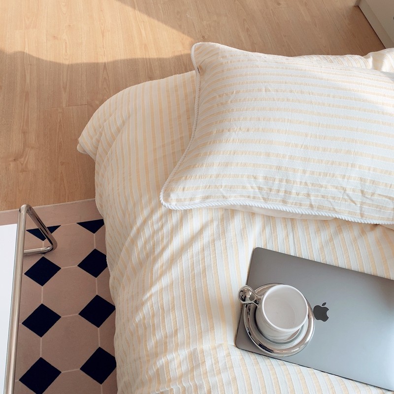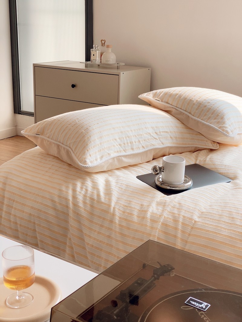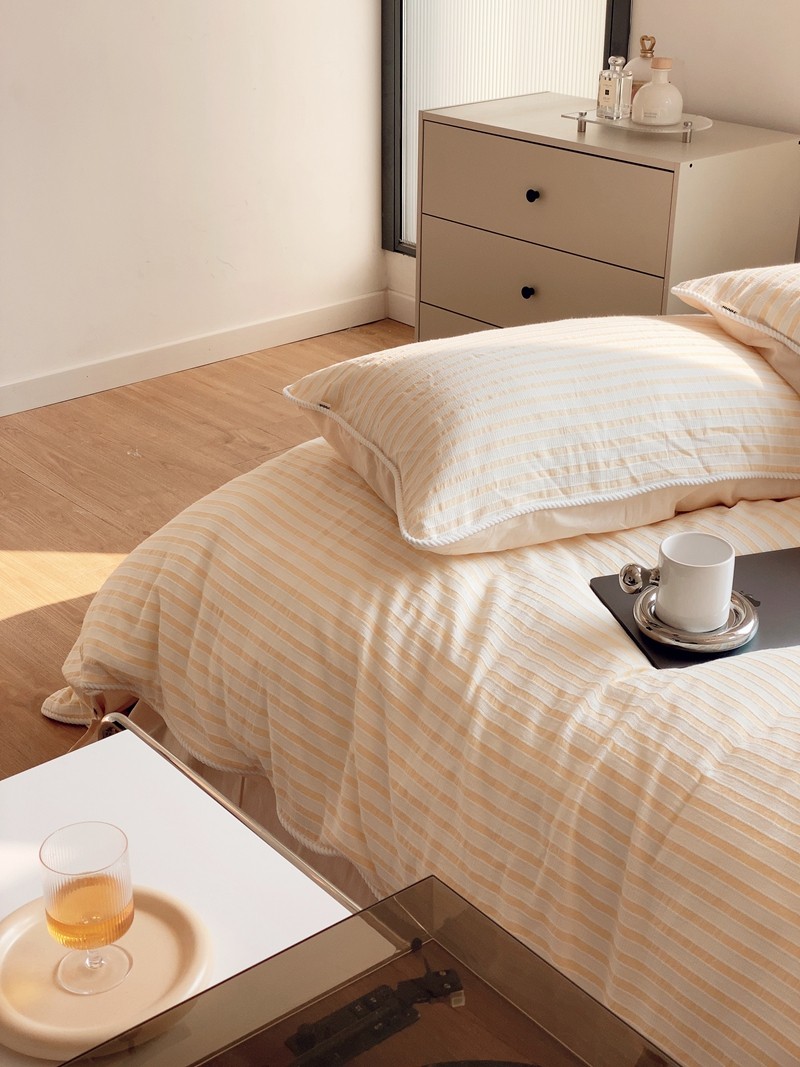商品名称:桔子家纺022新款全棉立体条纹提花泡泡纱四件套系列 条纹提花奶黄
