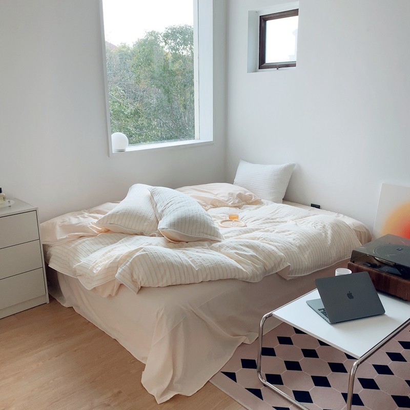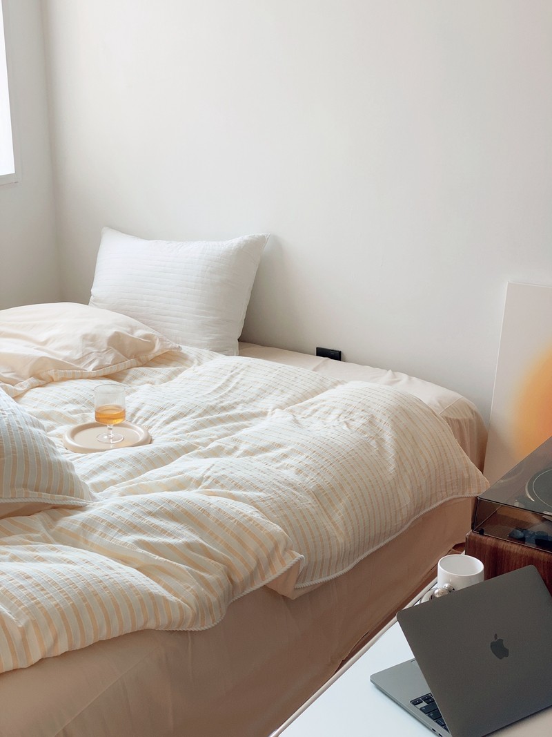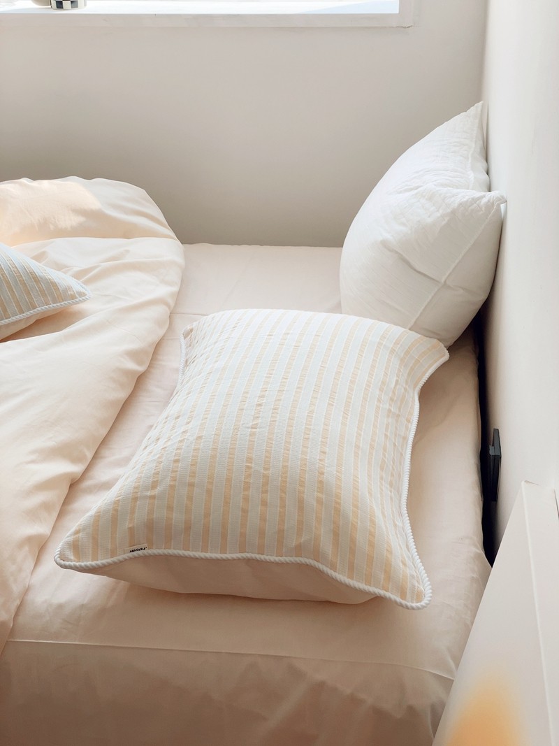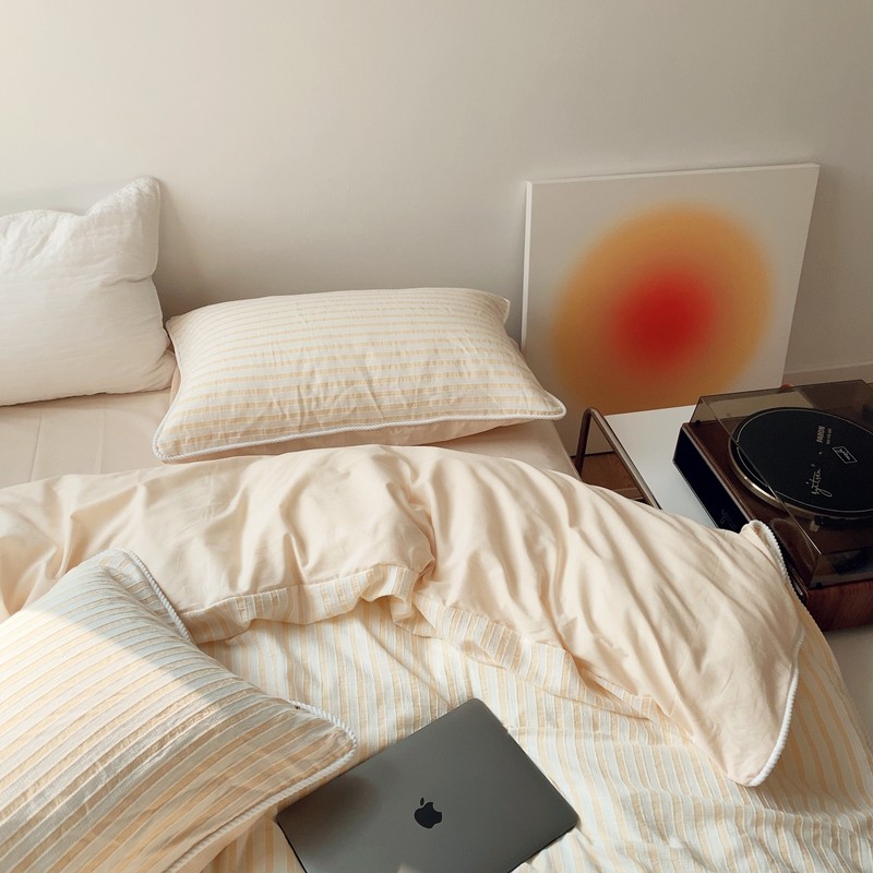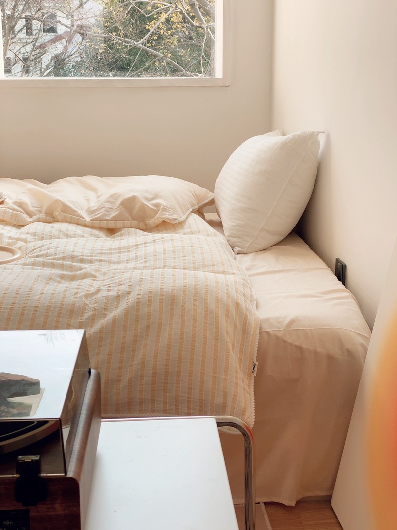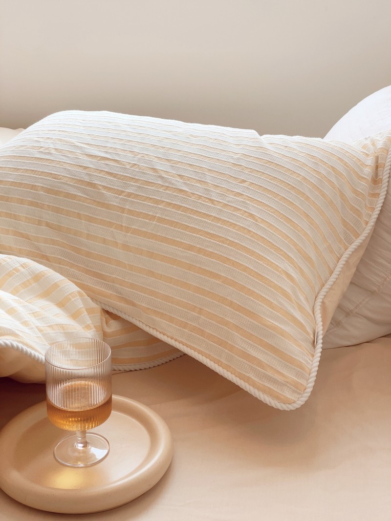 商品名称:桔子家纺022新款全棉立体条纹提花泡泡纱四件套系列 条纹提花奶黄