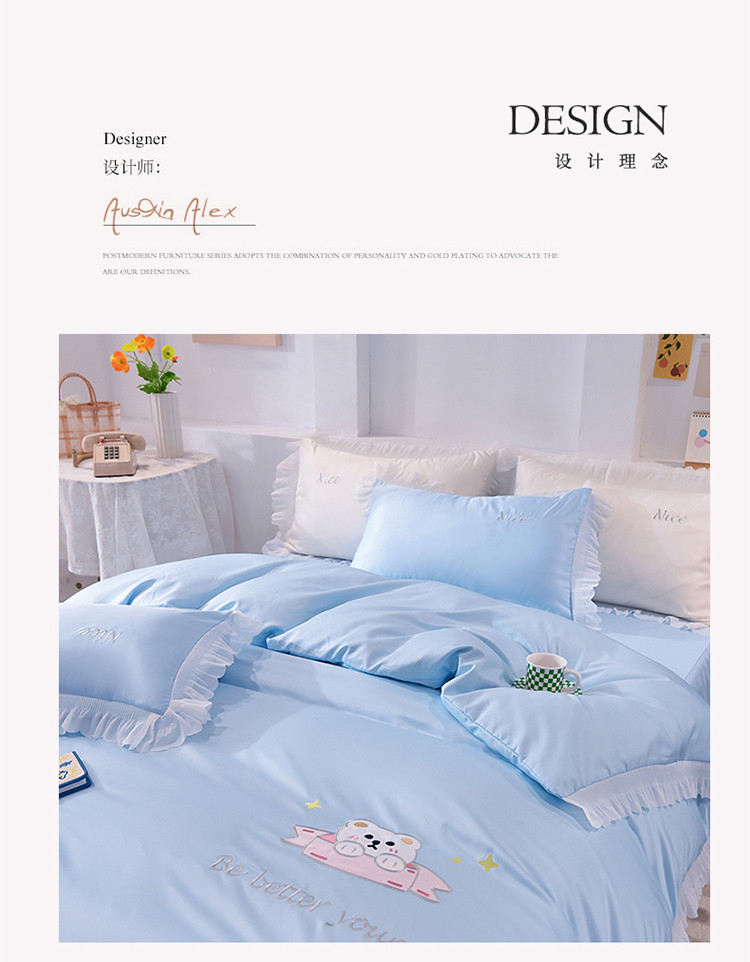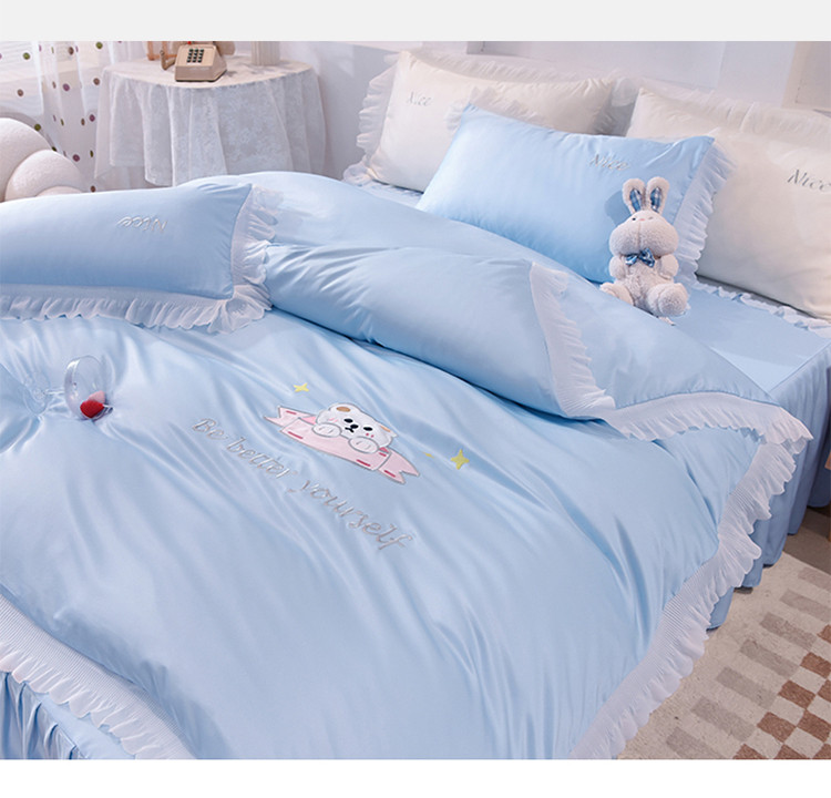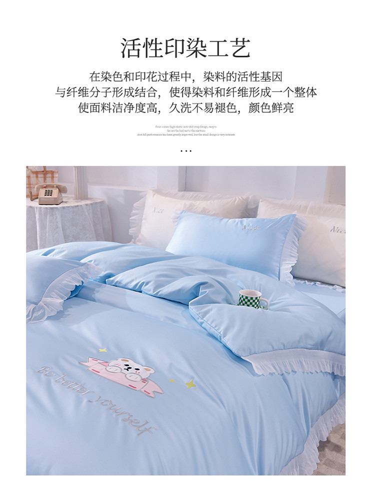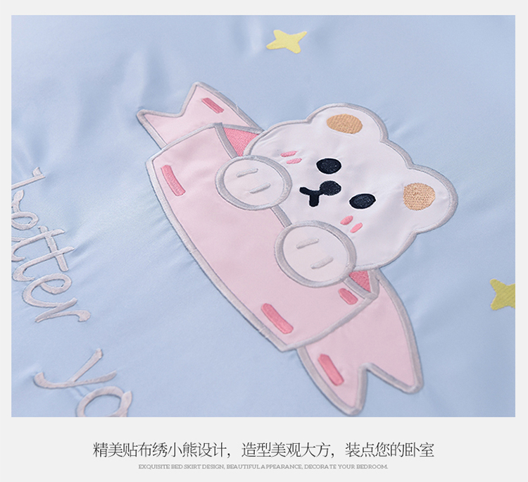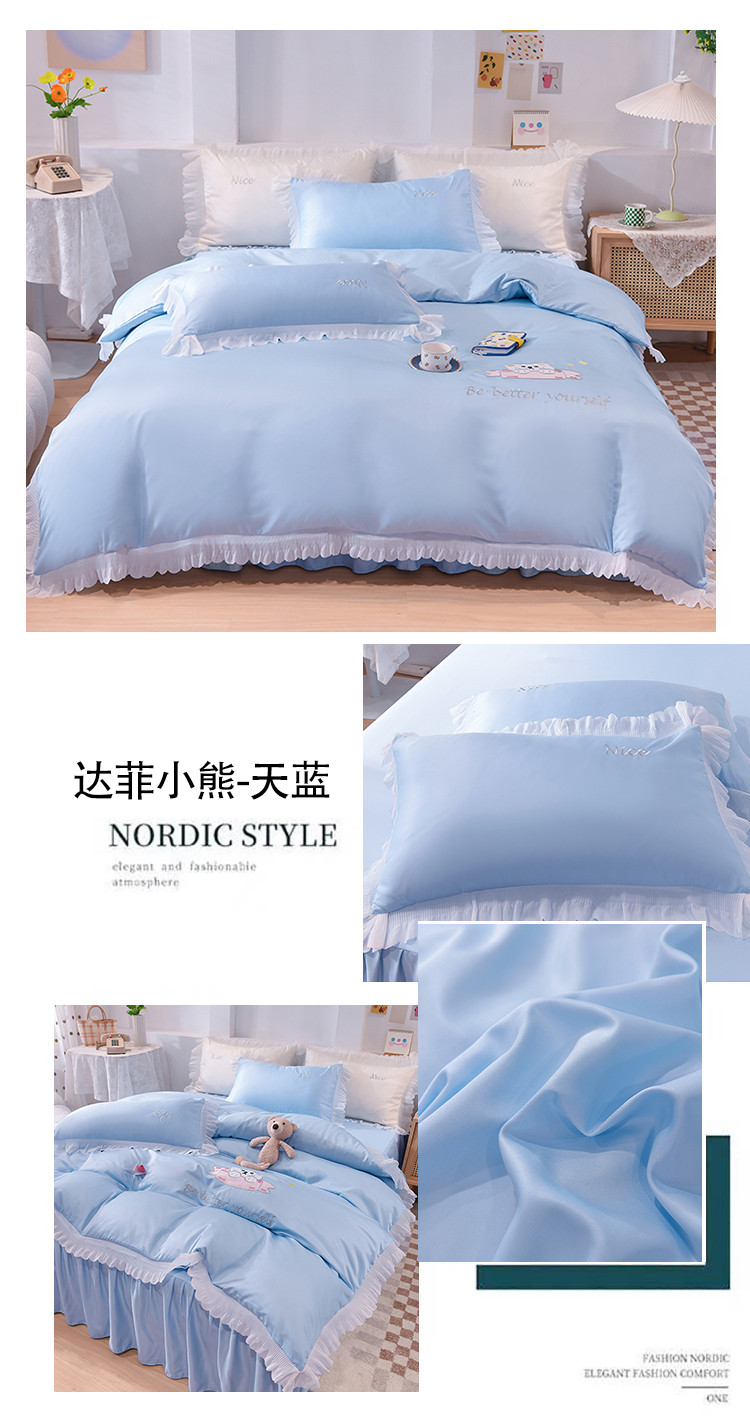 商品名称:艾米家居 2025新款水洗真丝雪纺花边贴布绣四件套-达菲小熊 天蓝