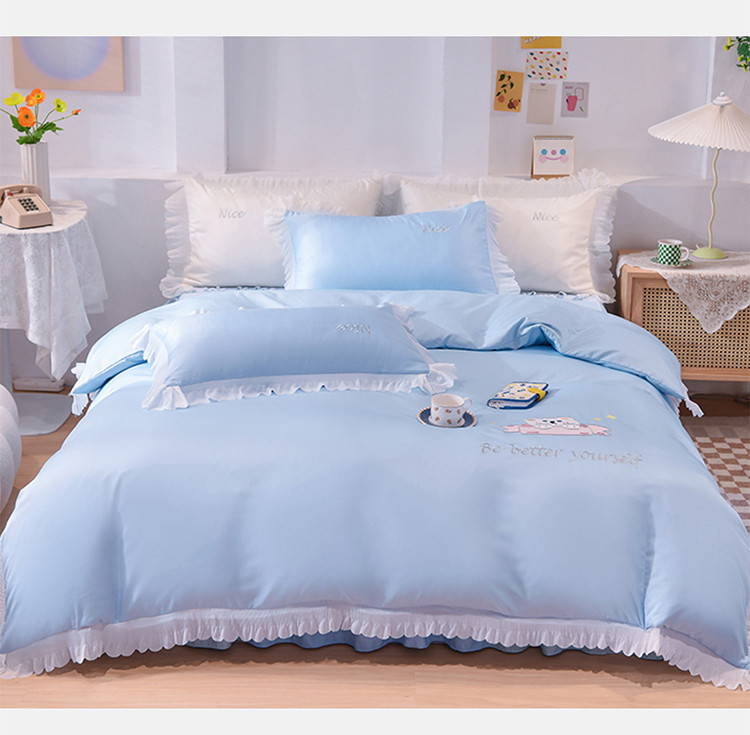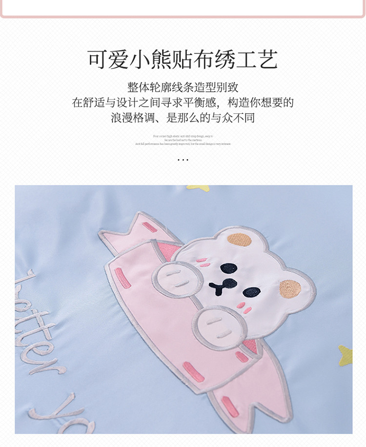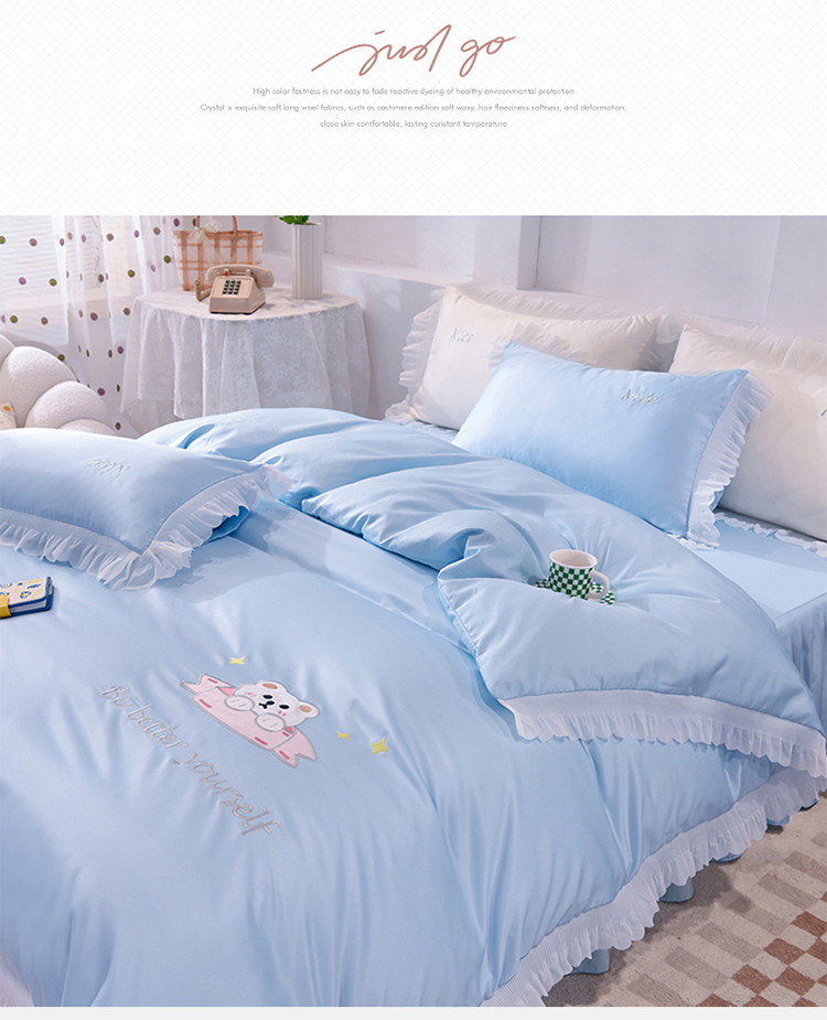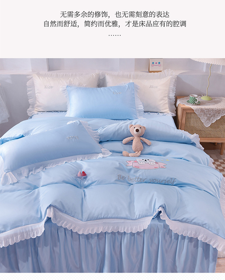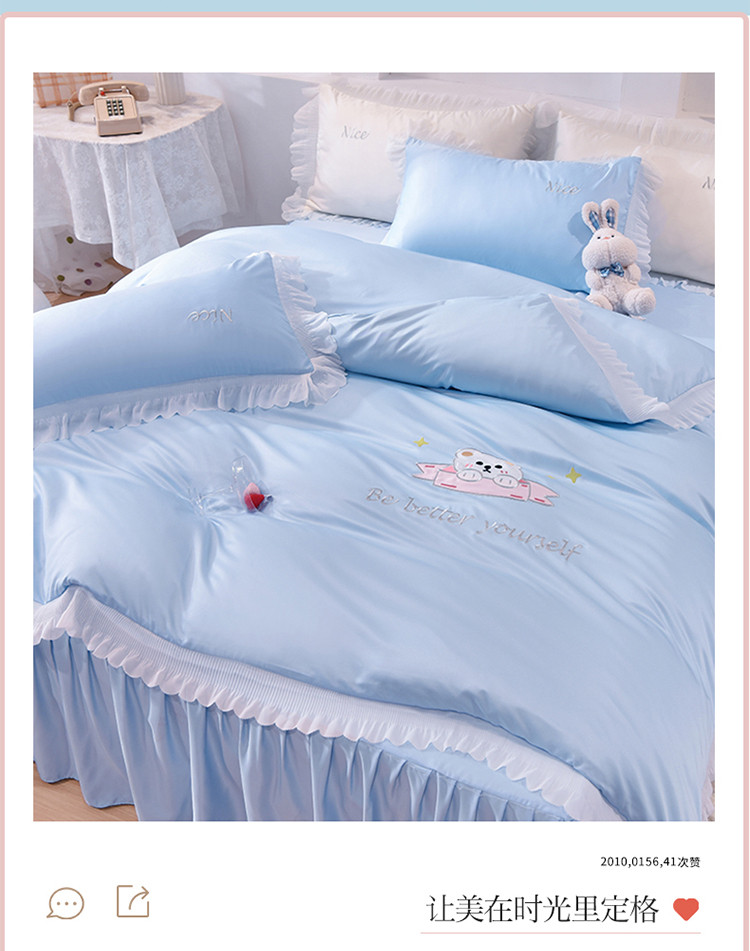 商品名称:艾米家居 2025新款水洗真丝雪纺花边贴布绣四件套-达菲小熊 天蓝