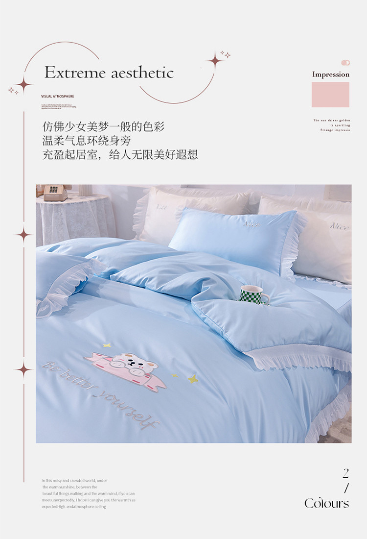总艾米家居2025新款水洗真丝雪纺花边贴布绣四件套-达菲小熊,白色,薄荷绿,宾利蓝,淡粉,豆沙,鹅黄,灰色,天蓝,香槟,玉色