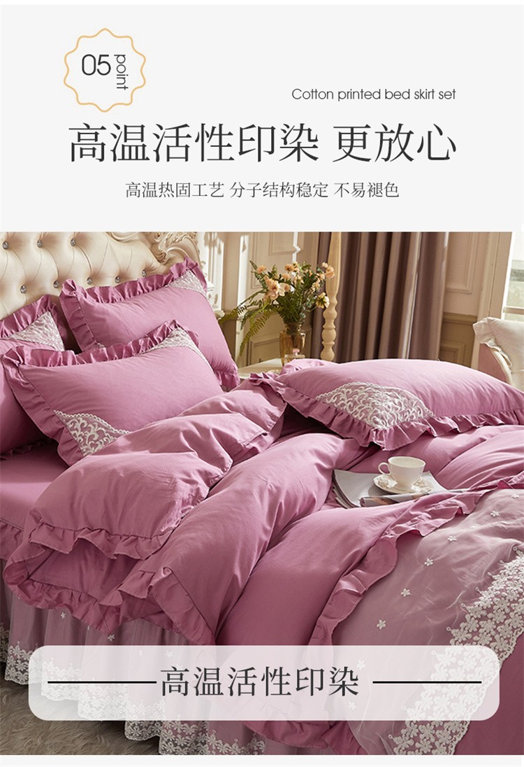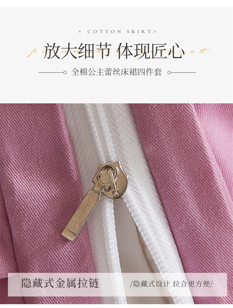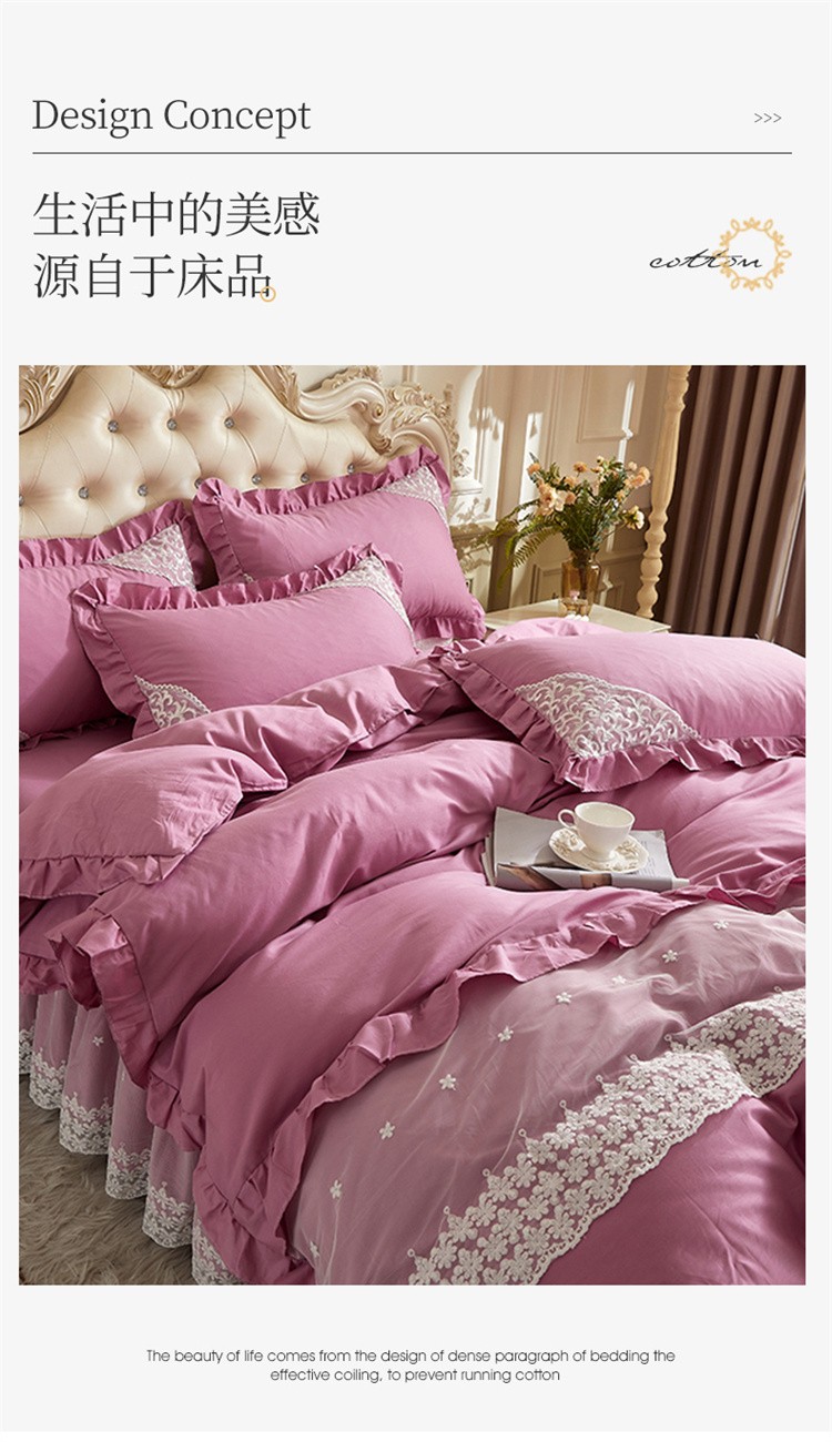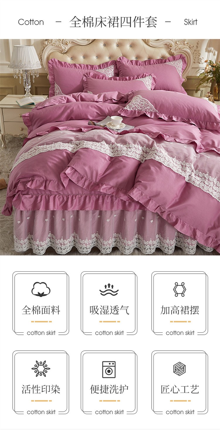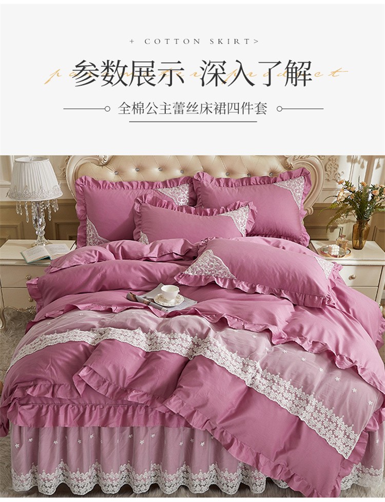 当前位置: 91家纺网 > 商品网购 > 床品套件 > 四件套 > 全棉普通四件套 > 十个点 2022新款纯色全棉公主风蕾丝花边床裙四件套 豆沙色