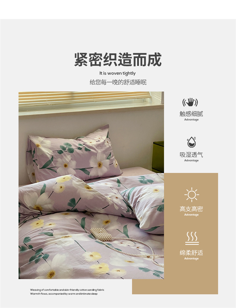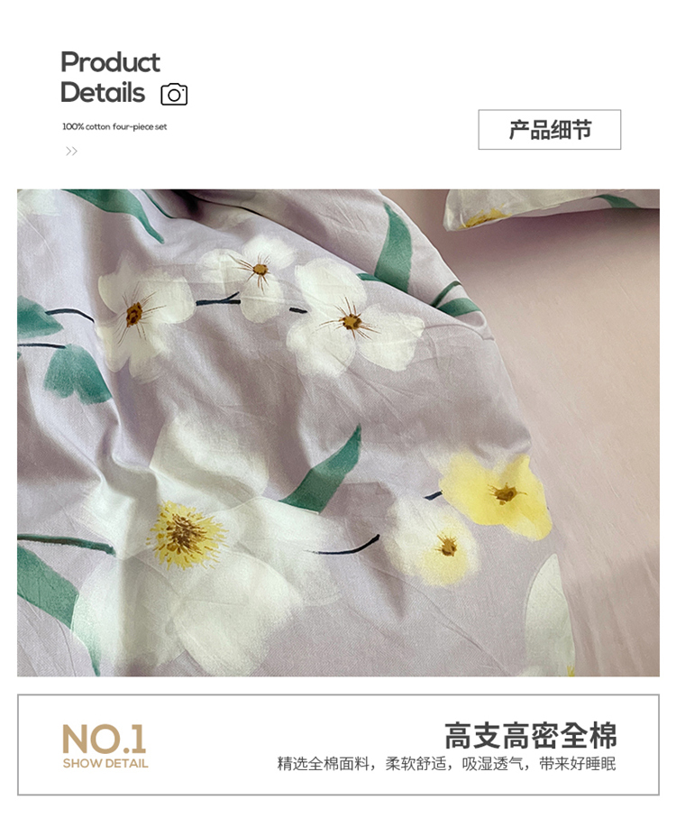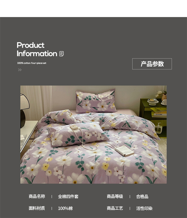 商品名称:窝米 2022秋季新品全棉13370花卉系列四件套 伊洛紫