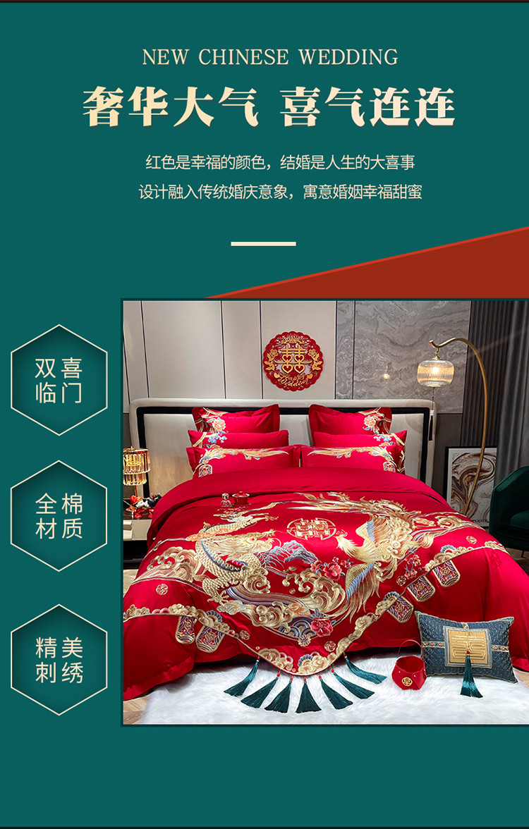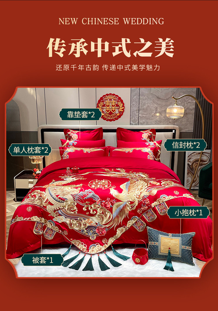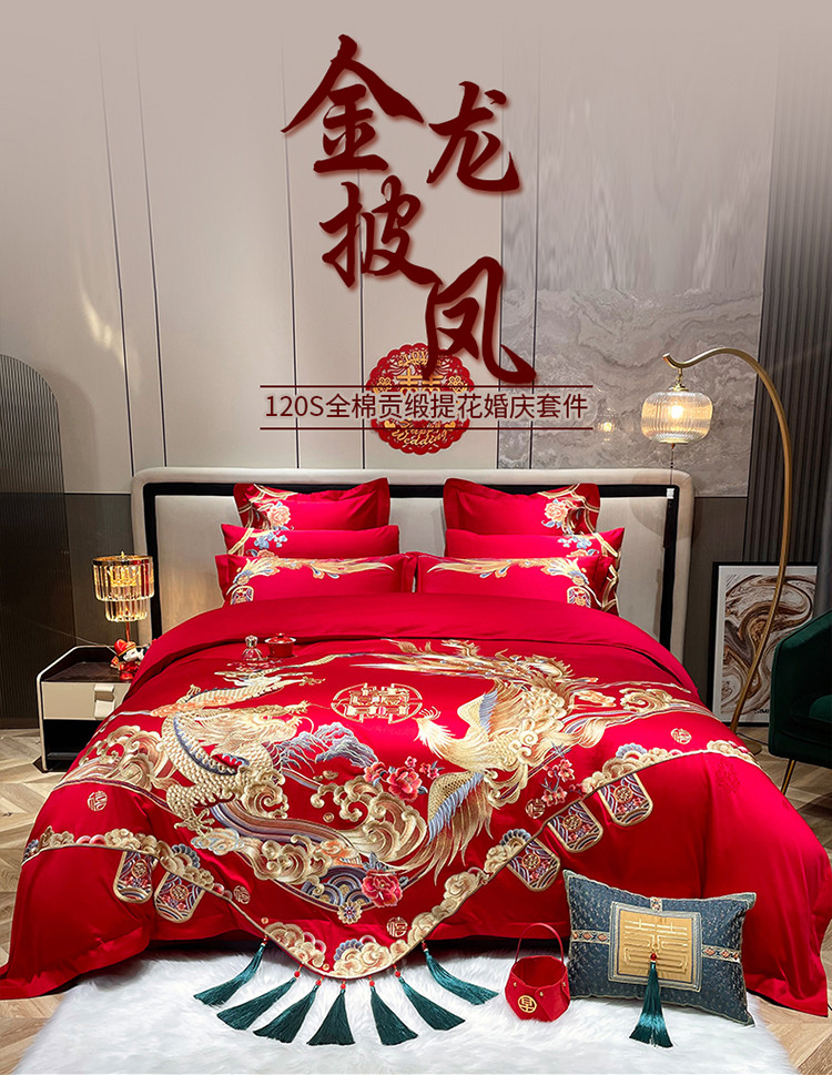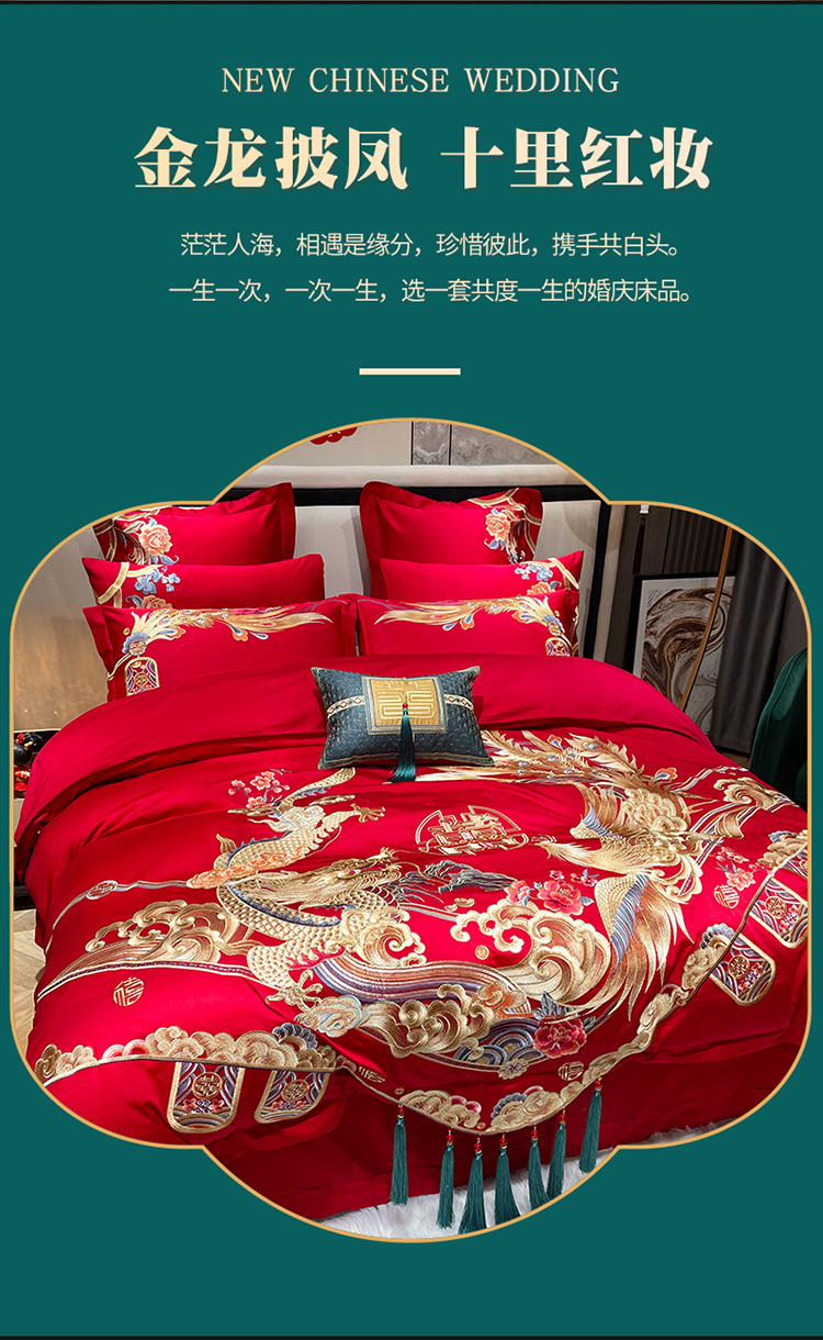 当前位置: 91家纺网 > 商品网购 > 床品套件 > 多件套 > 多件套 > 红番天热卖款全棉提花贡缎澳棉提花中式精美苏绣多件套金龙披凤