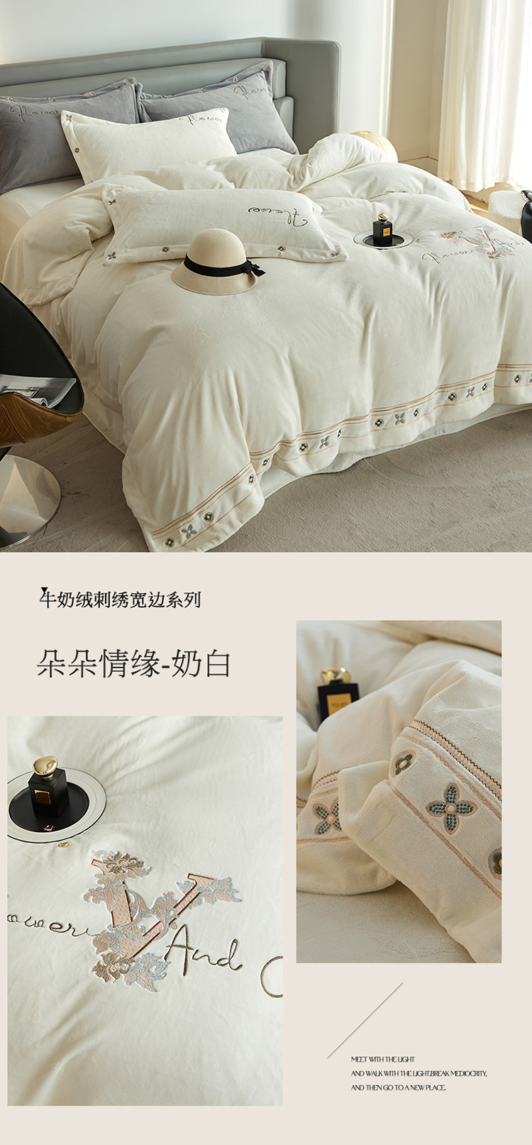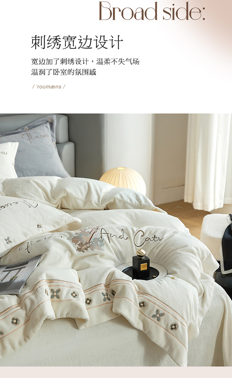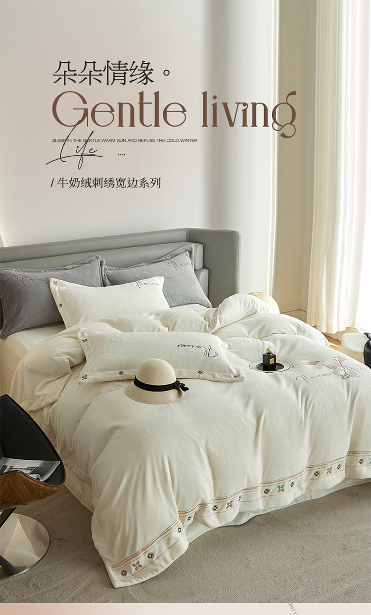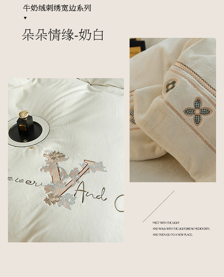 名品优仓 2022新款朵朵情缘系列牛奶绒刺绣宽边系列四件套 朵朵情缘-奶白