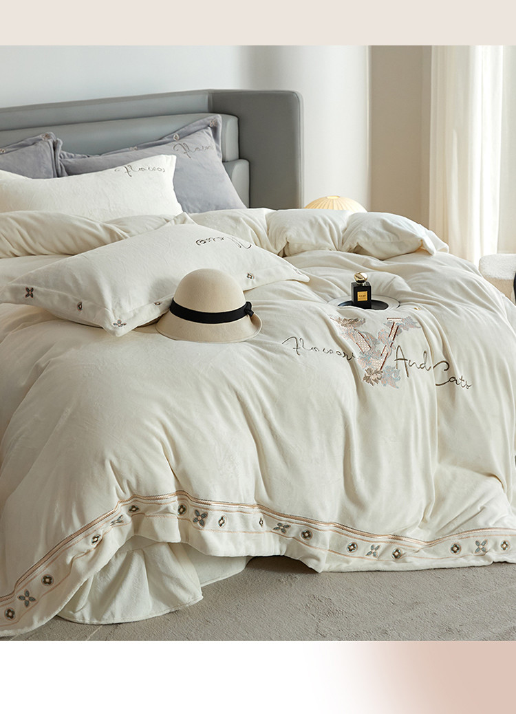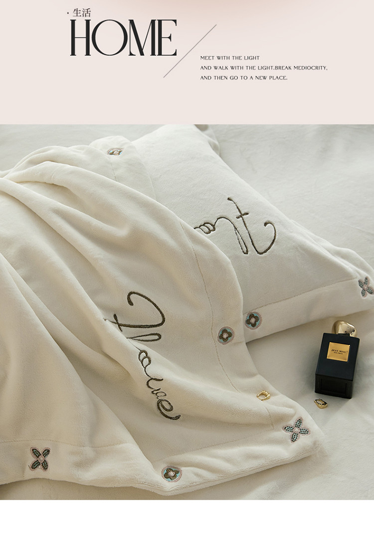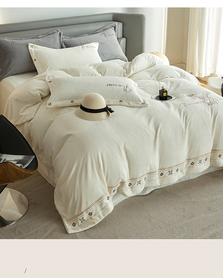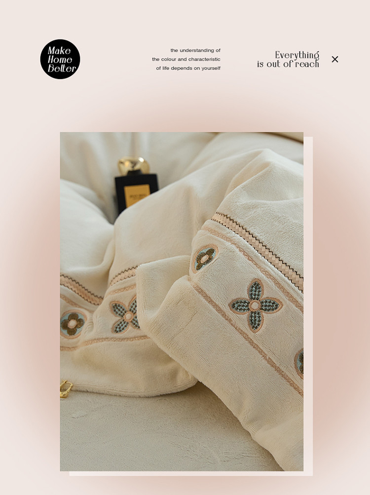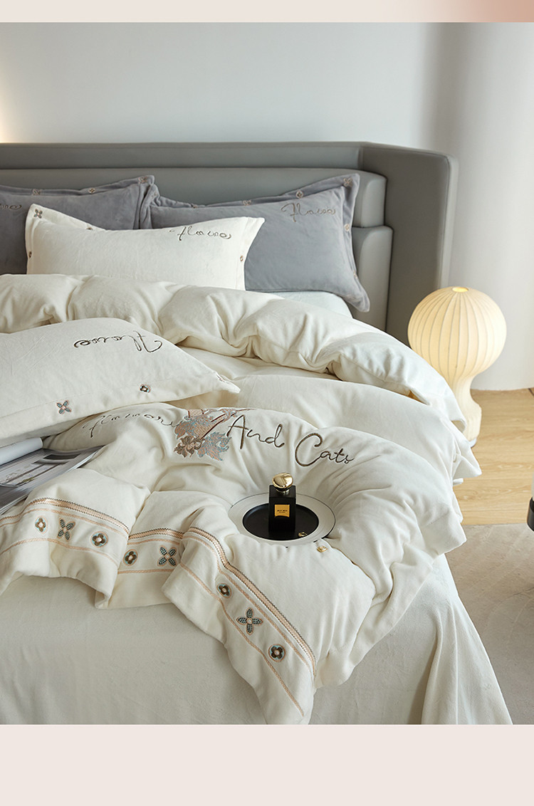 名品优仓 2022新款朵朵情缘系列牛奶绒刺绣宽边系列四件套 朵朵情缘-奶白