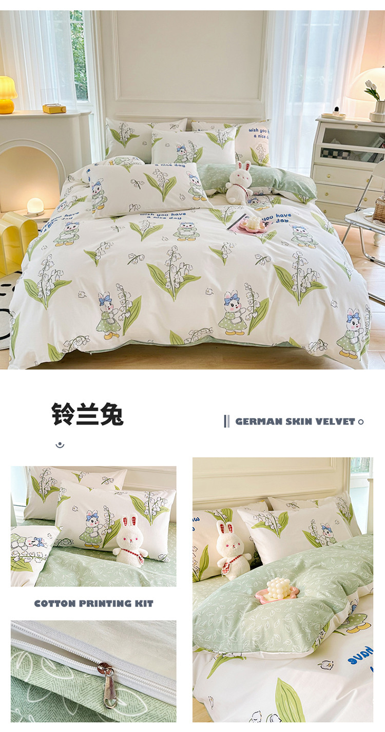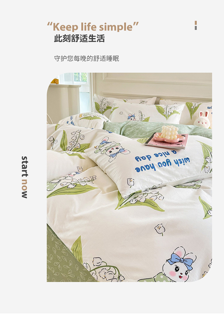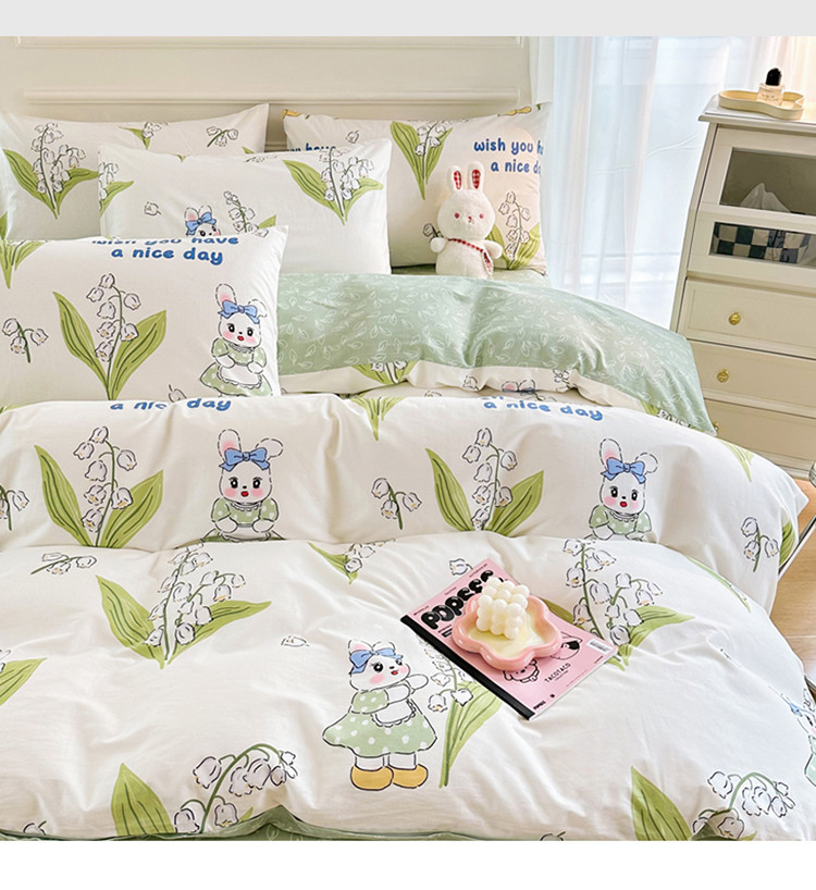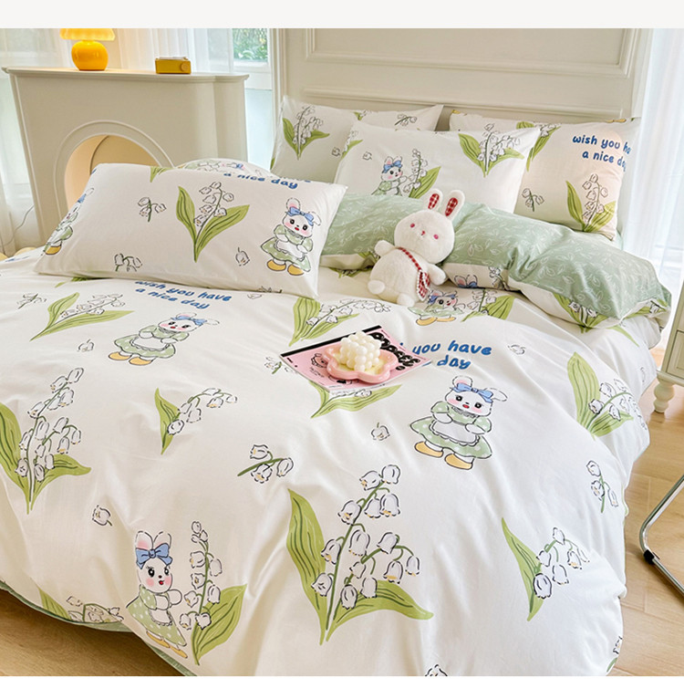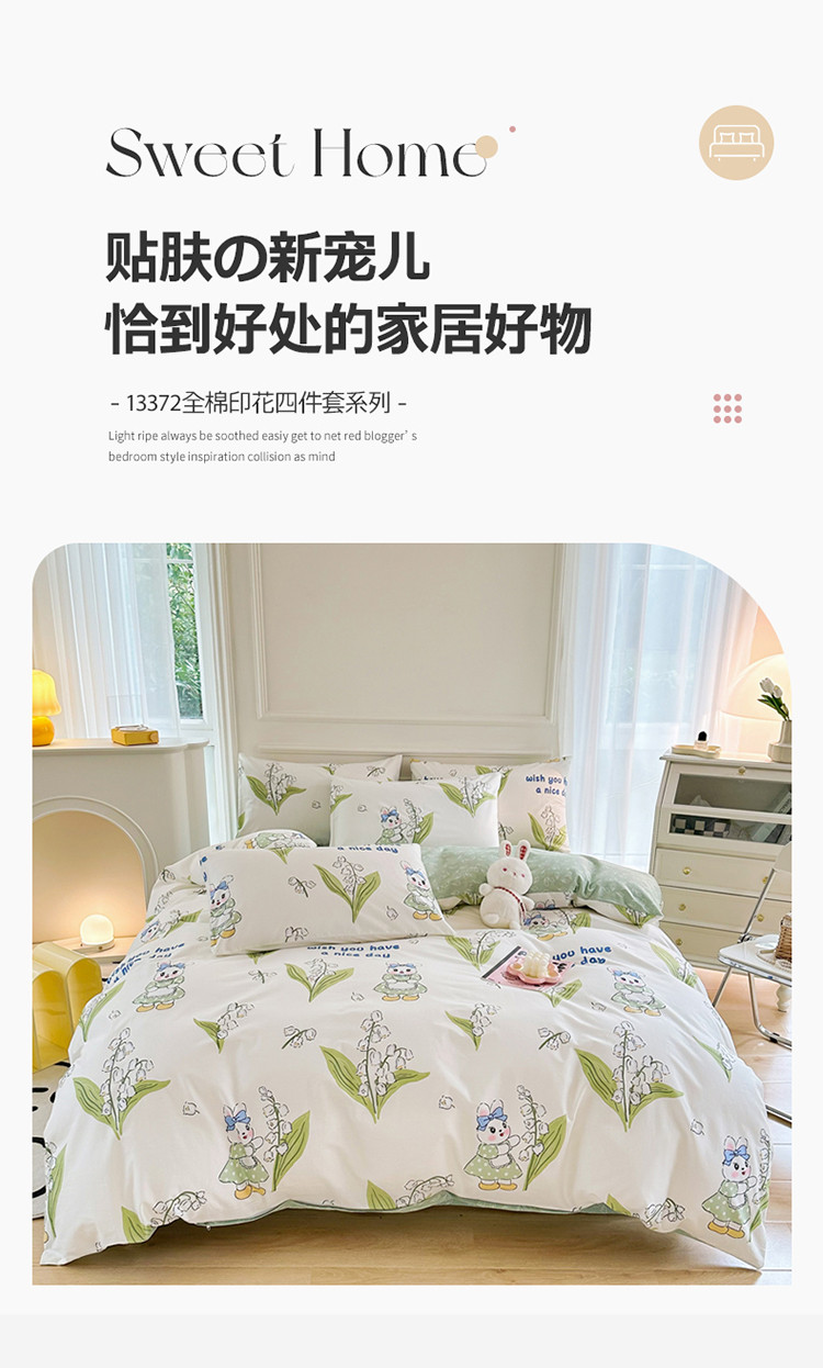 星巴k家纺 2023全棉13372花卉印花简约四件套铃兰兔