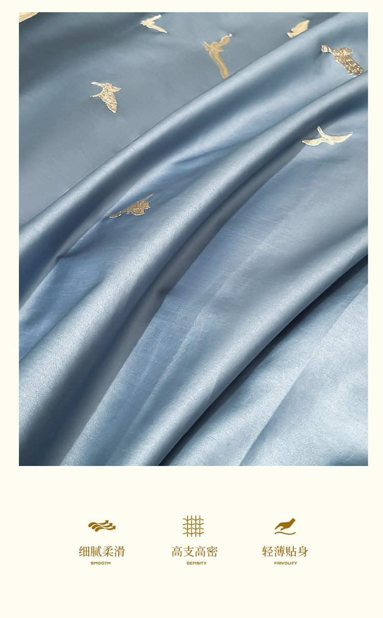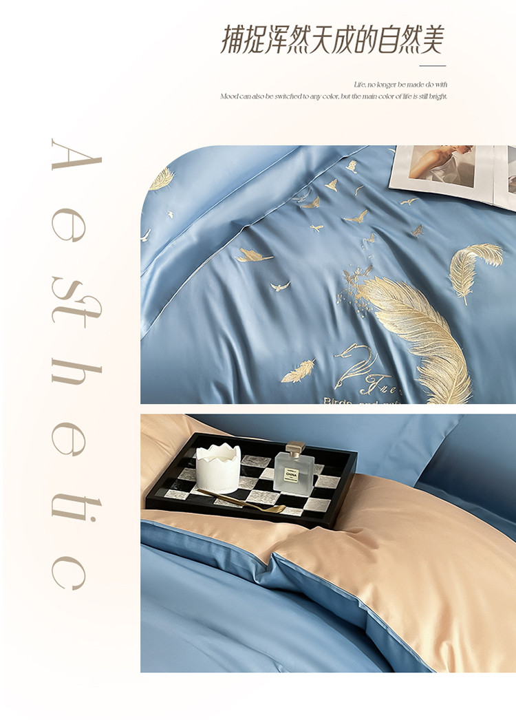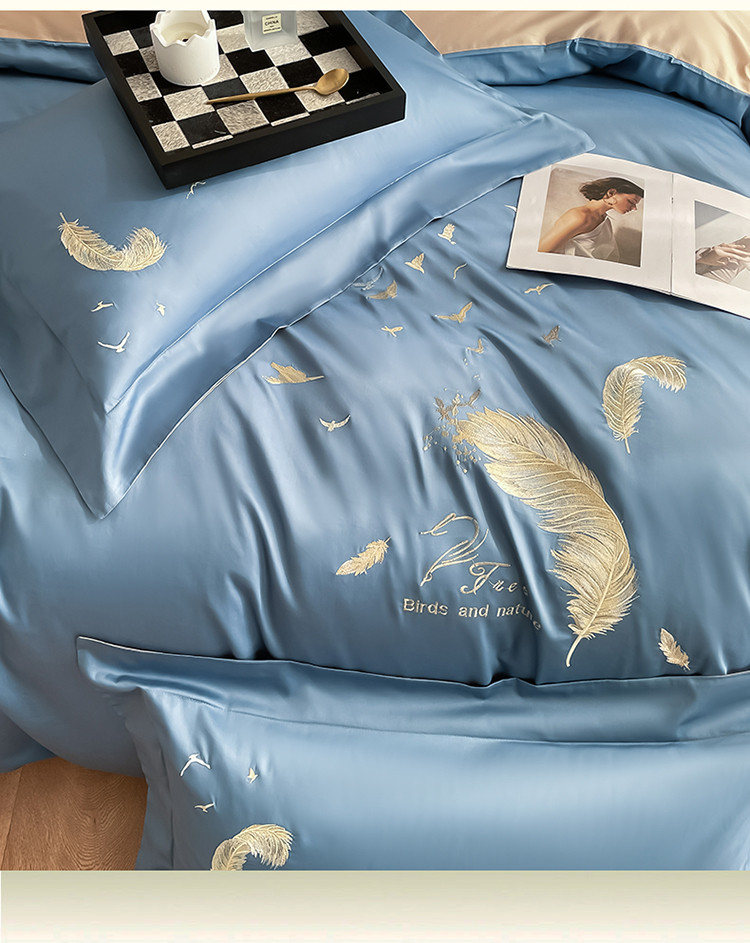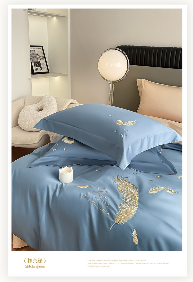 商品名称:蓝米卡夫2024新全棉高级感长绒棉刺绣四件套兰羽系列 兰羽-宾蓝奶茶