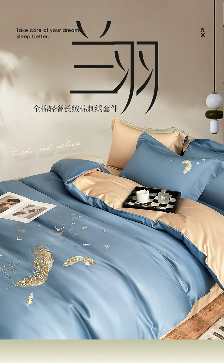 蓝米卡夫2024新全棉高级感长绒棉刺绣四件套兰羽系列 兰羽-宾蓝奶茶