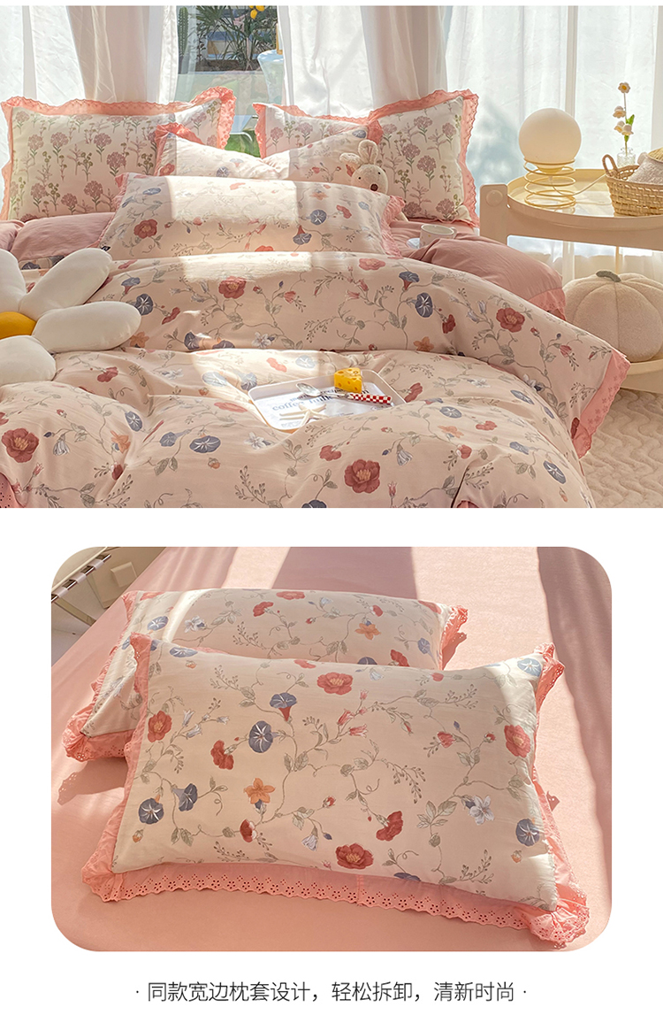 艾米家居 2025新款韩版双层花边轻奢浮雕系列水洗冰丝四件套 豆沙花边,豆沙花边