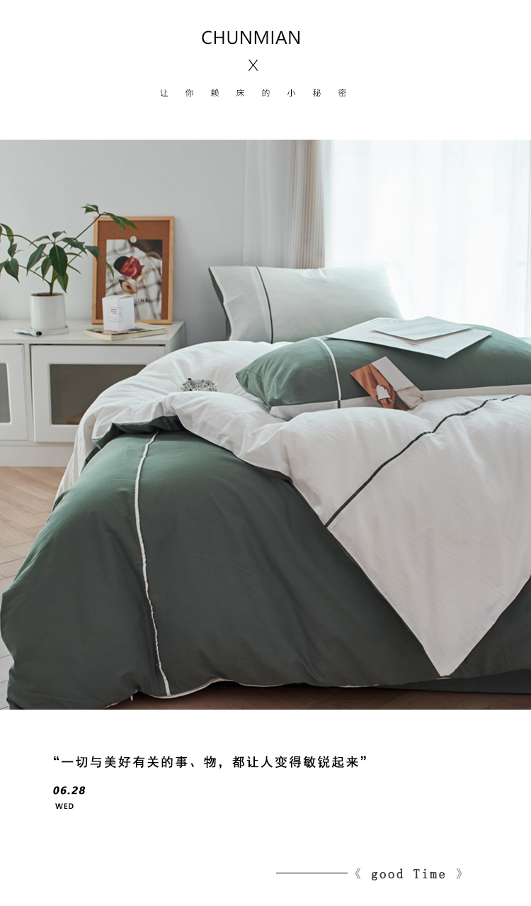 商品名称:纯棉水洗棉四件套纯色简约全棉被套工艺款床单床笠学生直播爆款 嵌线-绿柠