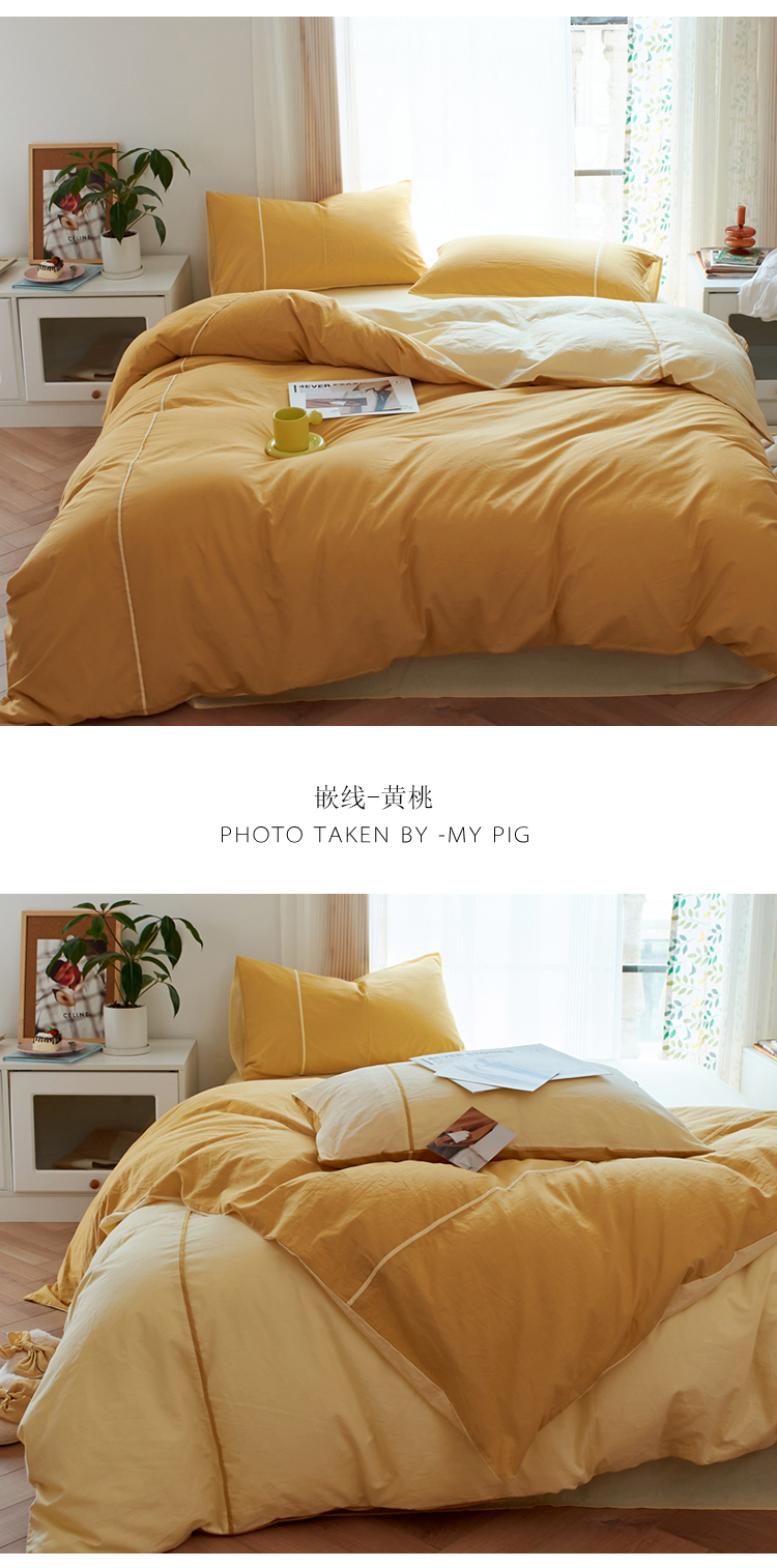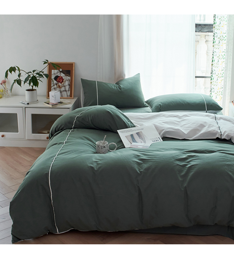纯棉水洗棉四件套纯色简约全棉被套工艺款床单床笠学生直播爆款 嵌线-绿柠