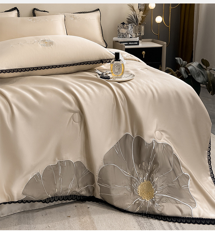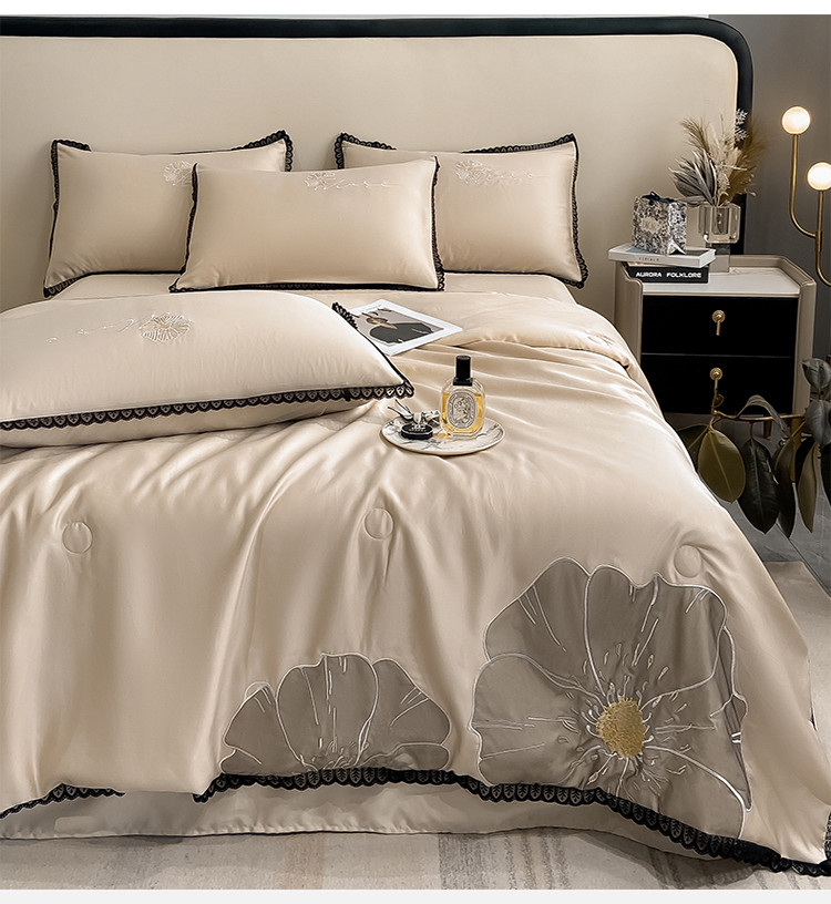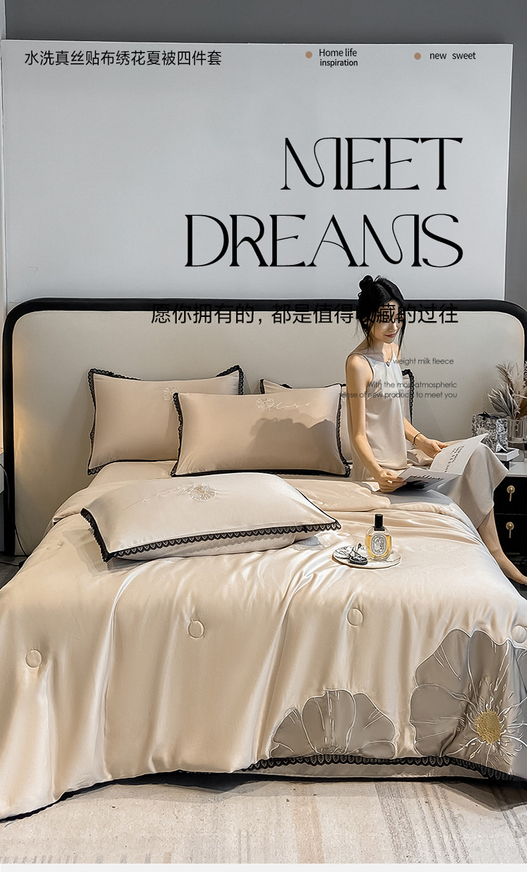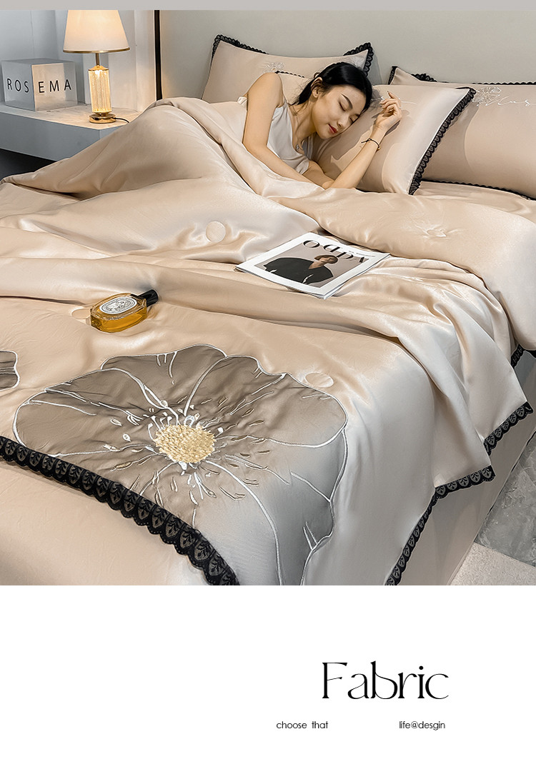 当前位置: 91家纺网 > 商品网购 > 床品套件 > 四件套 > 夏被四件套 > 2024子由家居水洗真丝贴布绣花花边夏被四件套 太阳花-杏咖