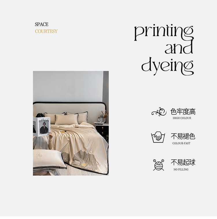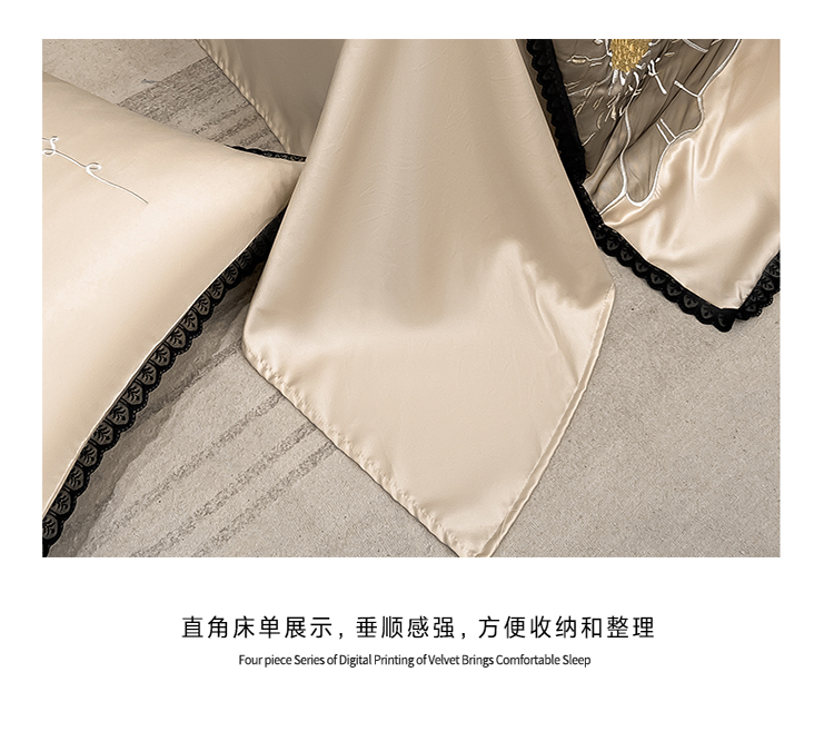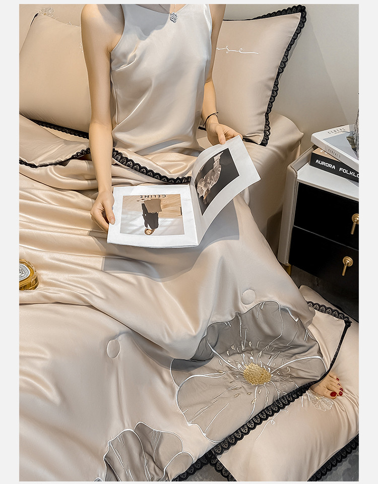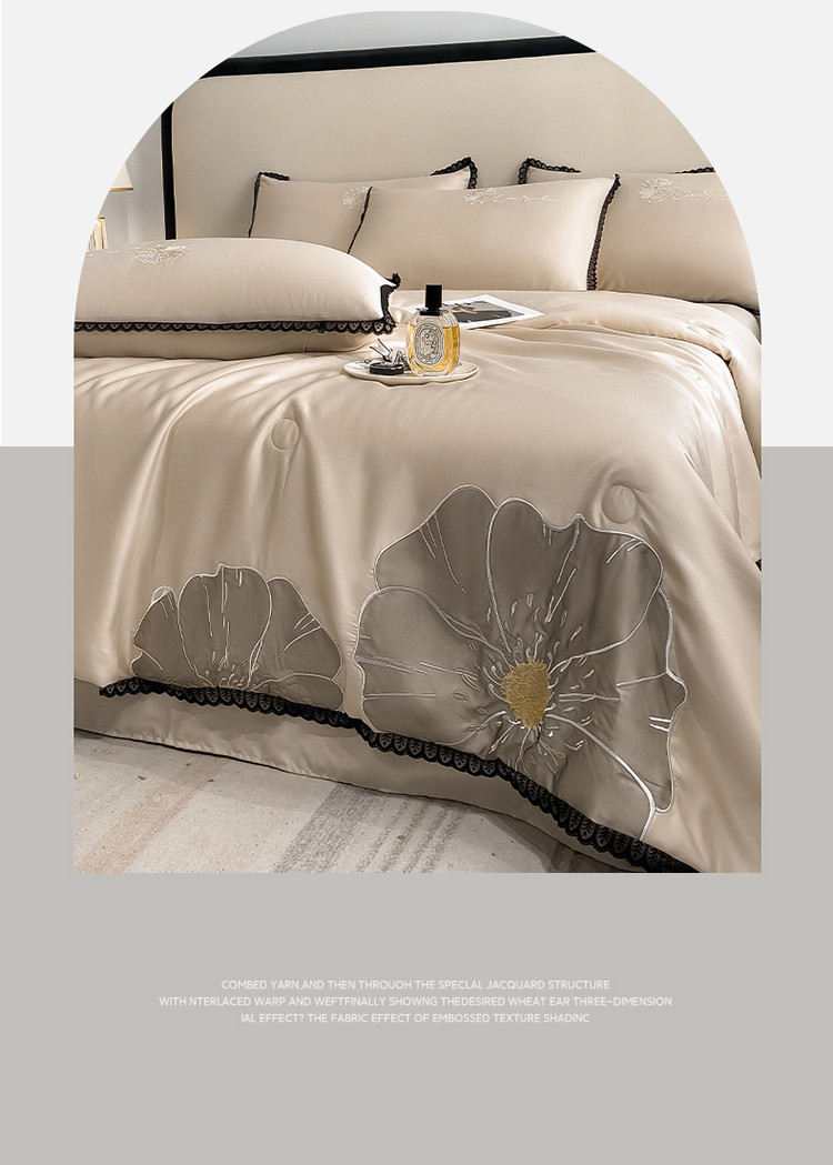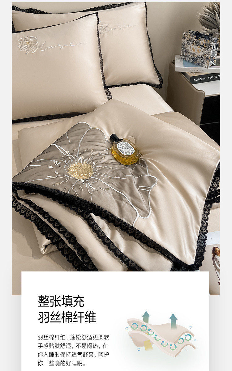 当前位置: 91家纺网 > 商品网购 > 床品套件 > 四件套 > 夏被四件套 > 2024子由家居水洗真丝贴布绣花花边夏被四件套 太阳花-杏咖