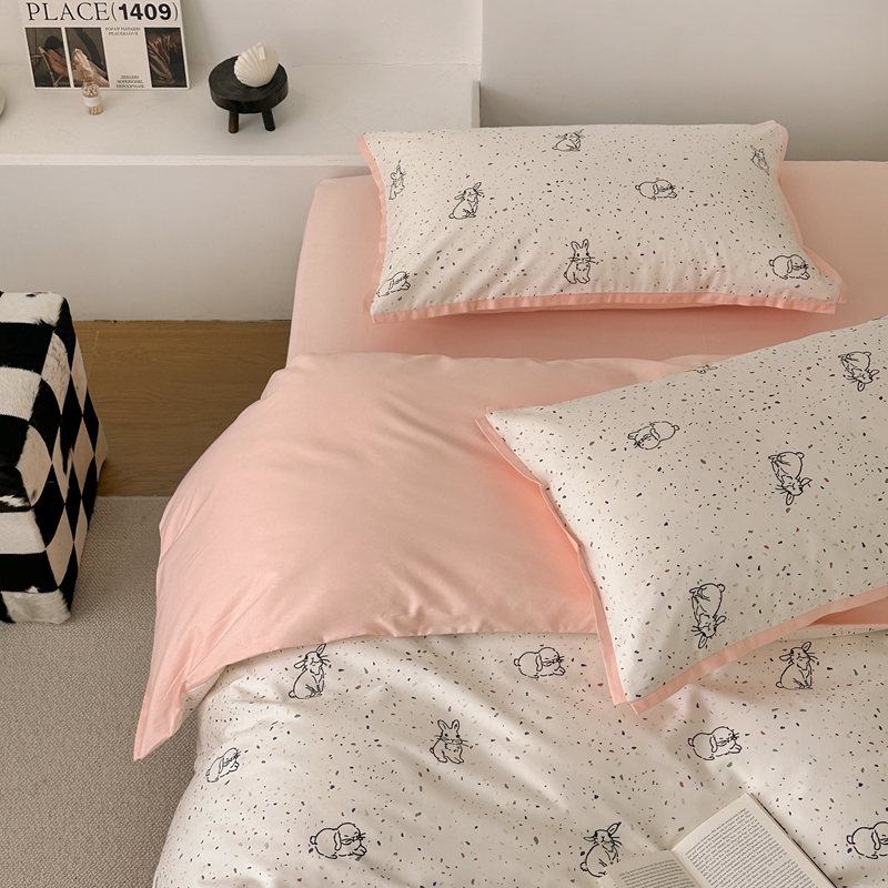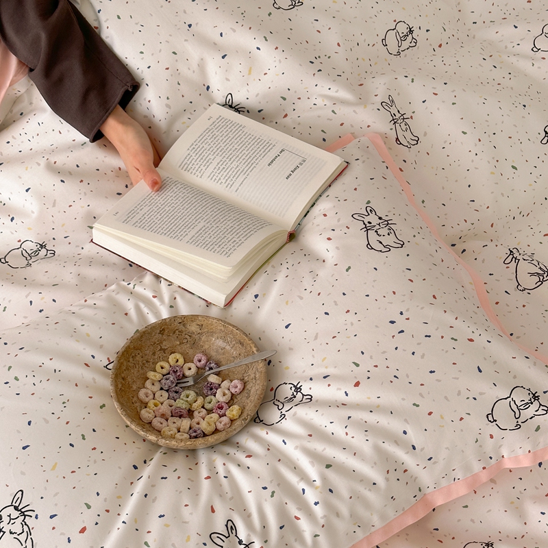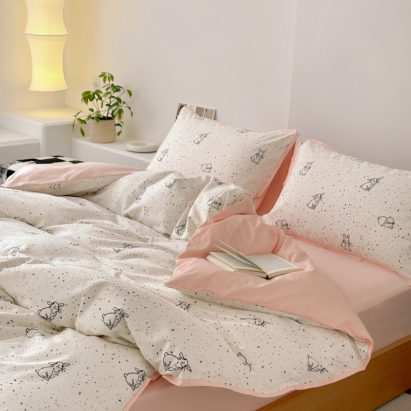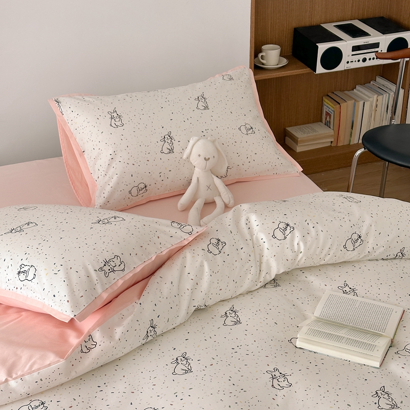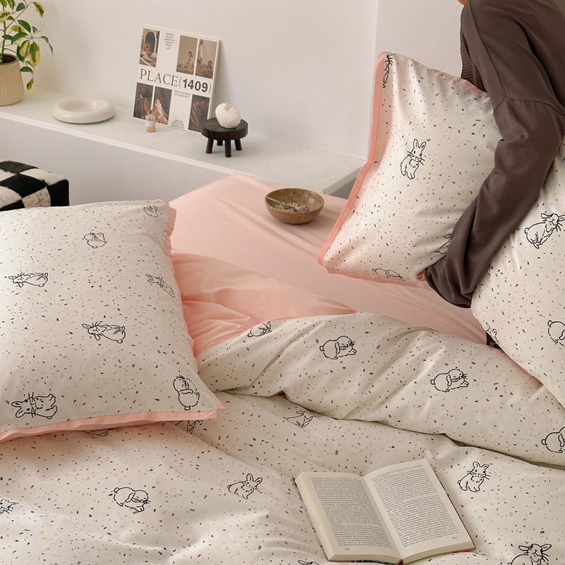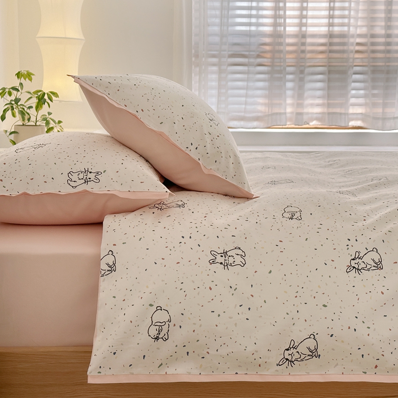当前位置: 91家纺网 > 商品网购 > 床品套件 > 四件套 > 全棉普通四件套 > 蕊姿 50sA类数码印花四件套 彩点小兔粉色