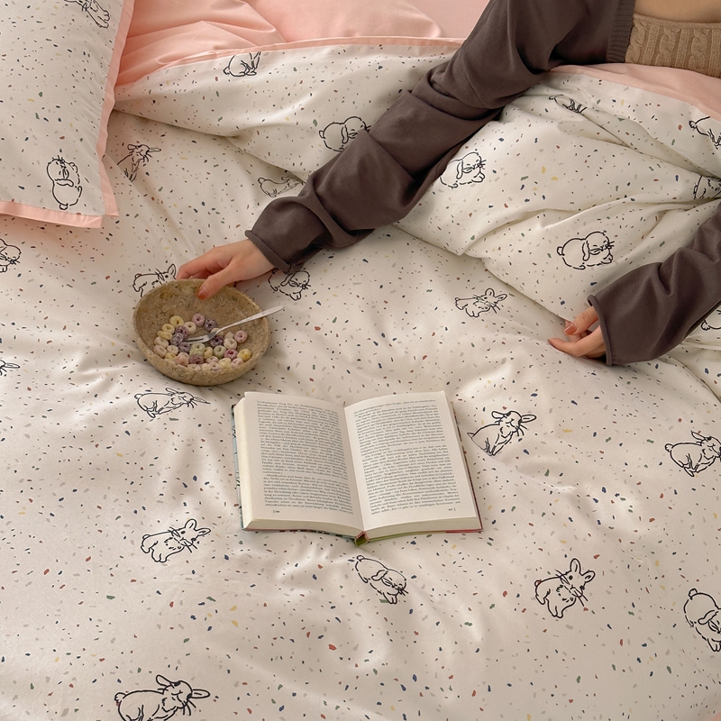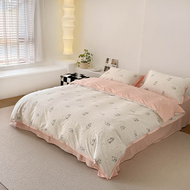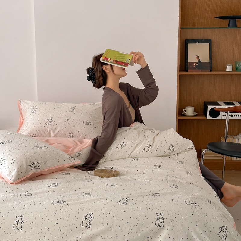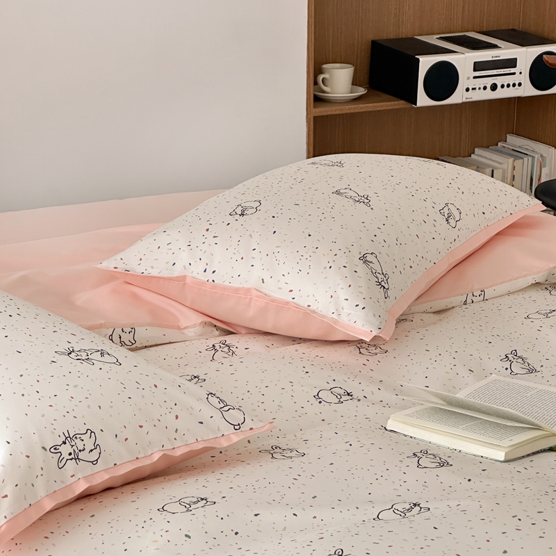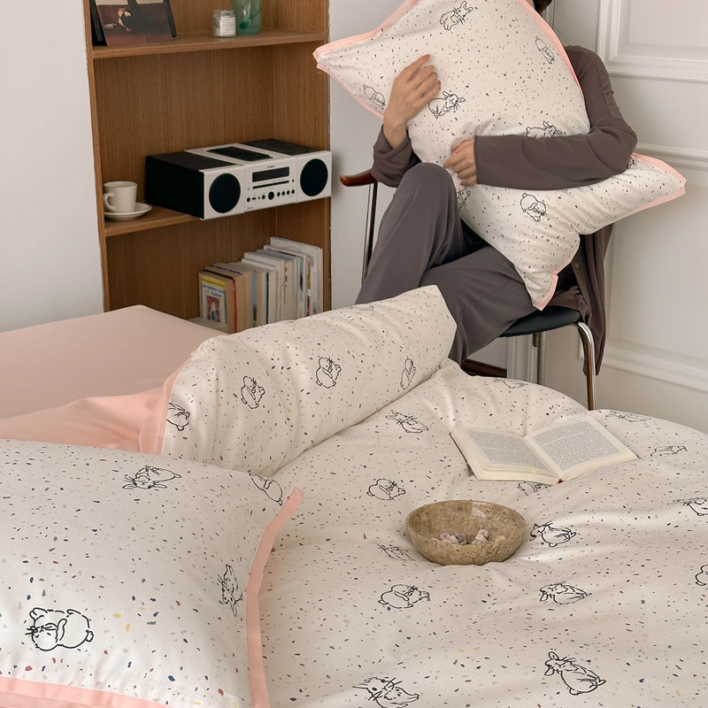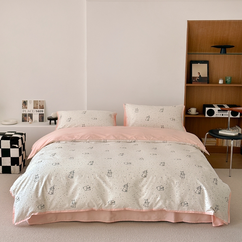 当前位置: 91家纺网 > 商品网购 > 床品套件 > 四件套 > 全棉普通四件套 > 蕊姿 50sA类数码印花四件套 彩点小兔粉色