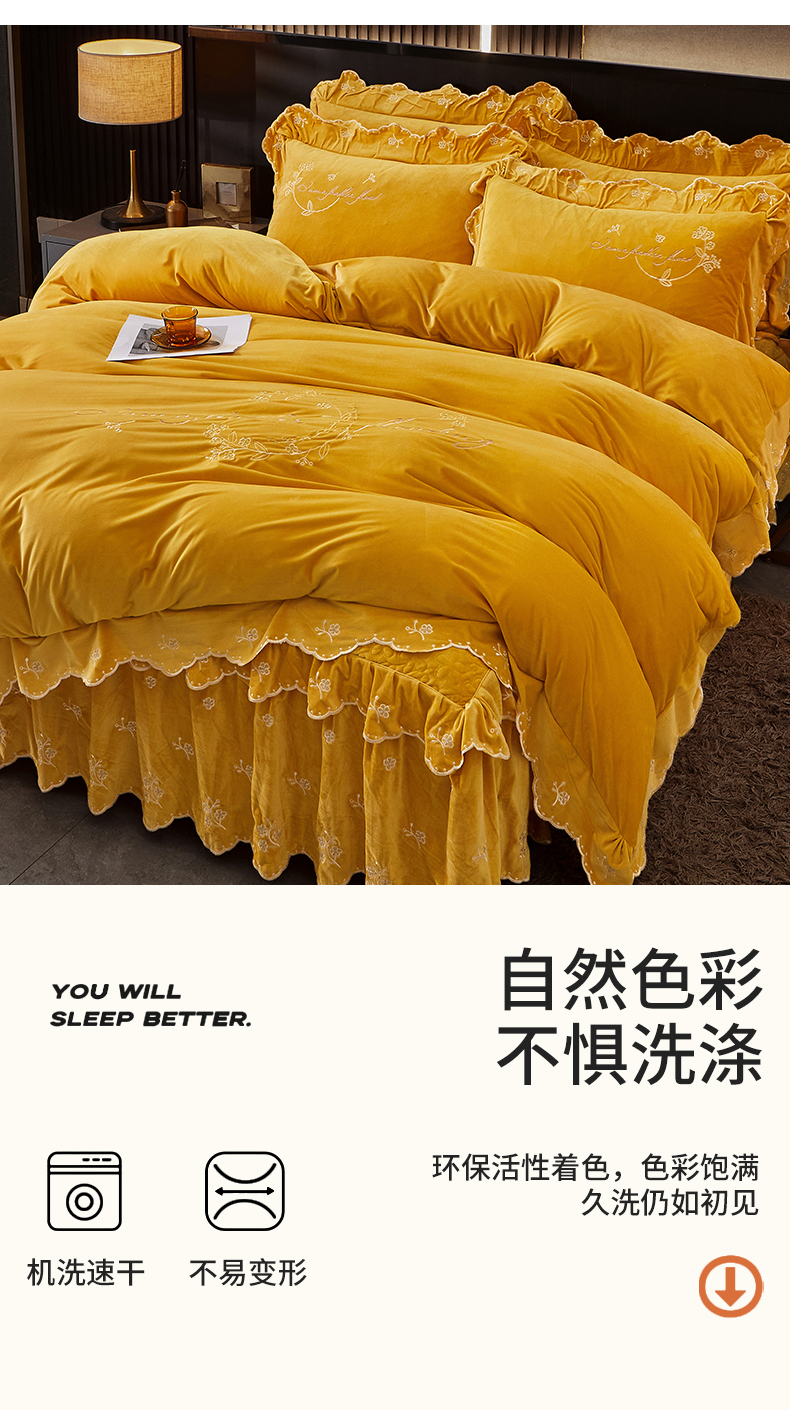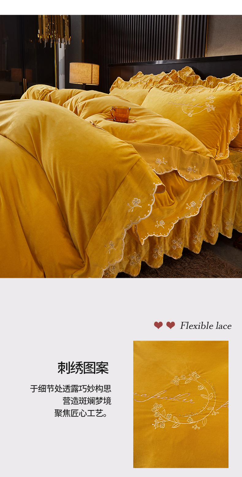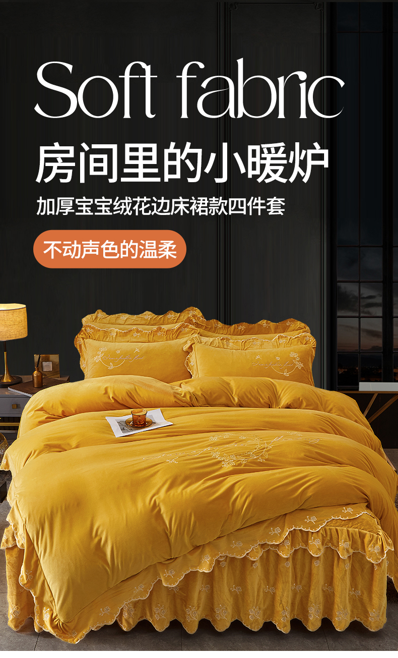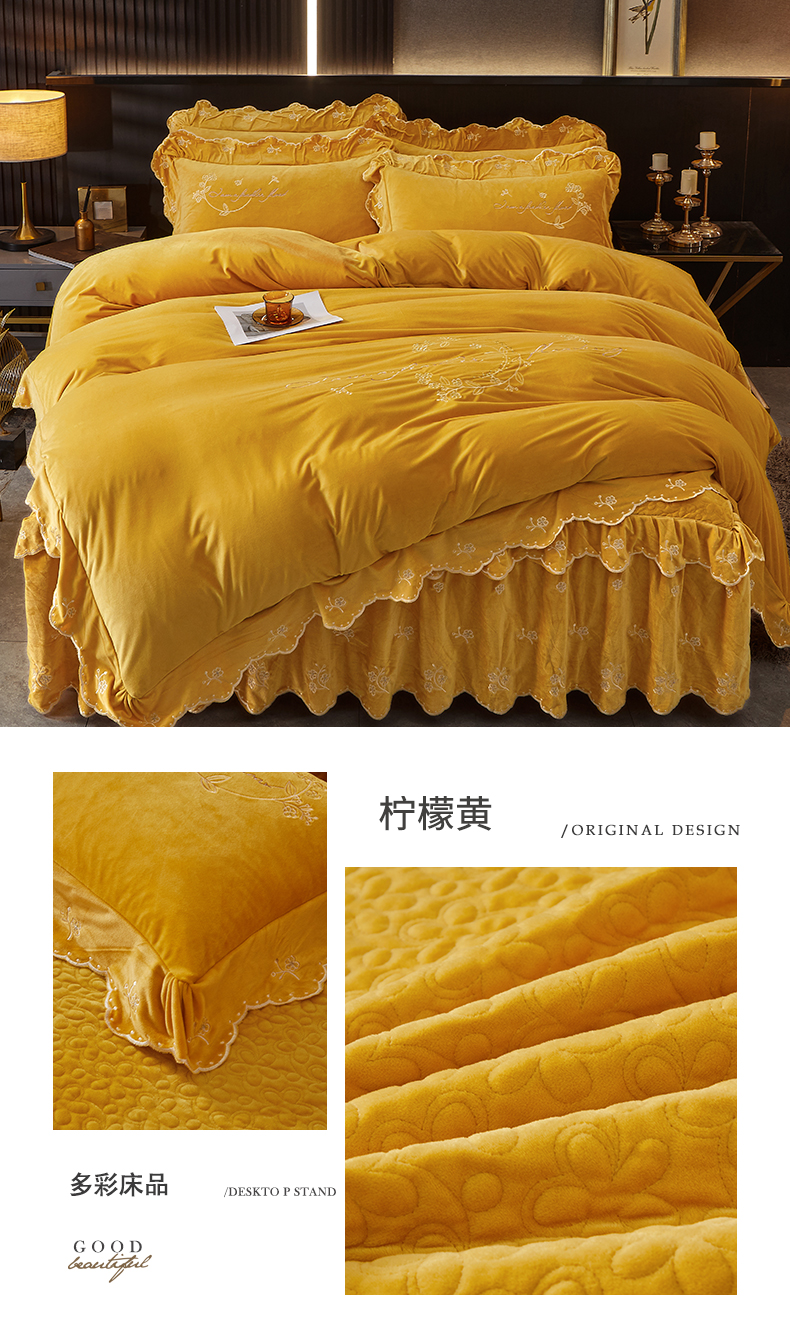 当前位置: 91家纺网 > 商品网购 > 床品套件 > 四件套 > 宝宝绒四件套 > 2023 恒爱家纺 花好月圆宝宝绒床裙四件套 柠檬黄