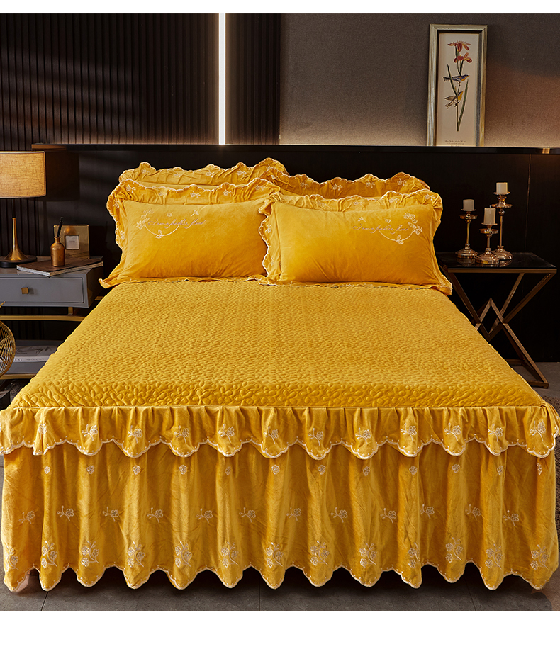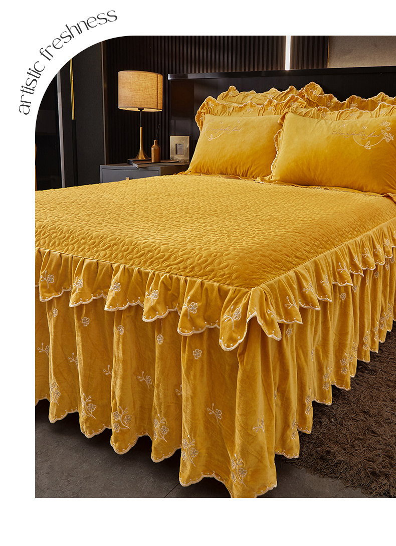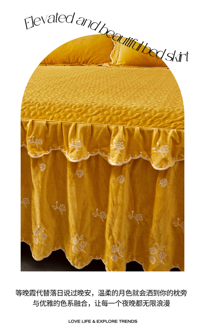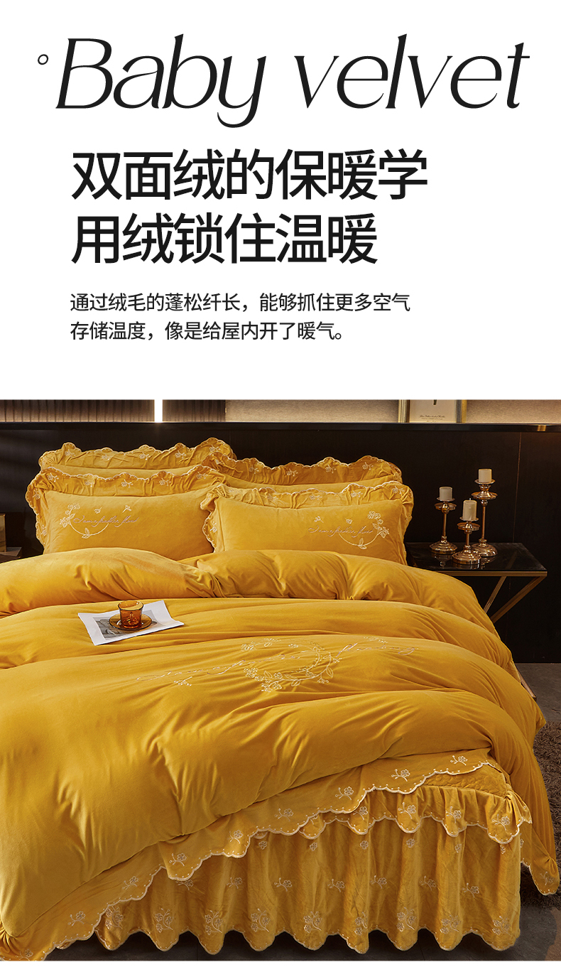 当前位置: 91家纺网 > 商品网购 > 床品套件 > 四件套 > 宝宝绒四件套 > 2023 恒爱家纺 花好月圆宝宝绒床裙四件套 柠檬黄