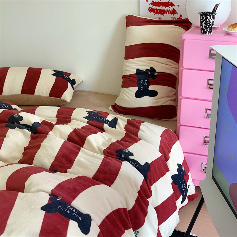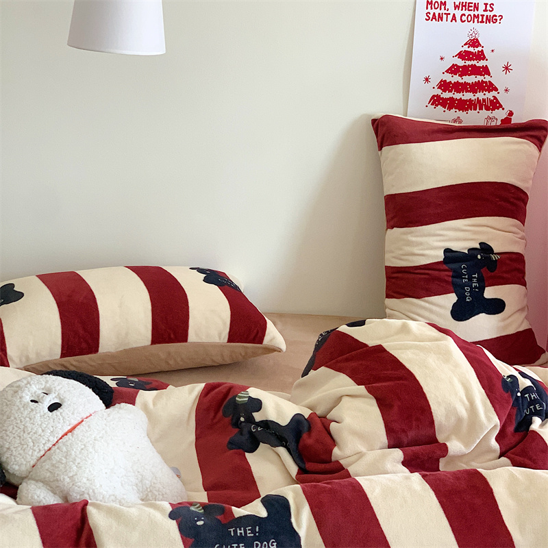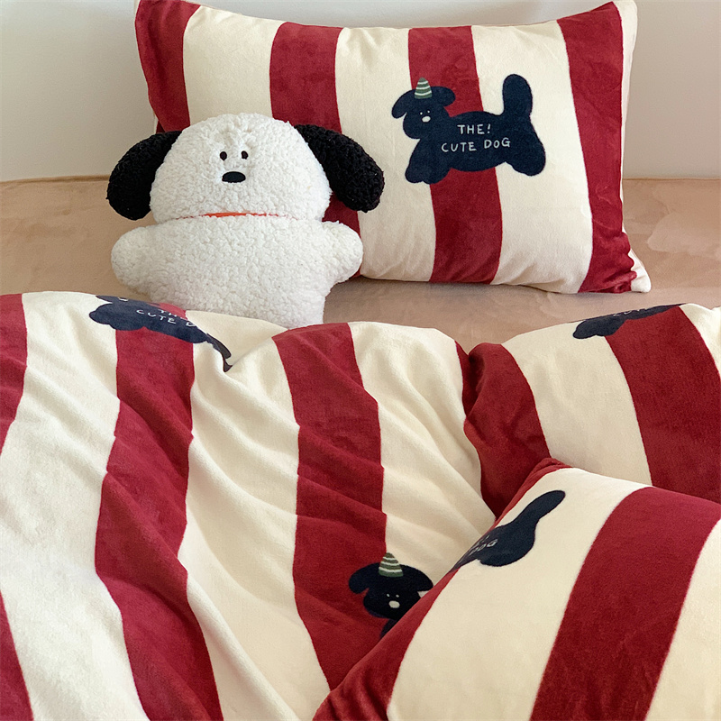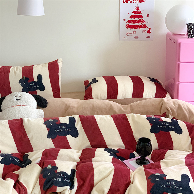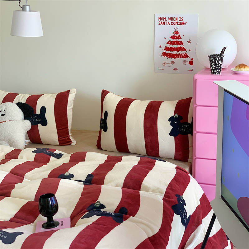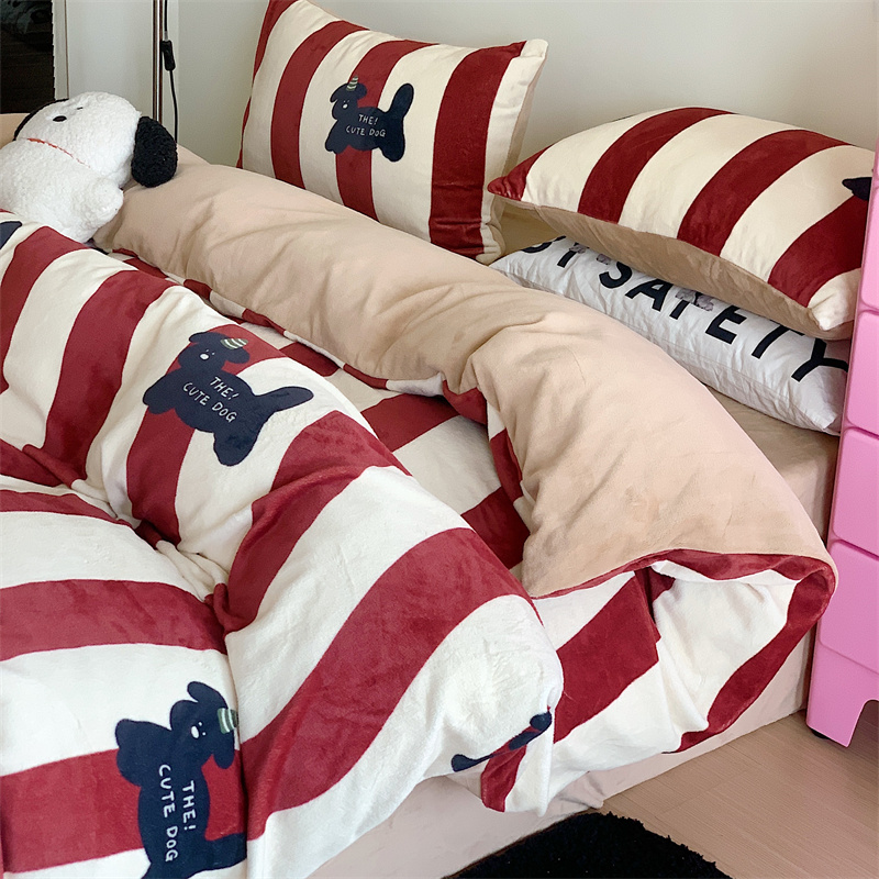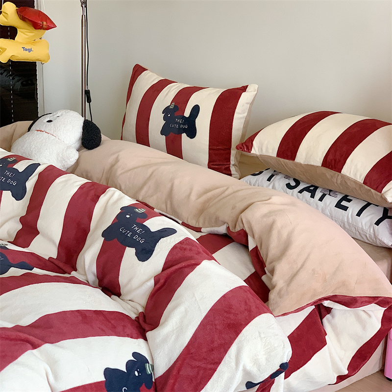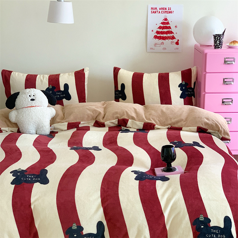 商品名称:星期八 2023新款210g双面牛奶绒印花四件套 条纹狗狗红