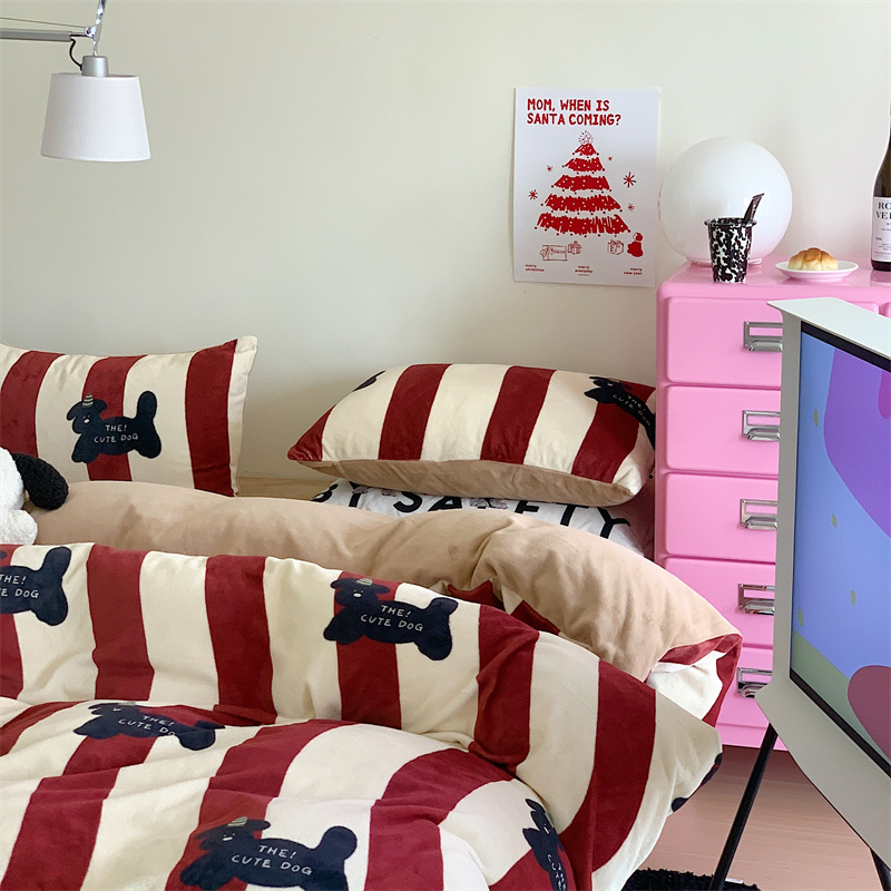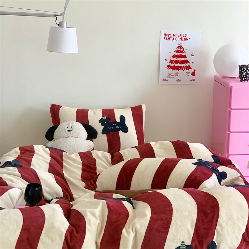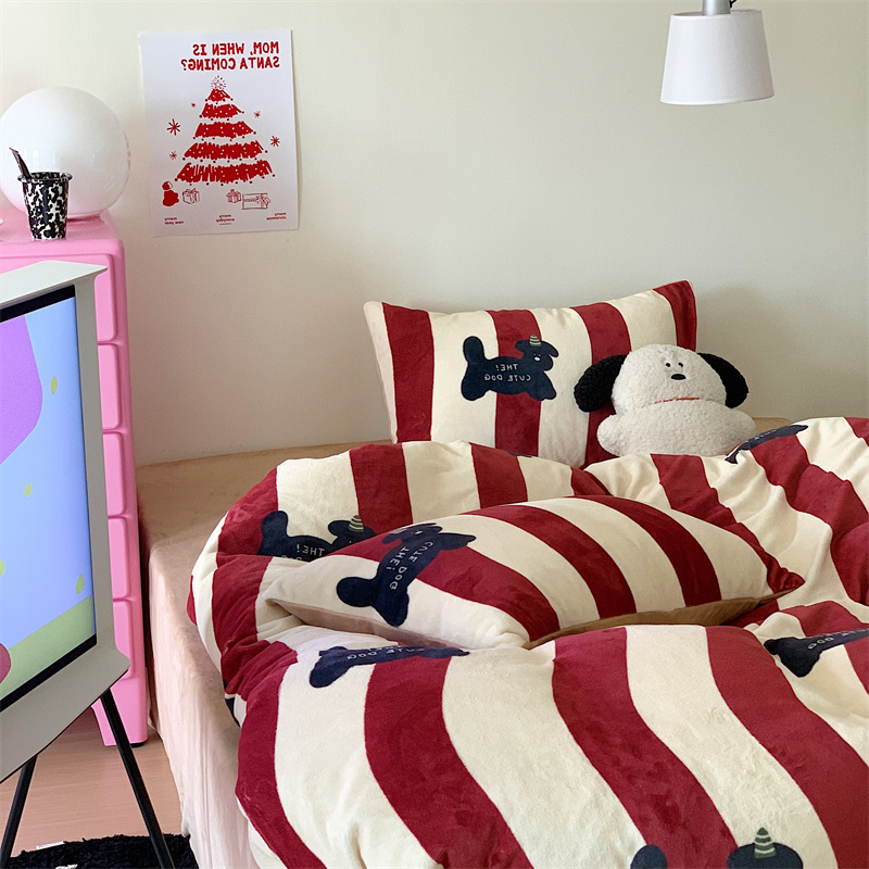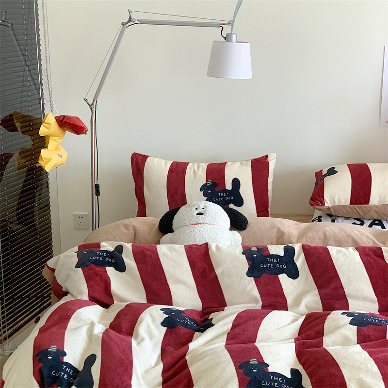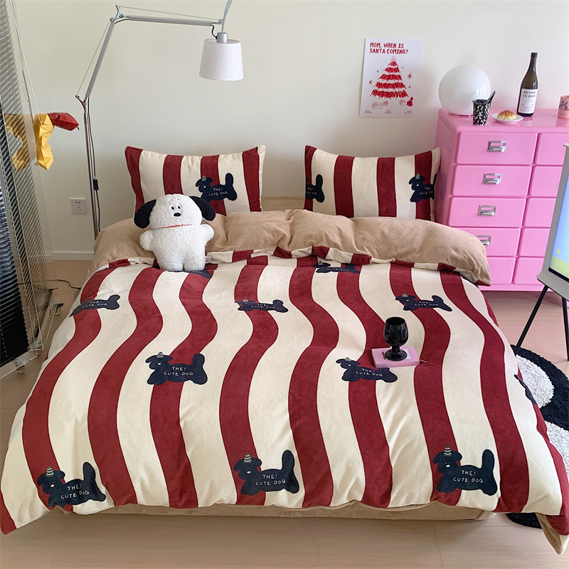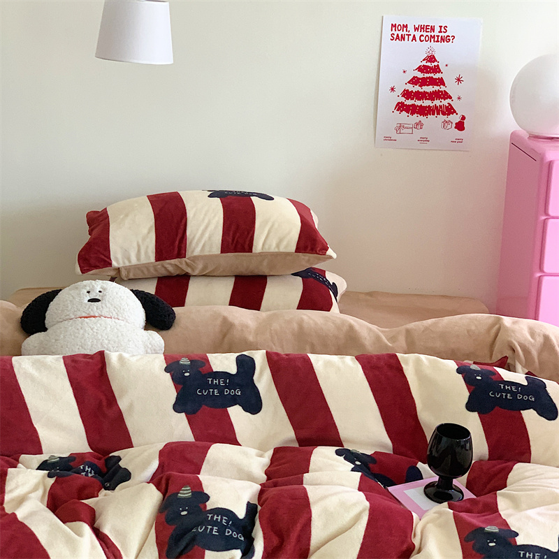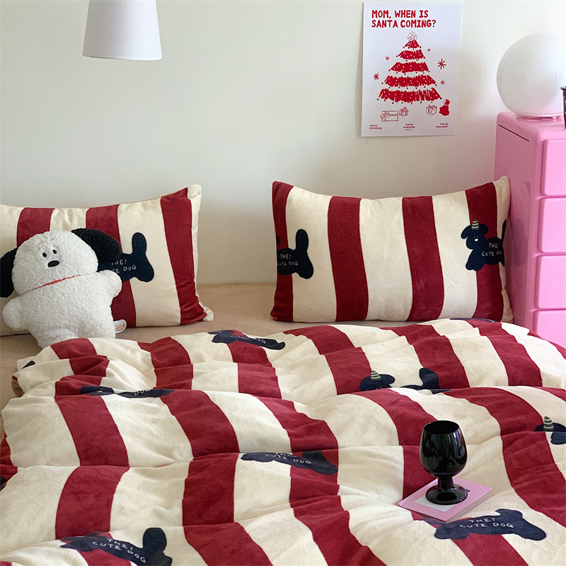 商品名称:星期八 2023新款210g双面牛奶绒印花四件套 条纹狗狗红