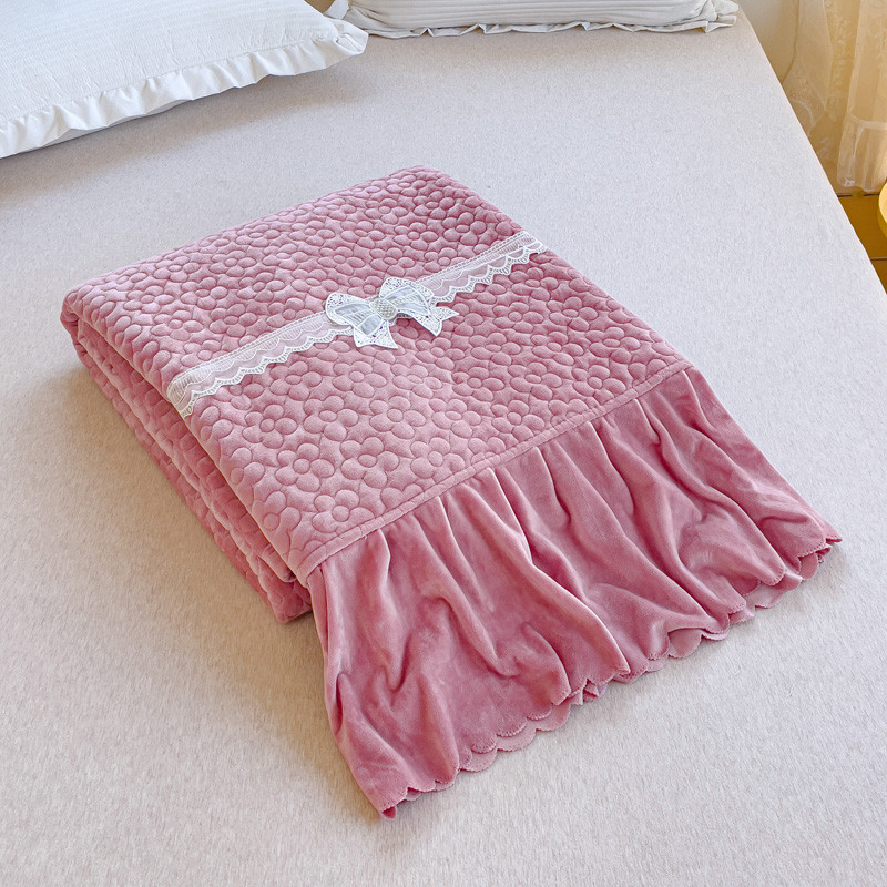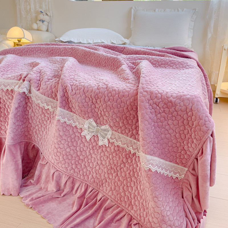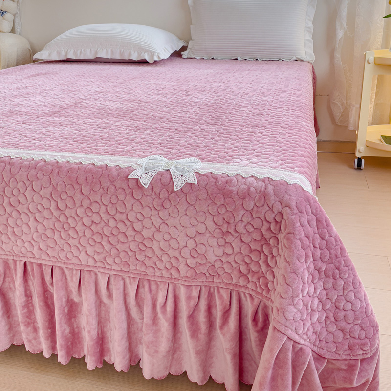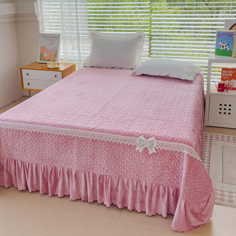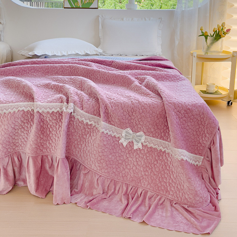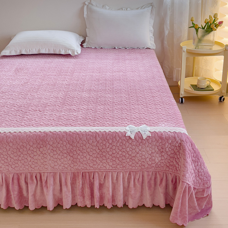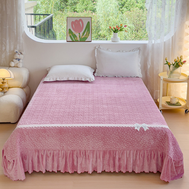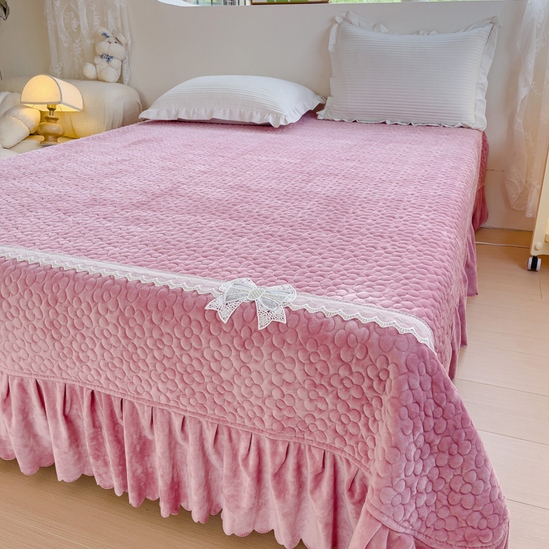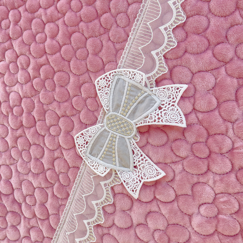2023直播爆款纯色牛奶绒床盖床裙款蕾丝边素色婴儿绒床盖 蝴蝶结-浅粉