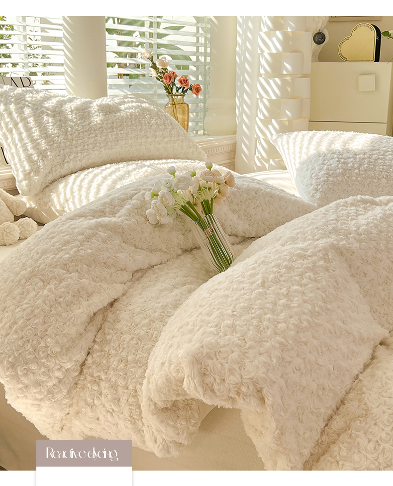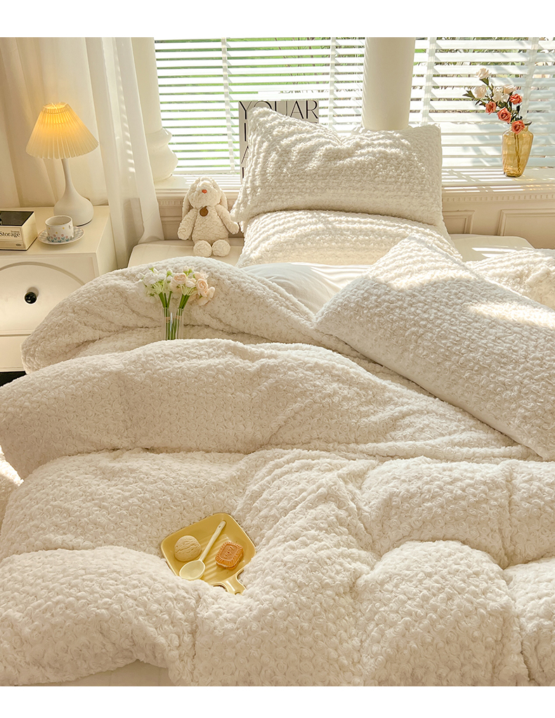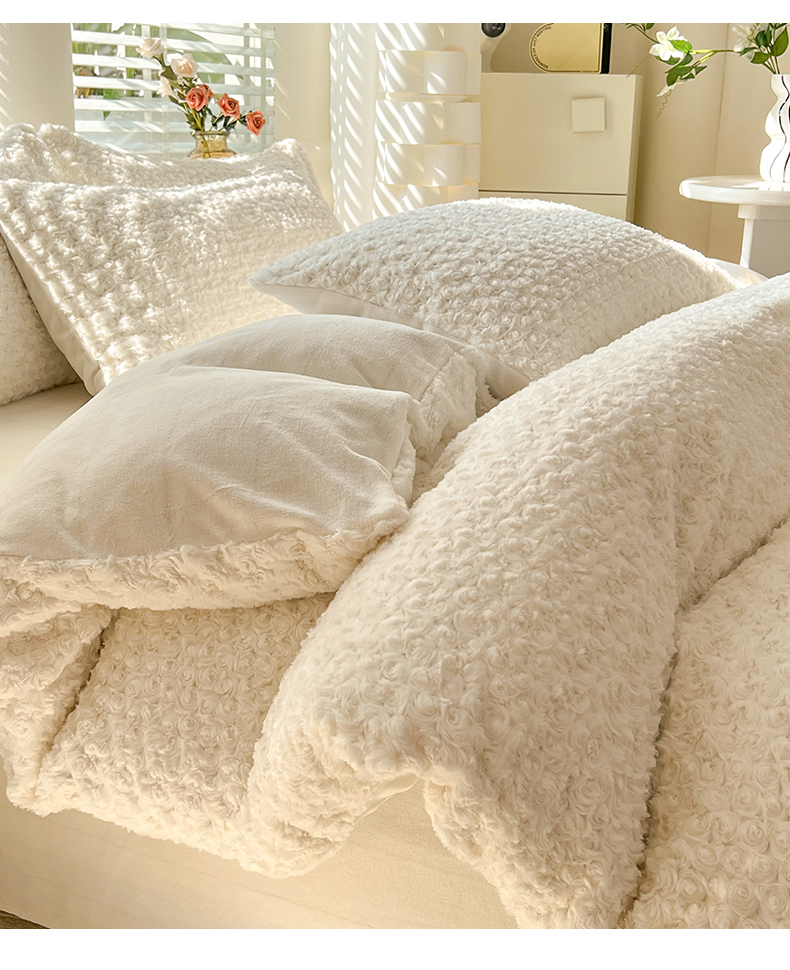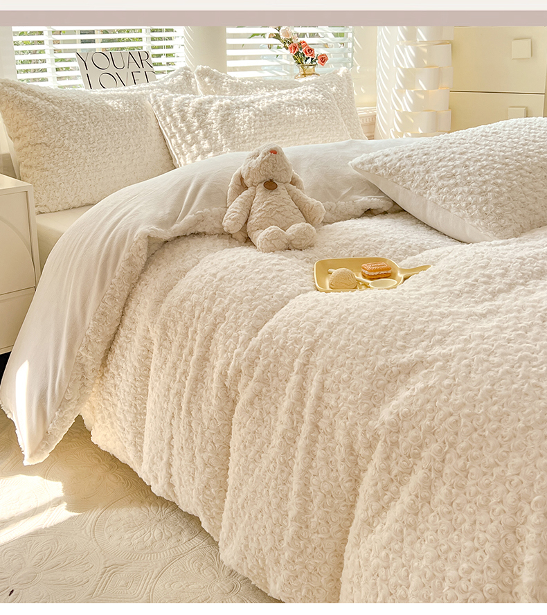 妖妖家纺 2023兔毛四件套-小玫瑰小格子 玫瑰米白