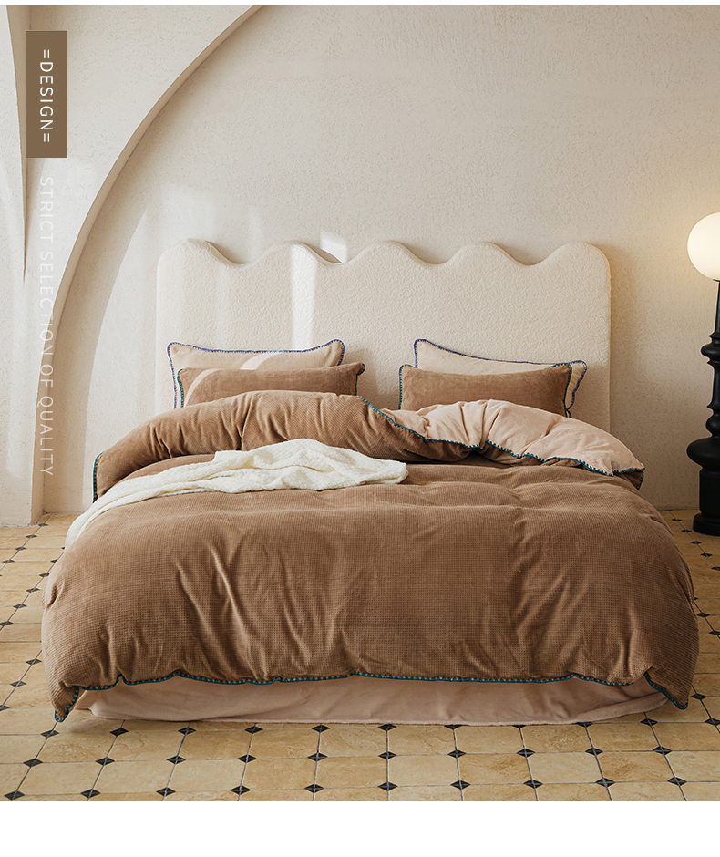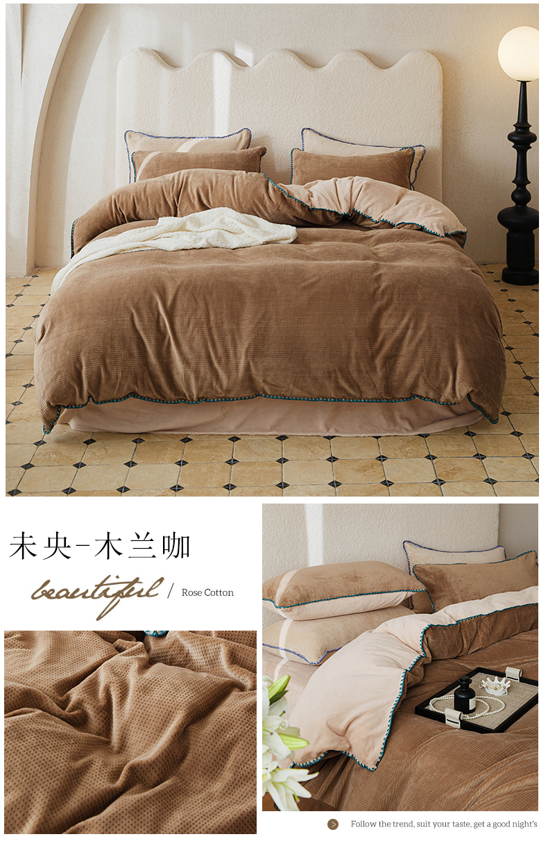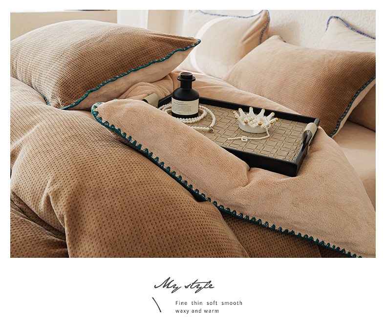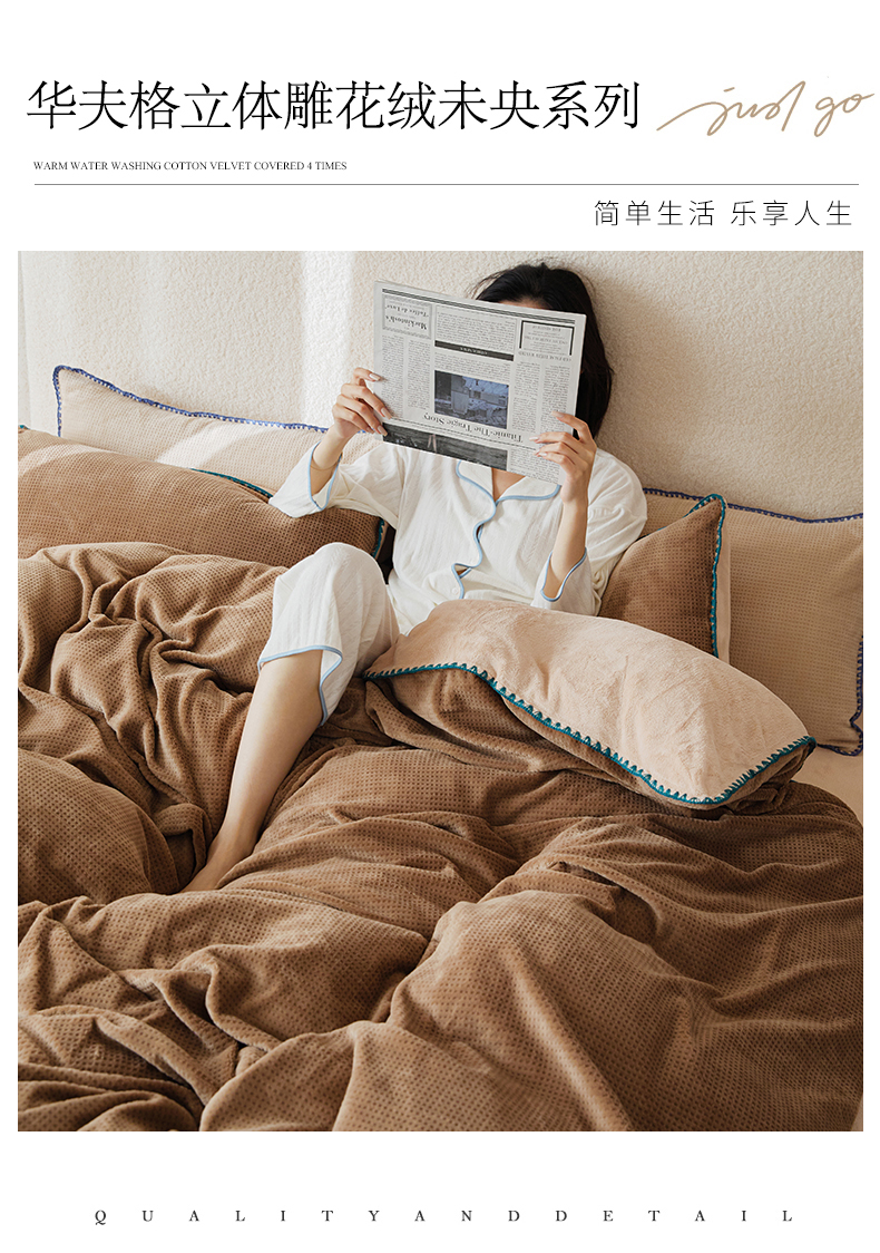 当前位置: 91家纺网 > 商品网购 > 床品套件 > 四件套 > 雕花绒四件套 > 新款华夫格立体雕花绒四件套-未央系列 未央-木兰咖