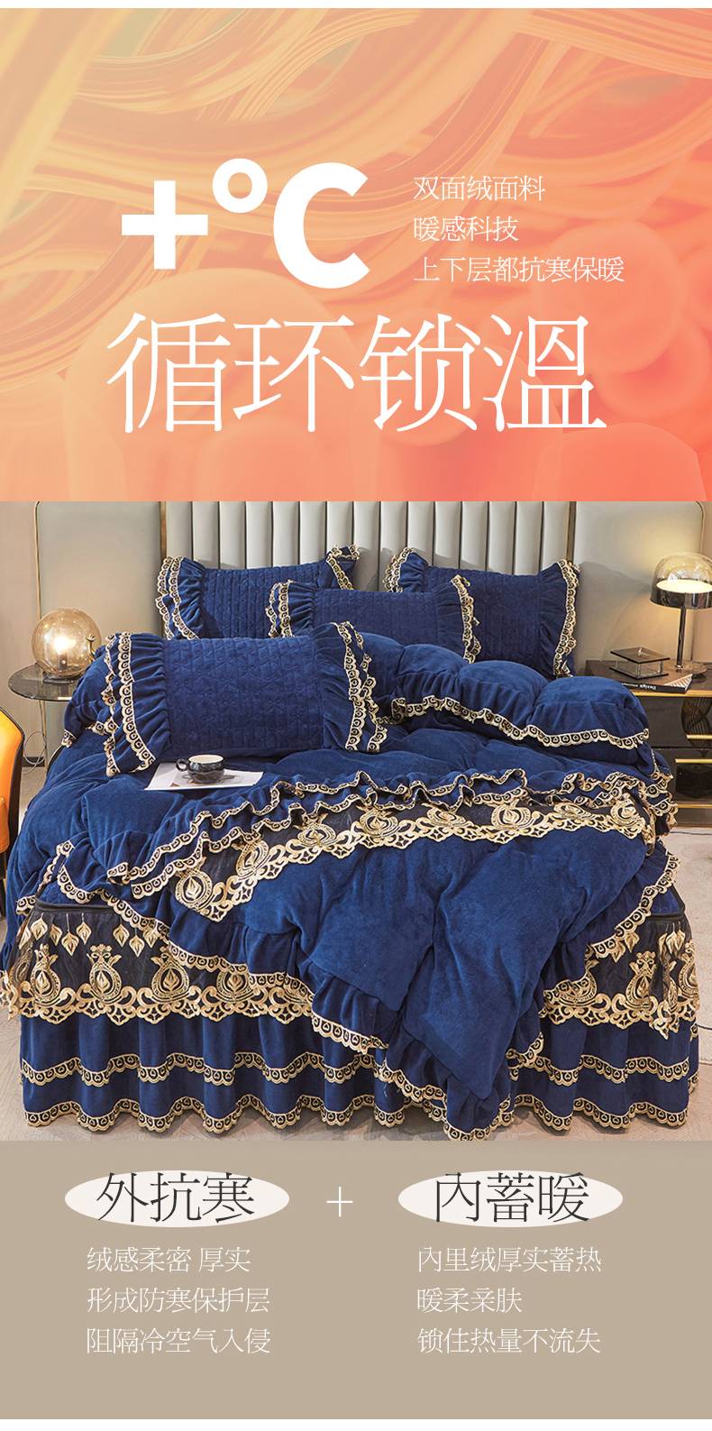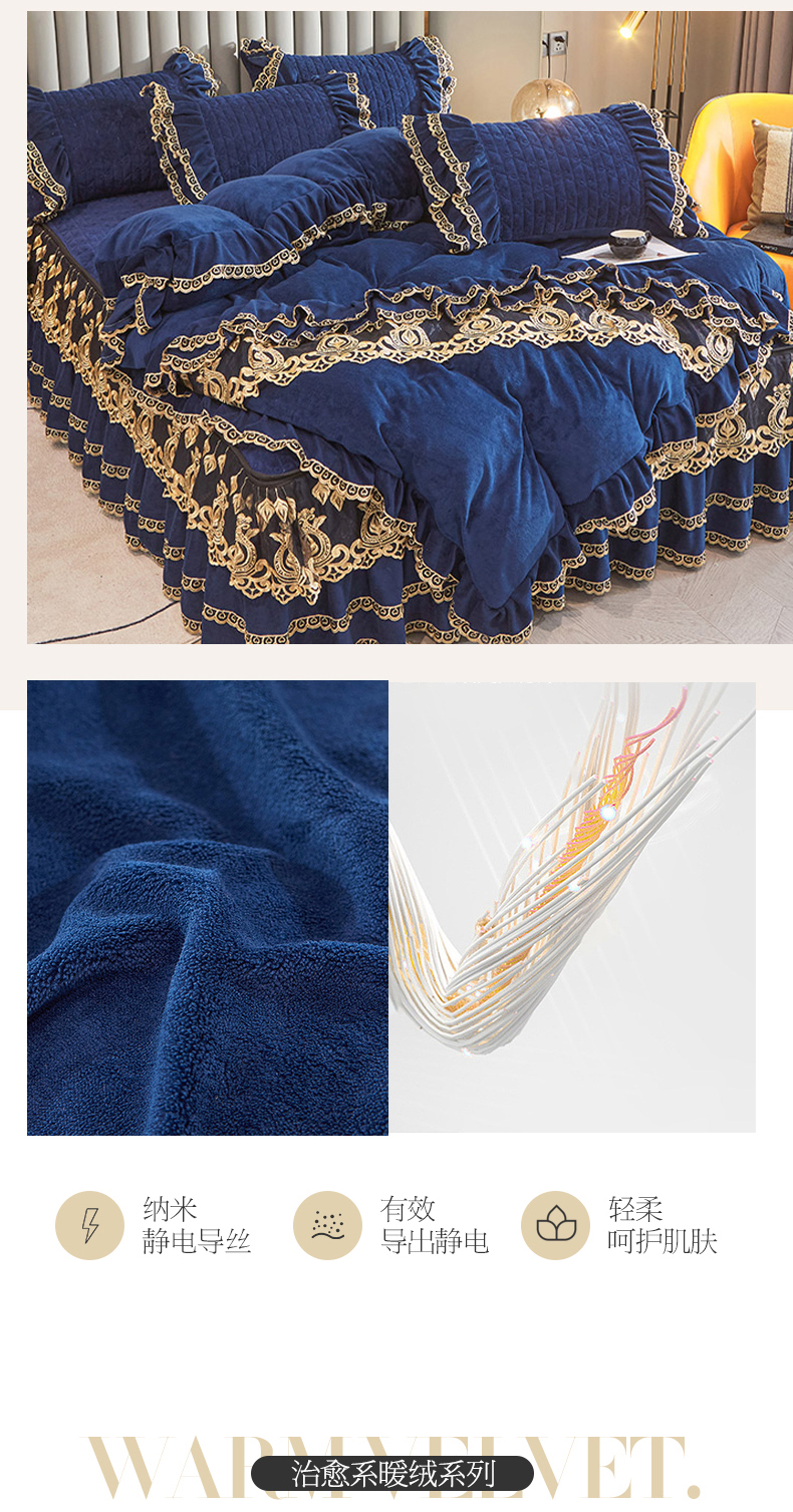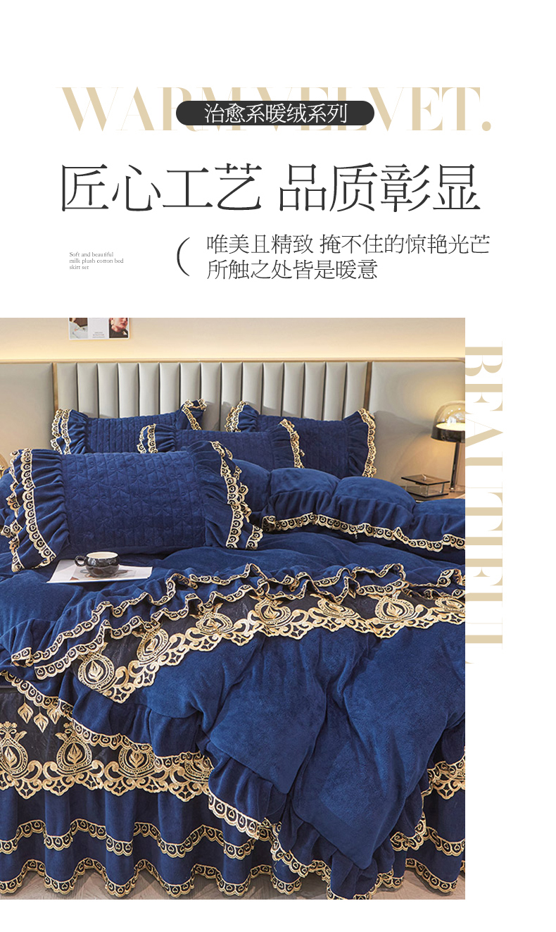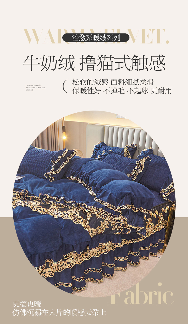 • 91家纺网 家纺一手货源 找家纺 虹星家纺 2023新款牛奶绒夹棉蕾丝可拆卸床裙系列四件套 梦幻巴黎 宝蓝