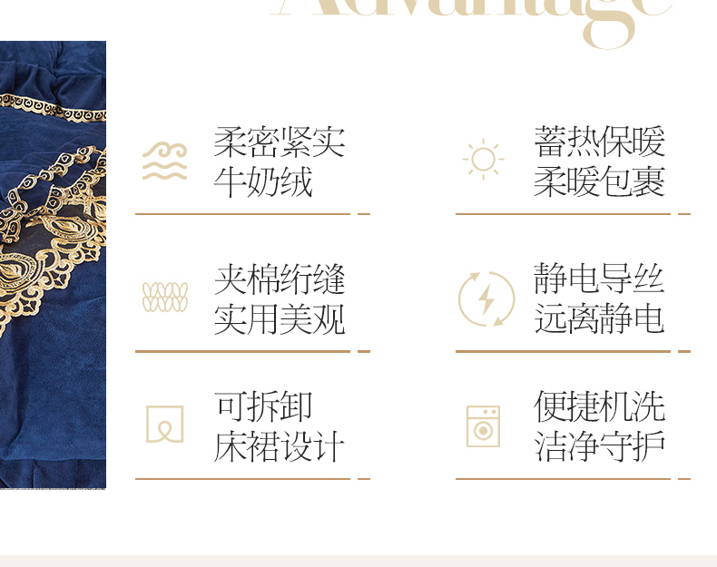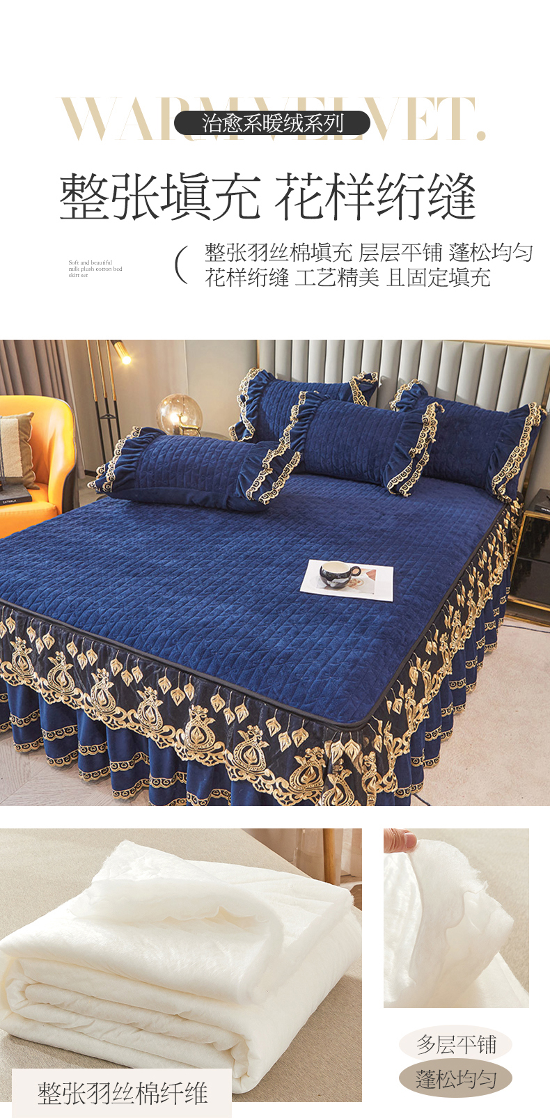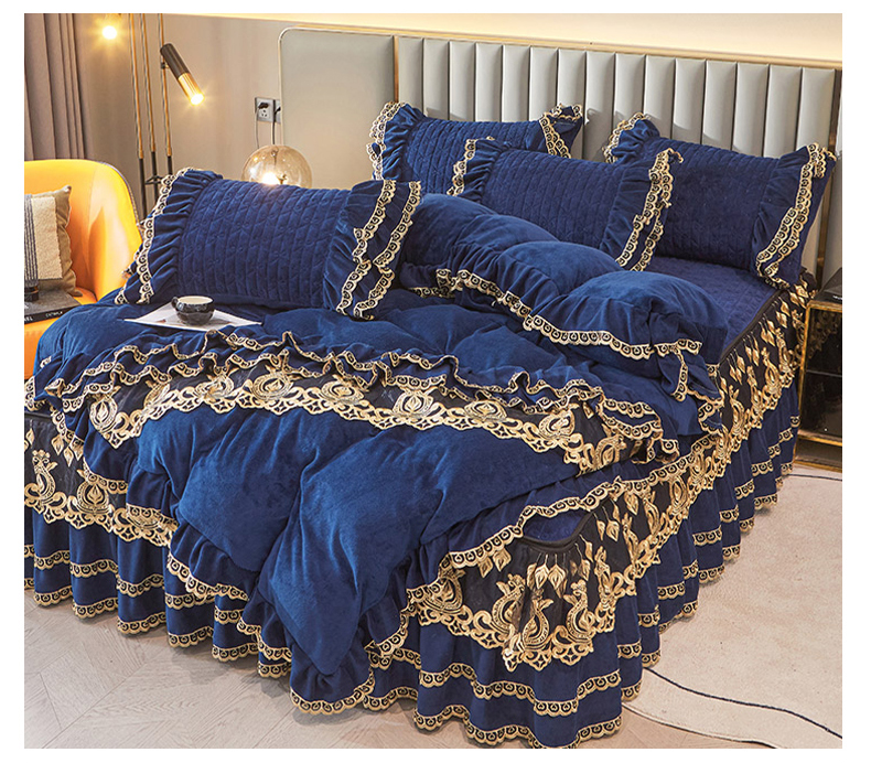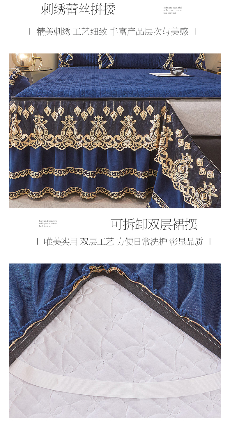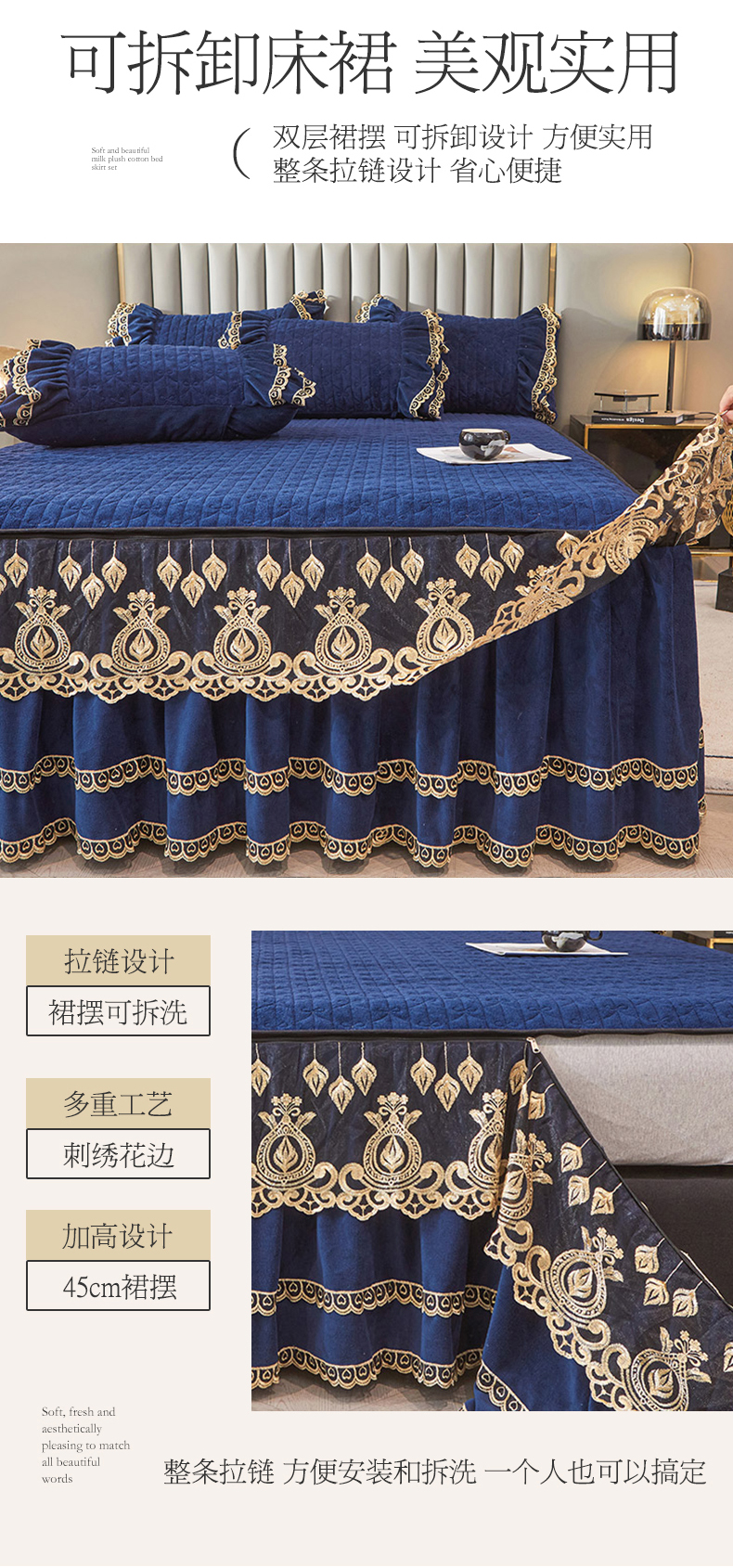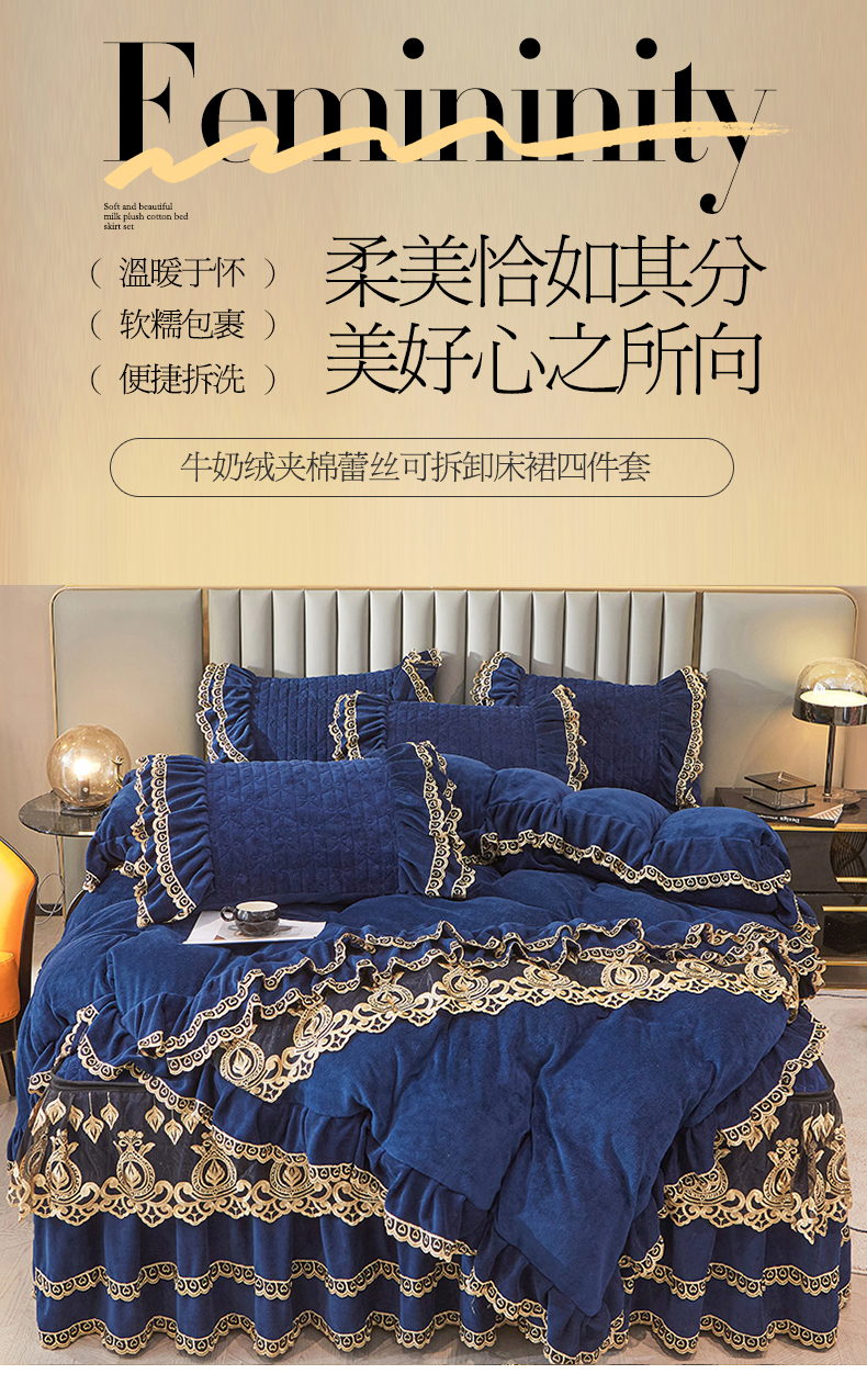 虹星家纺 2023新款牛奶绒夹棉蕾丝可拆卸床裙系列四件套 梦幻巴黎 宝蓝