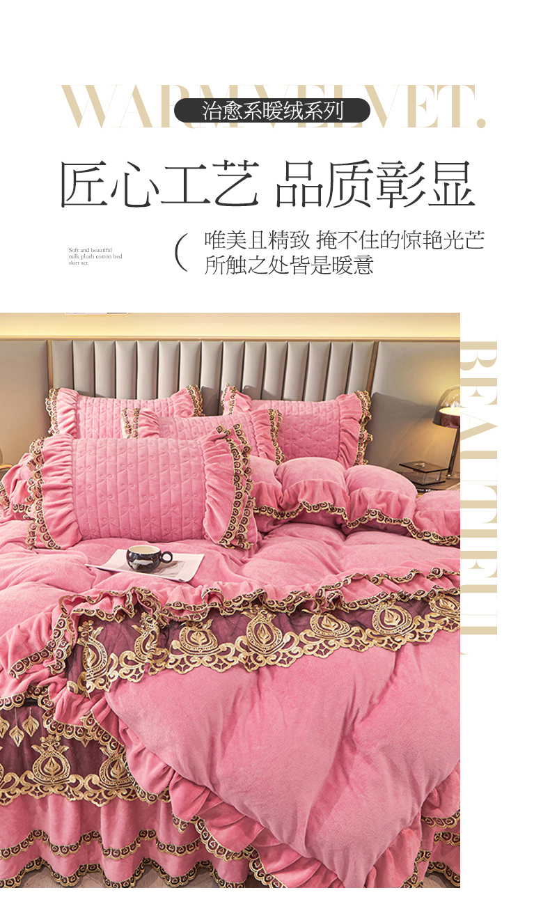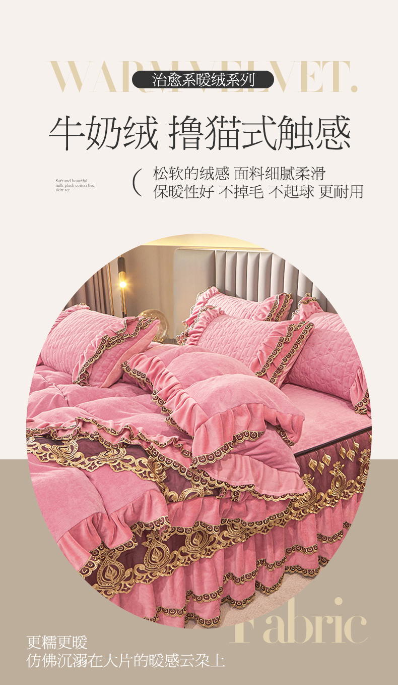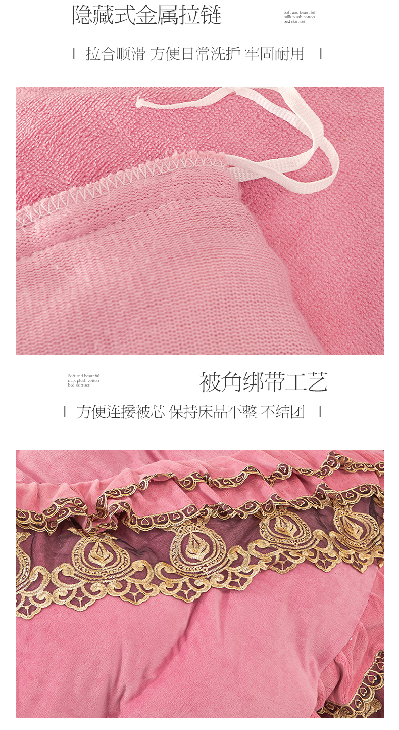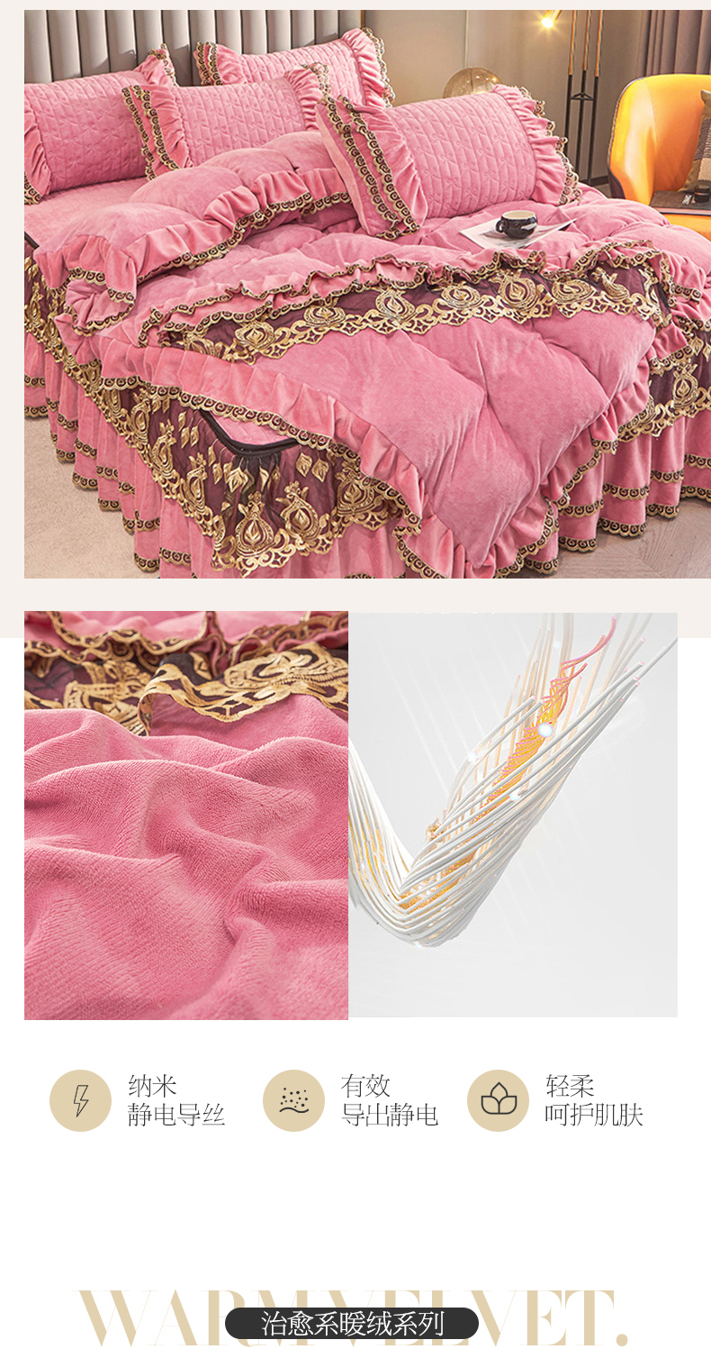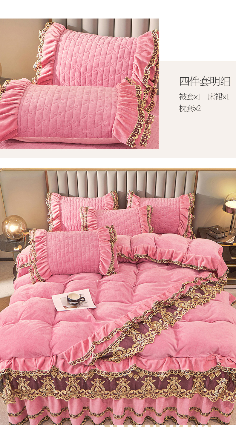 • 91家纺网 家纺一手货源 找家纺 虹星家纺 2023新款牛奶绒夹棉蕾丝可拆卸床裙系列四件套 梦幻巴黎 胭脂