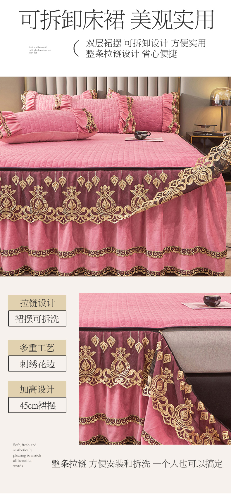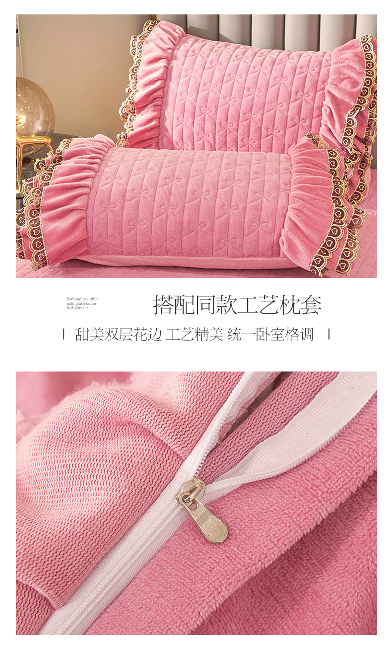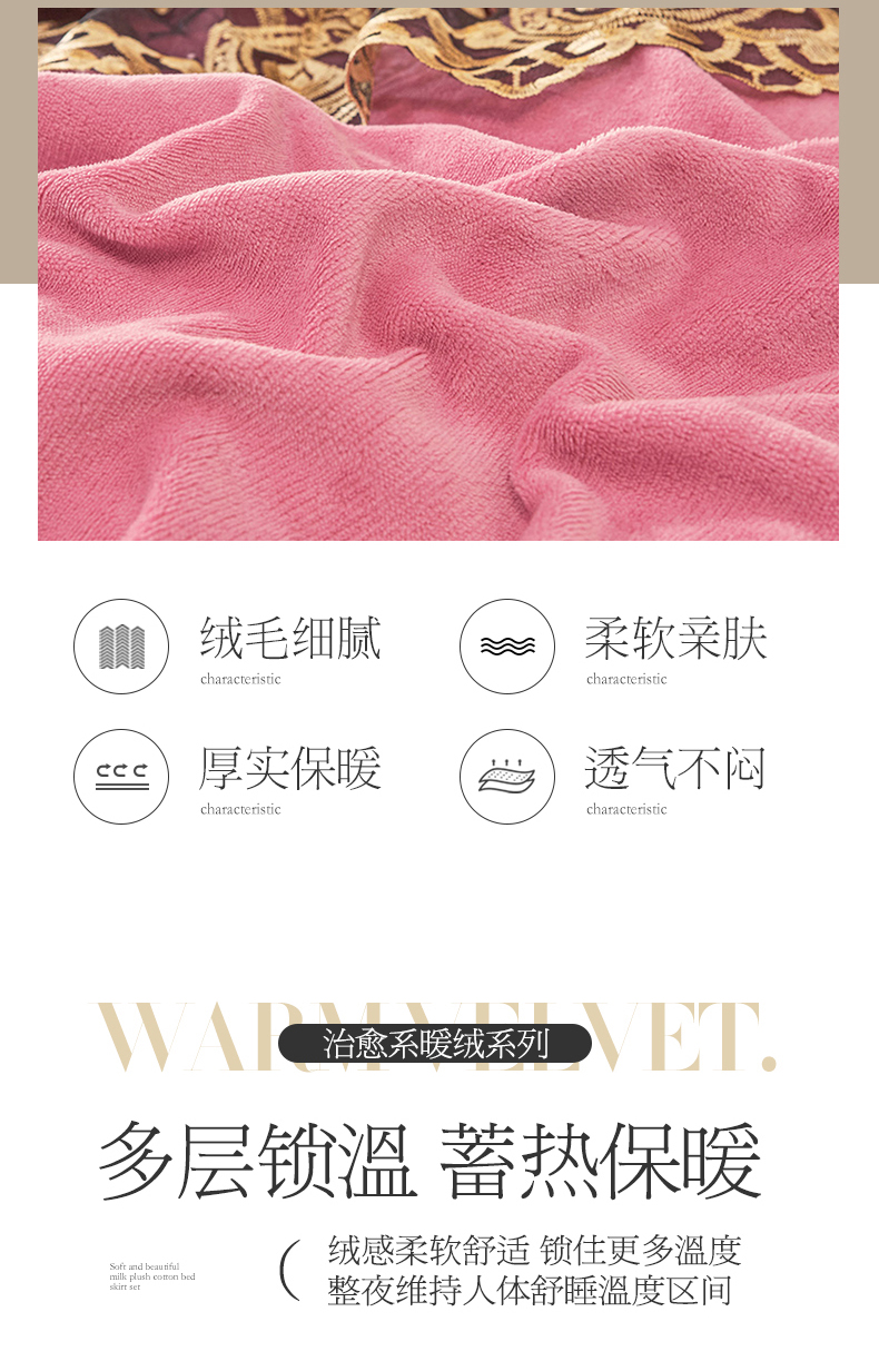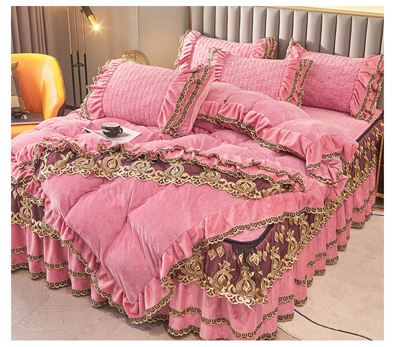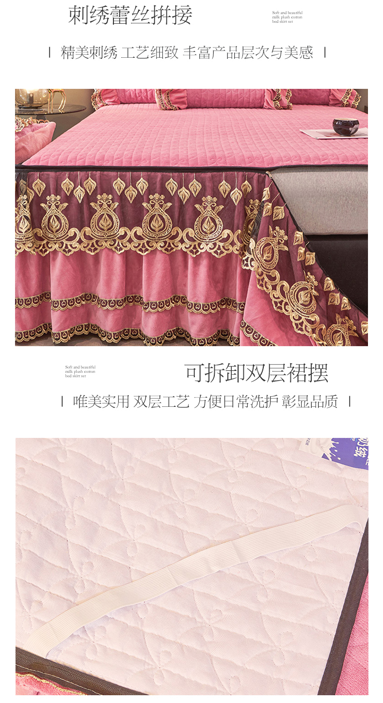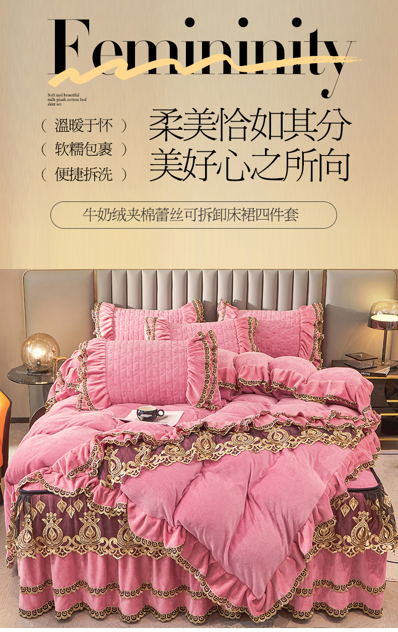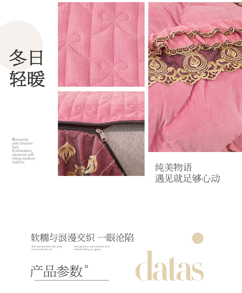 • 91家纺网 家纺一手货源 找家纺 虹星家纺 2023新款牛奶绒夹棉蕾丝可拆卸床裙系列四件套 梦幻巴黎 胭脂