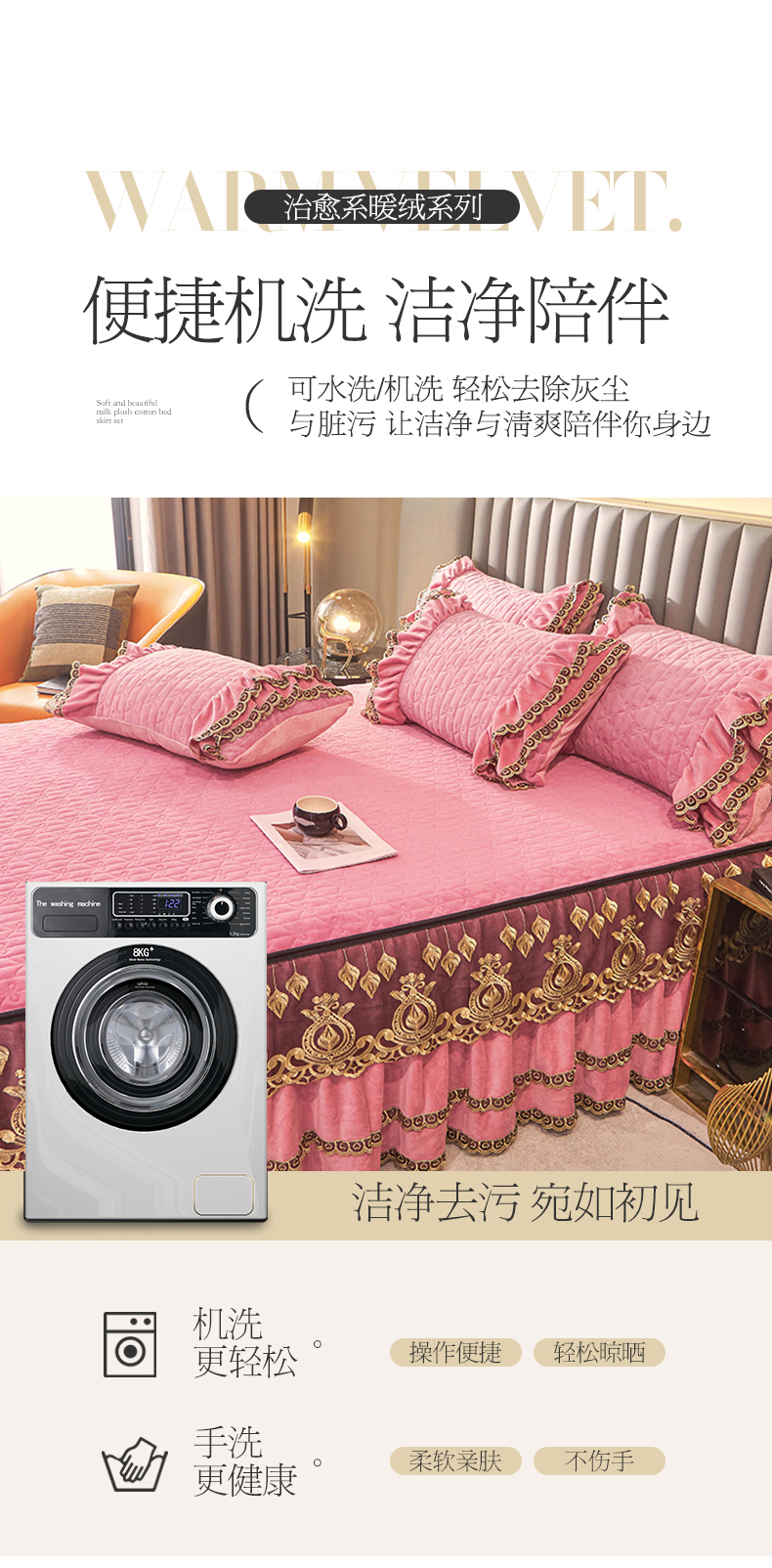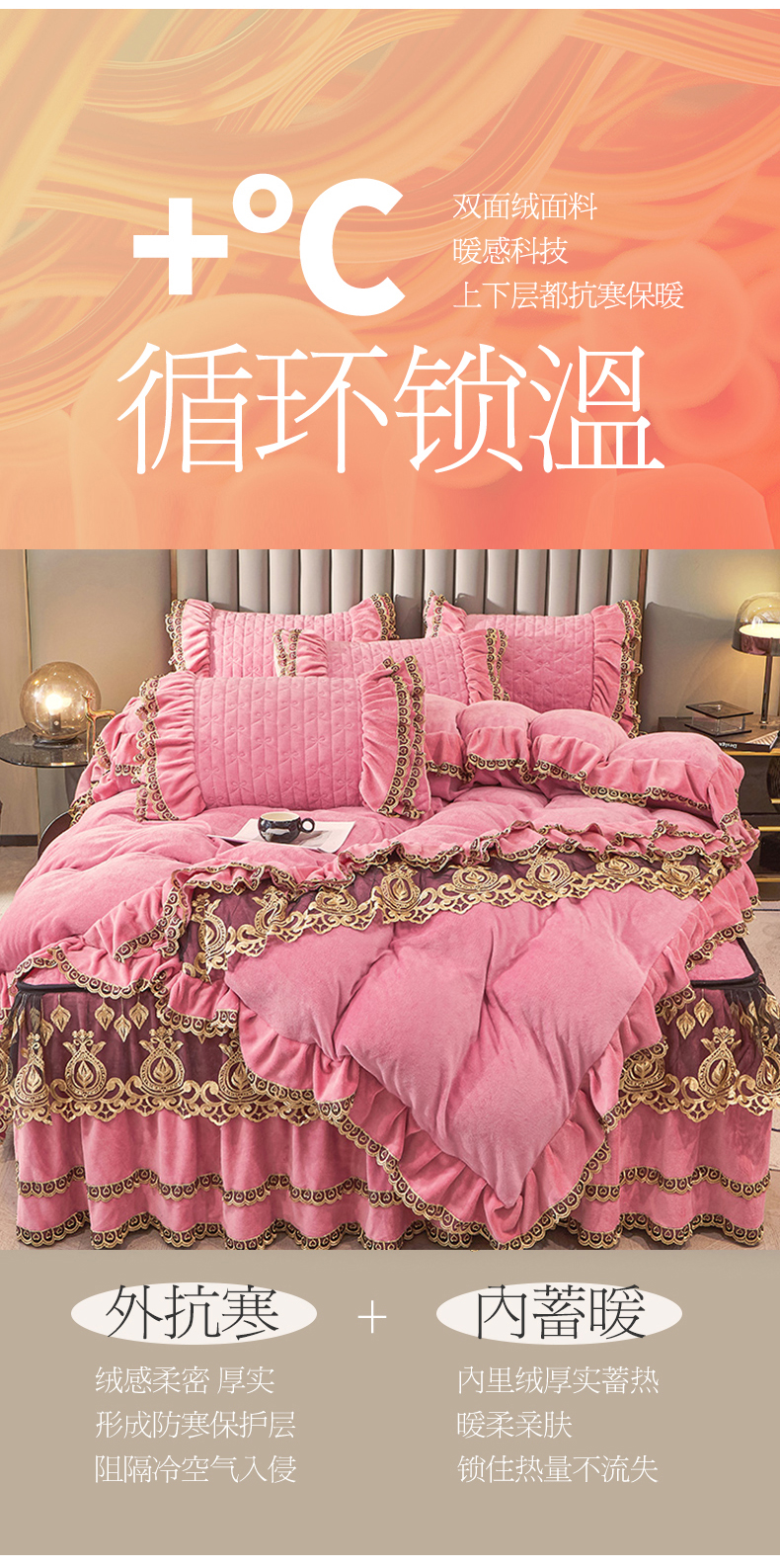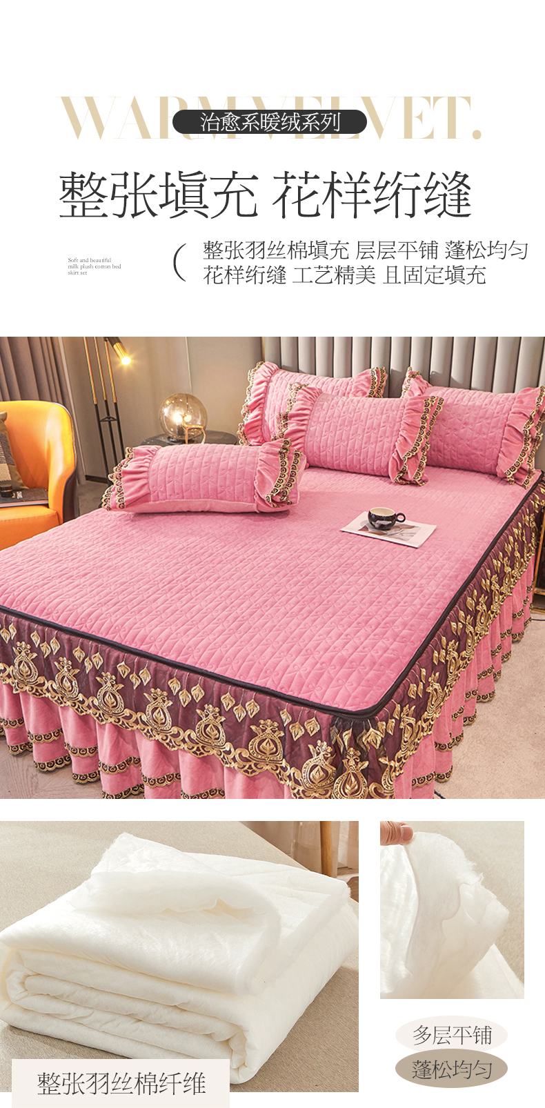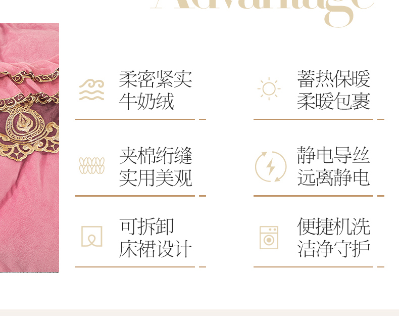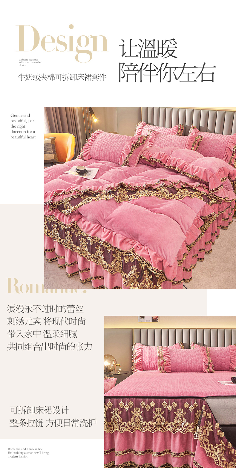 • 91家纺网 家纺一手货源 找家纺 虹星家纺 2023新款牛奶绒夹棉蕾丝可拆卸床裙系列四件套 梦幻巴黎 胭脂