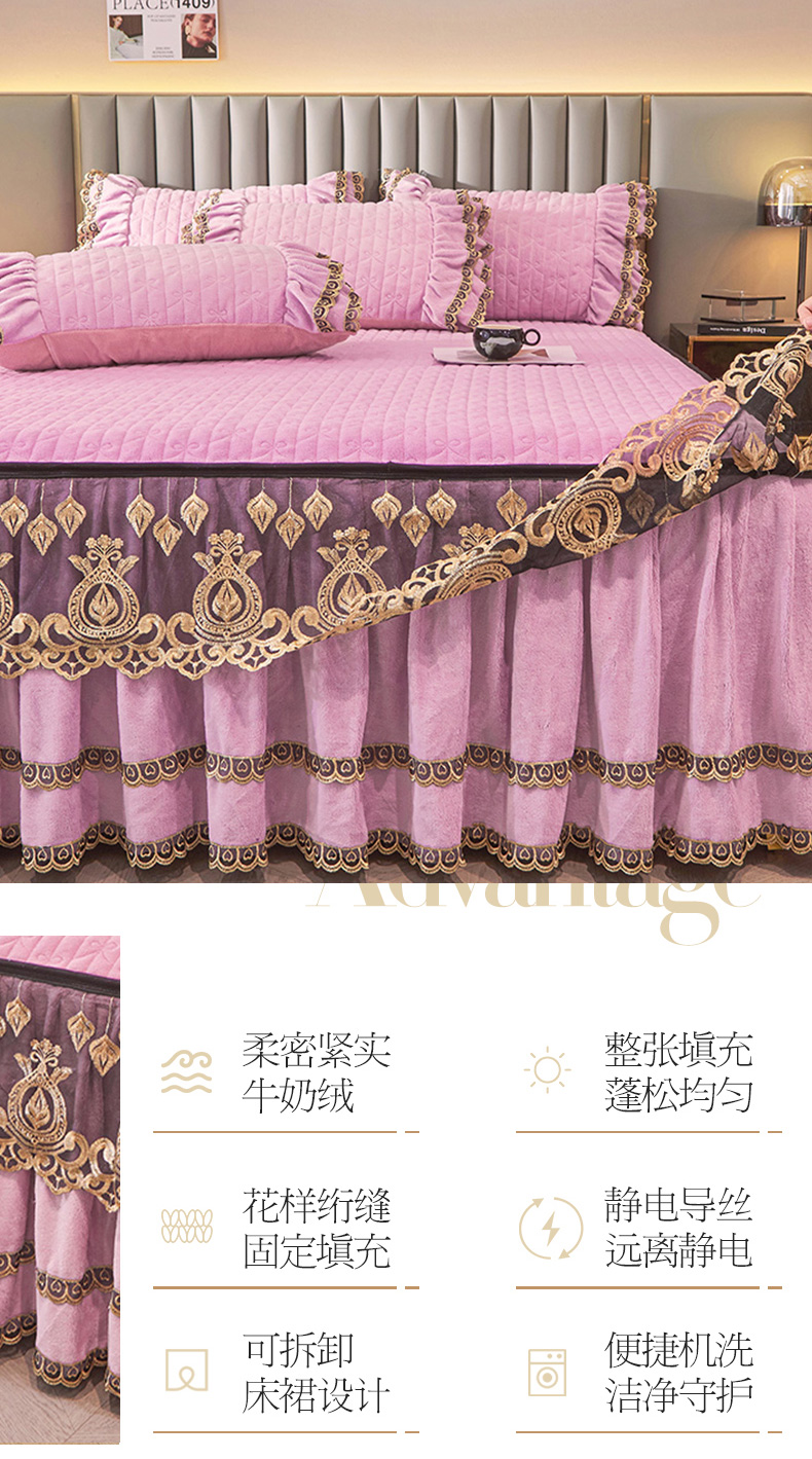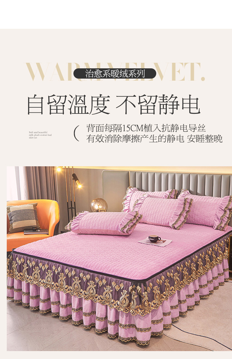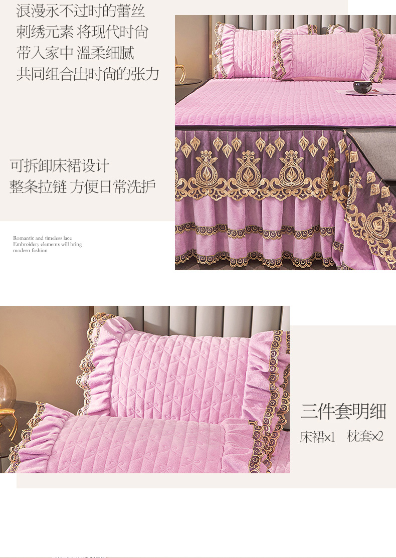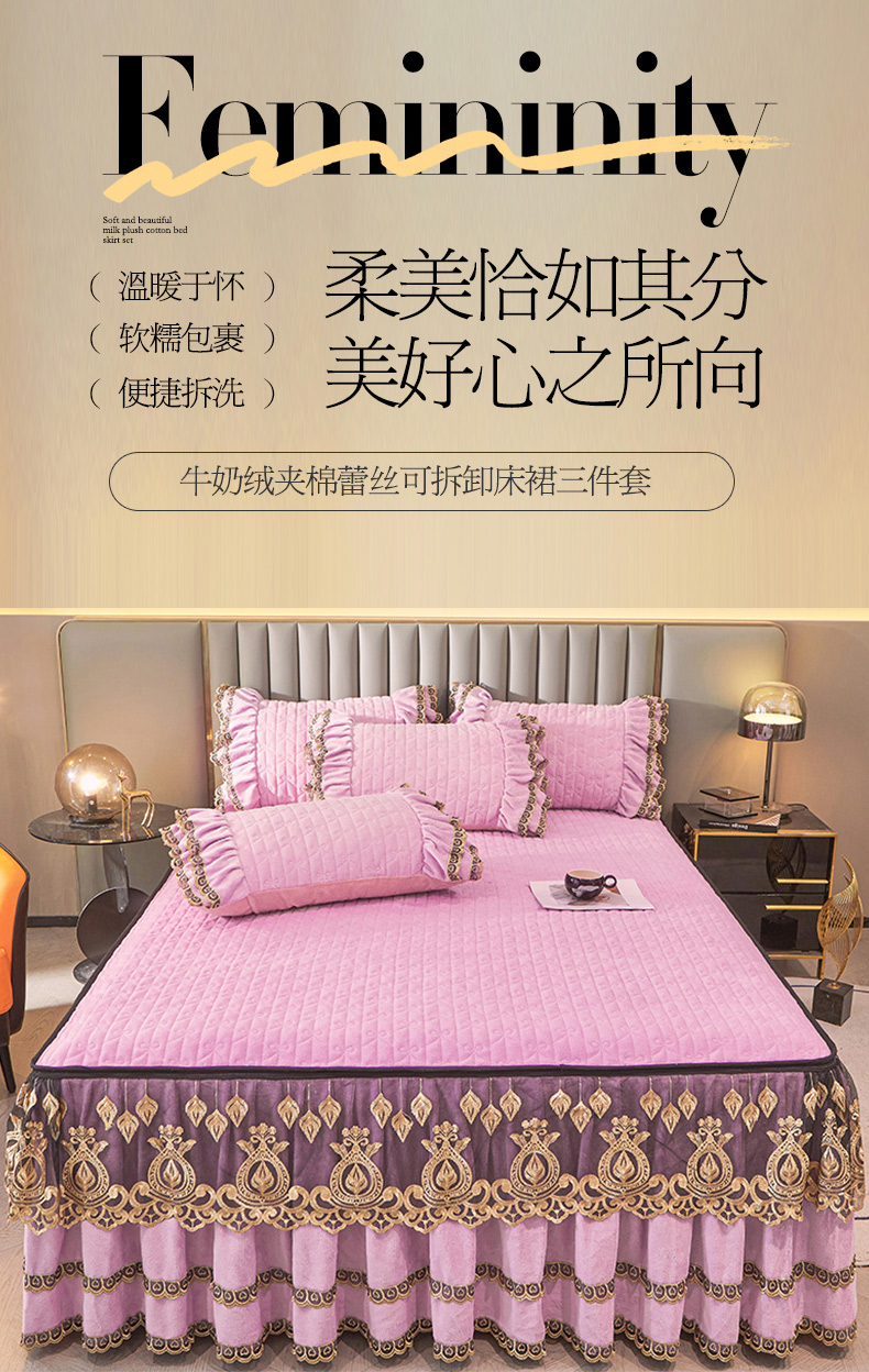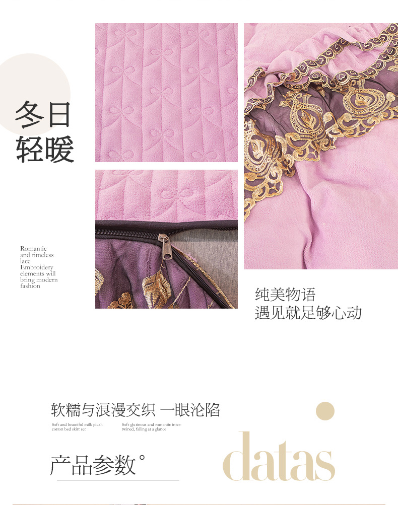 商品名称:虹星家纺 2023新款牛奶绒夹棉蕾丝可拆卸床裙系列单床裙 梦幻巴黎 柔紫
