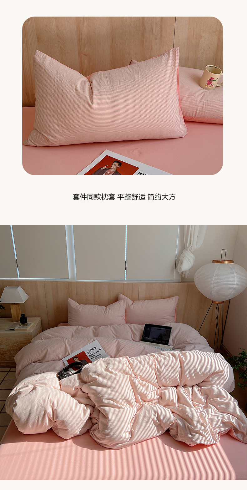雅居纺家纺 2024新款色织水洗棉四件套 细条粉
