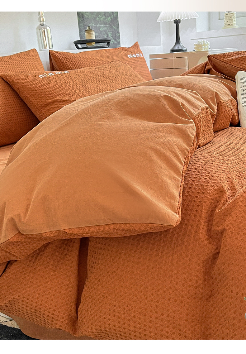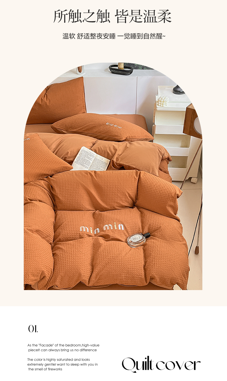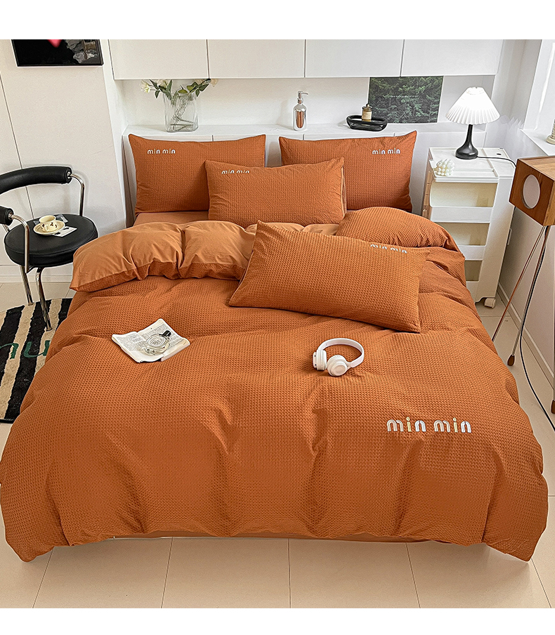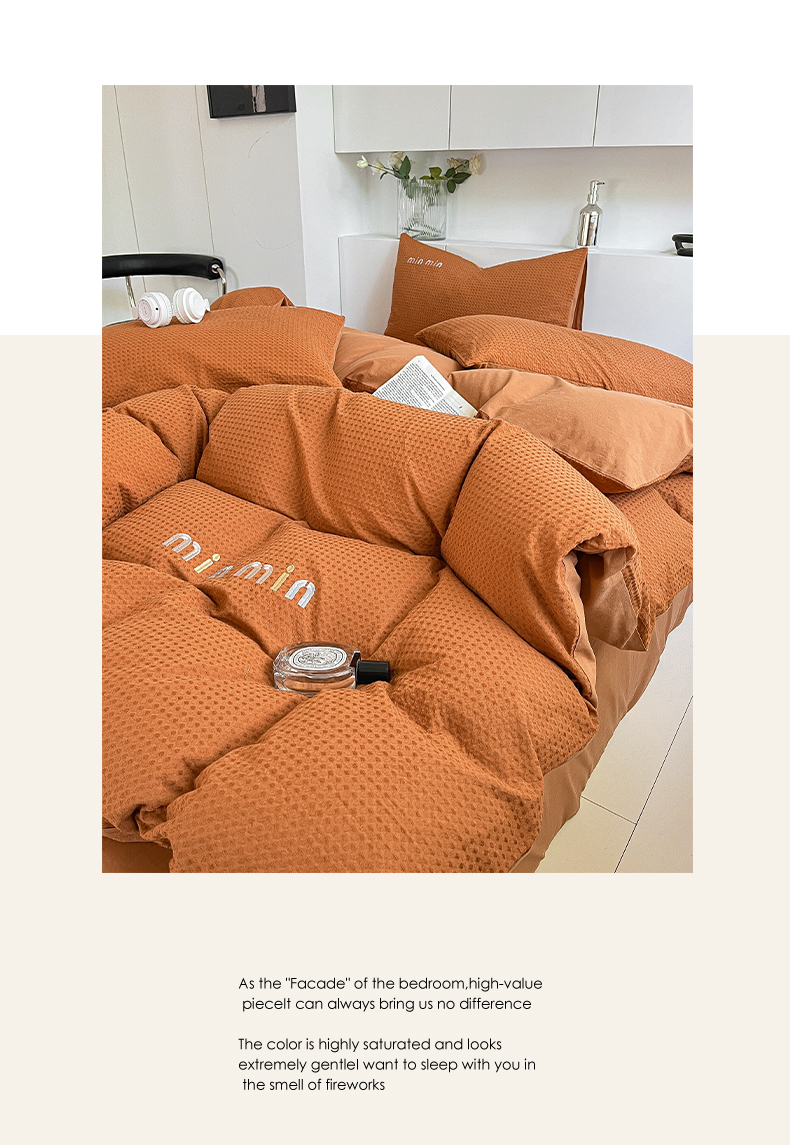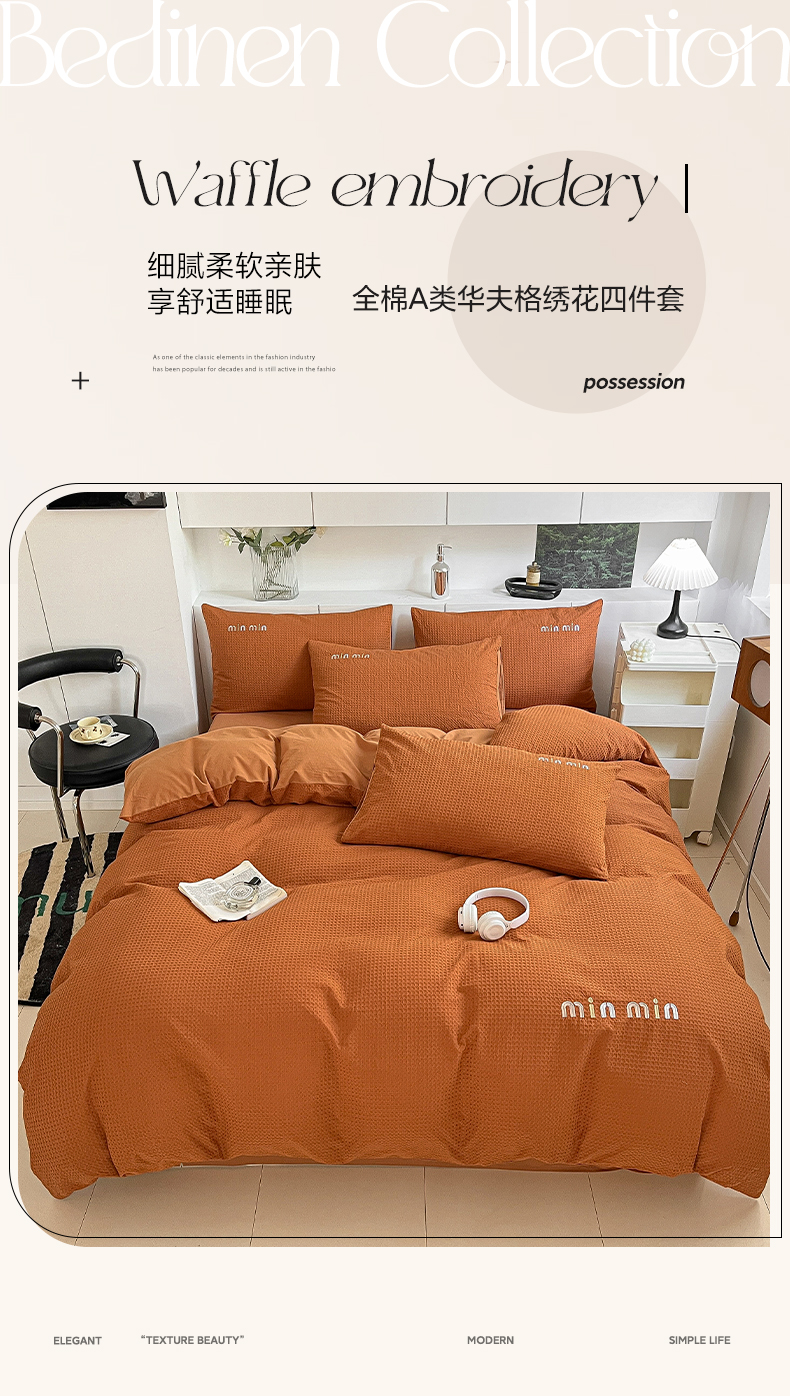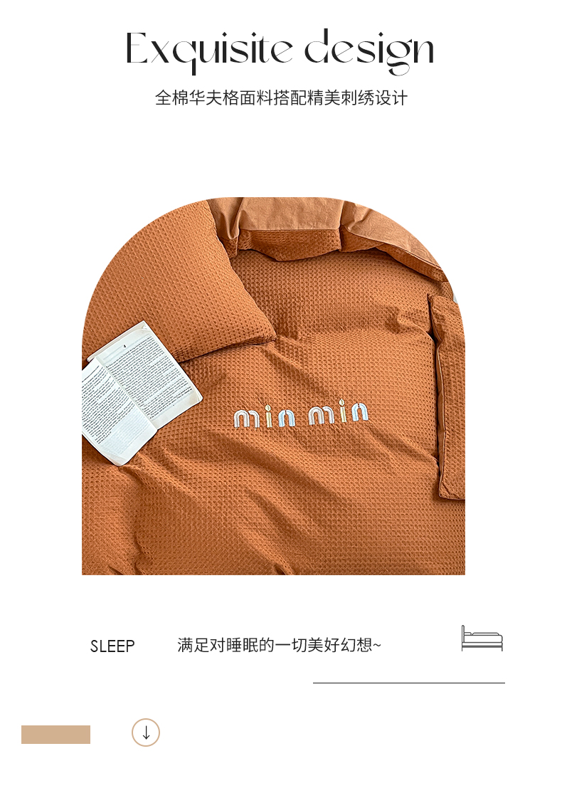 商品名称:雅居纺家纺 2024新款全棉华夫格绣花四件套 Min-焦糖