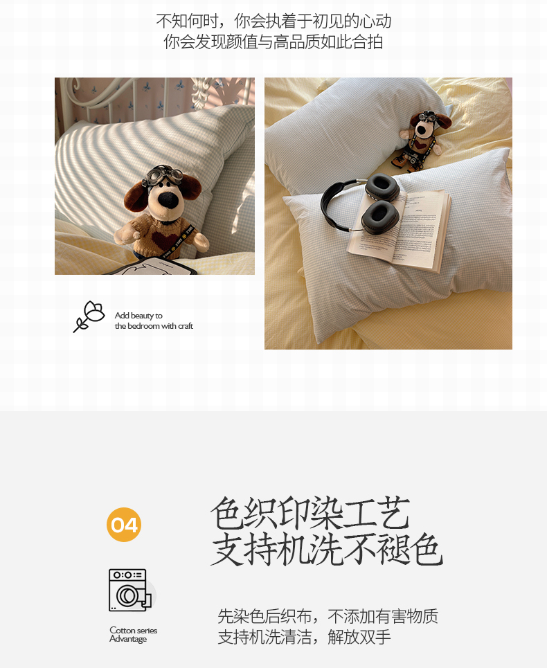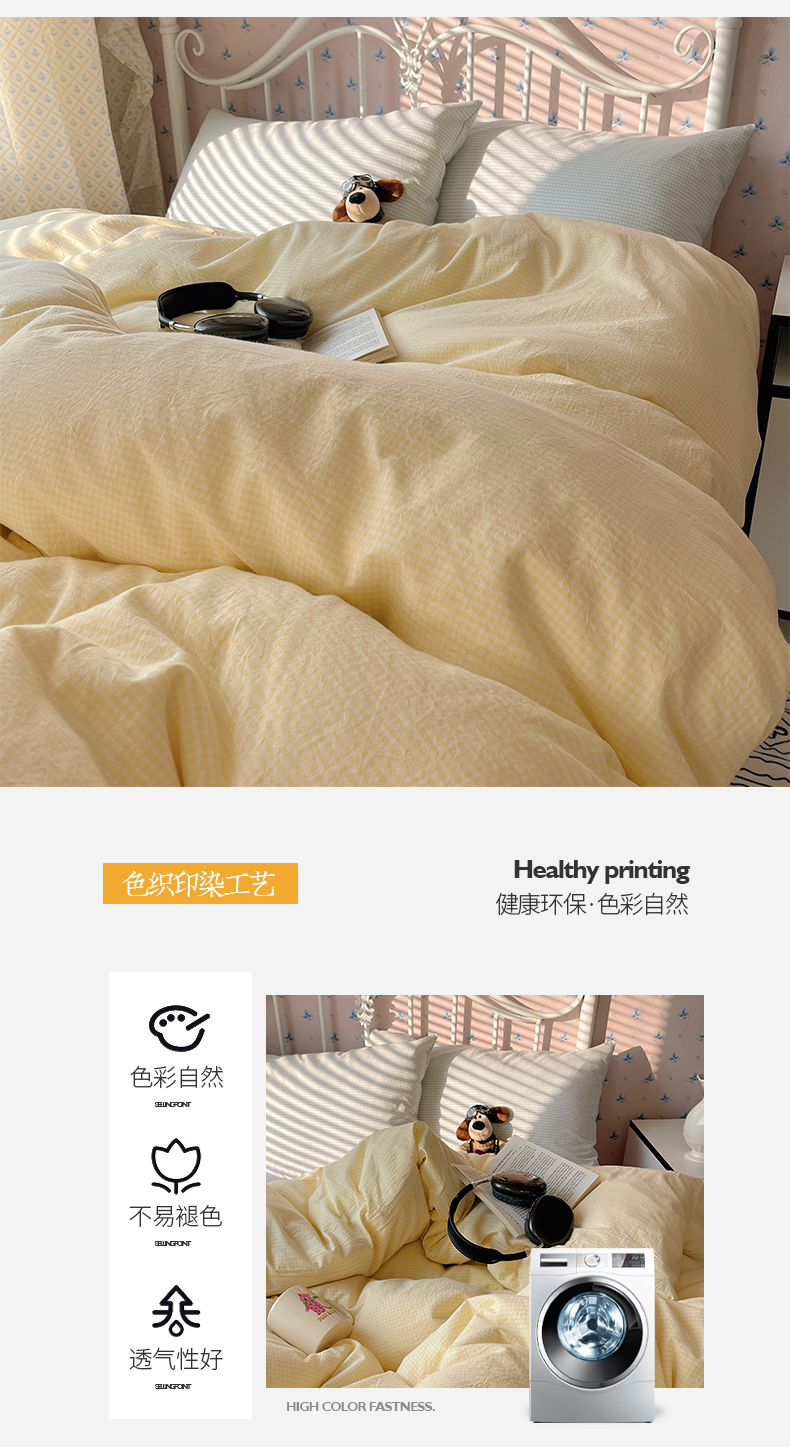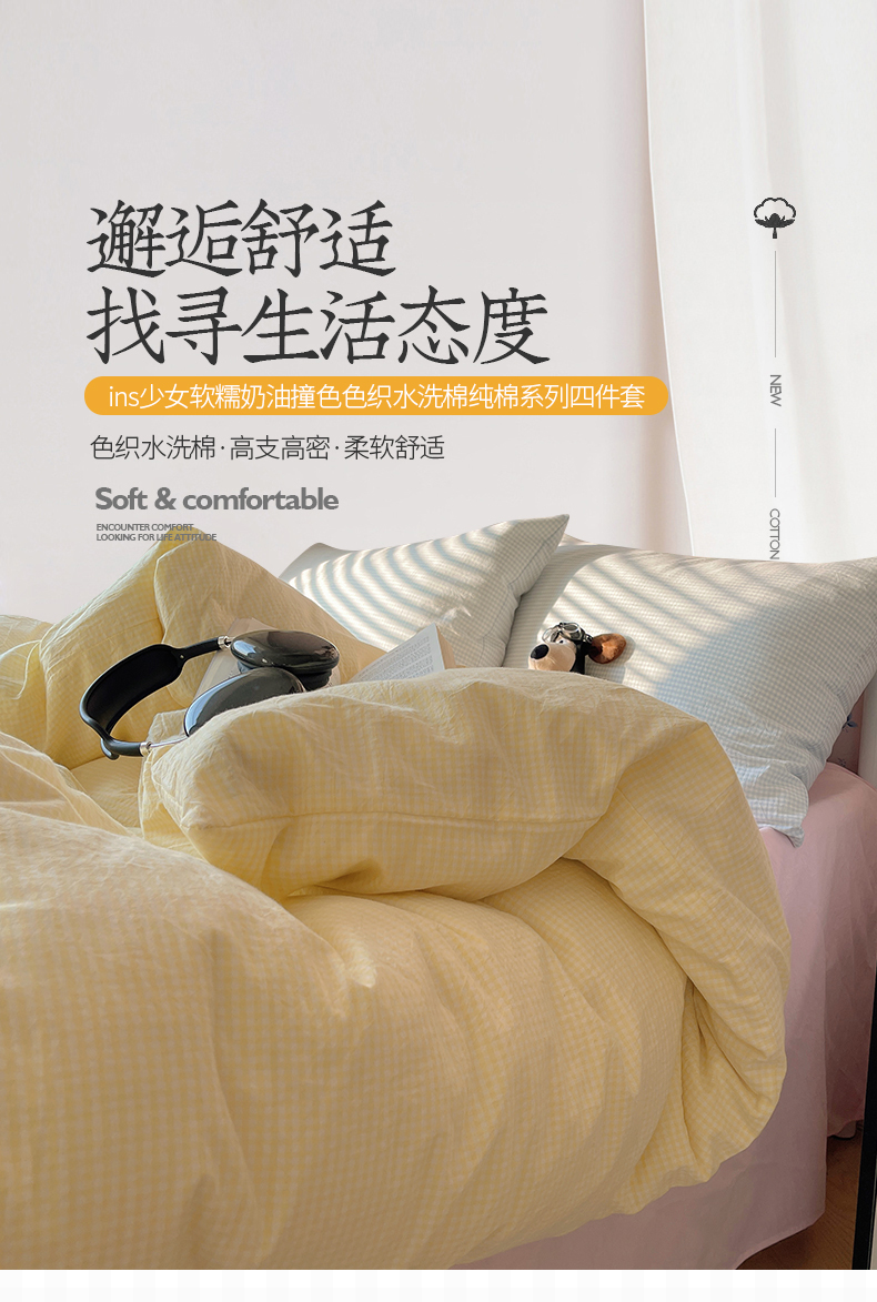 商品名称:桃子家居 2024新款ins少女软糯奶油撞色色织水洗棉纯棉系列四件套 水洗棉-色织小黄格