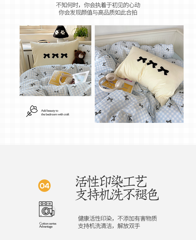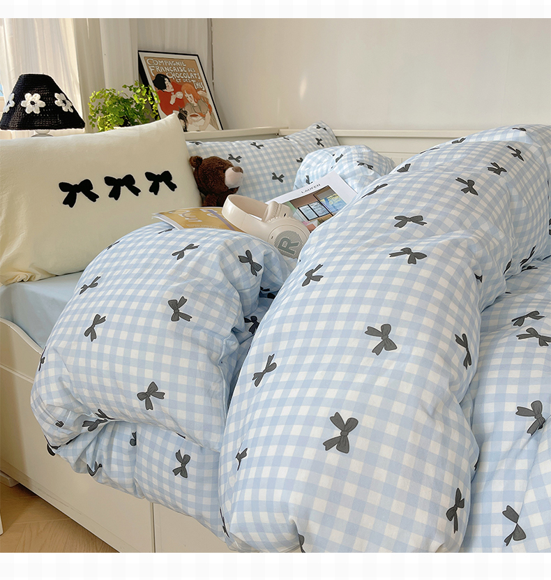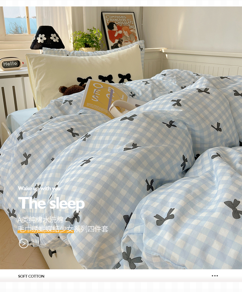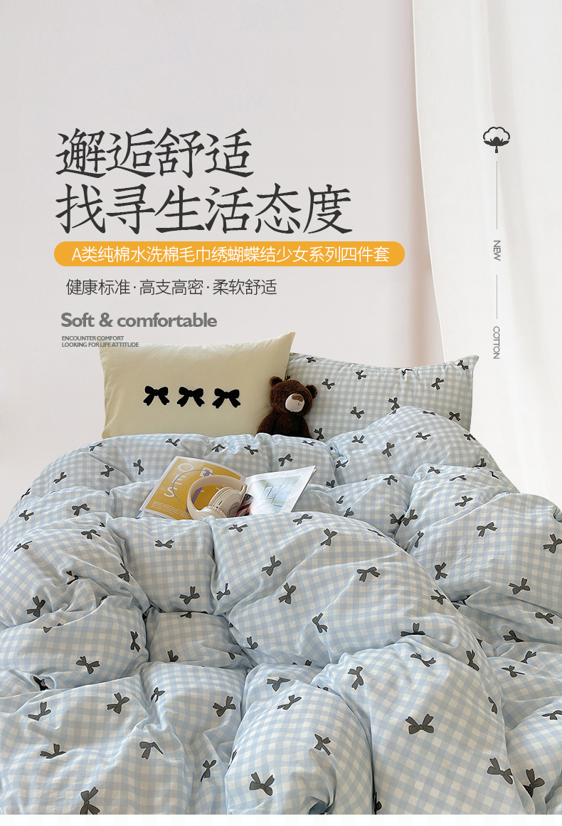 当前位置: 91家纺网 > 商品网购 > 床品套件 > 四件套 > 全棉普通四件套 > 桃子家居 2024新款A类纯棉水洗棉毛巾绣蝴蝶结少女系列四件套 水洗棉-蝴蝶结蓝黑+蓝黄