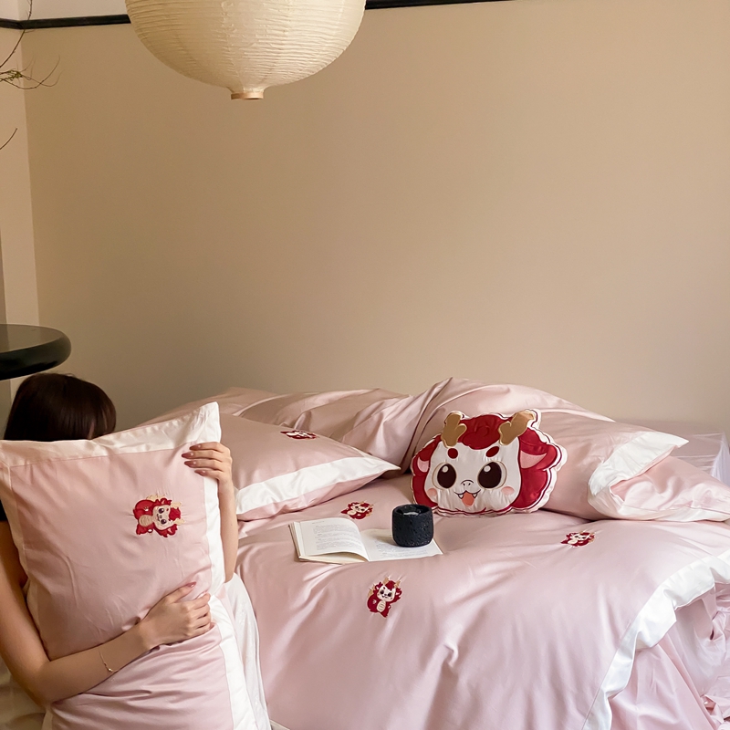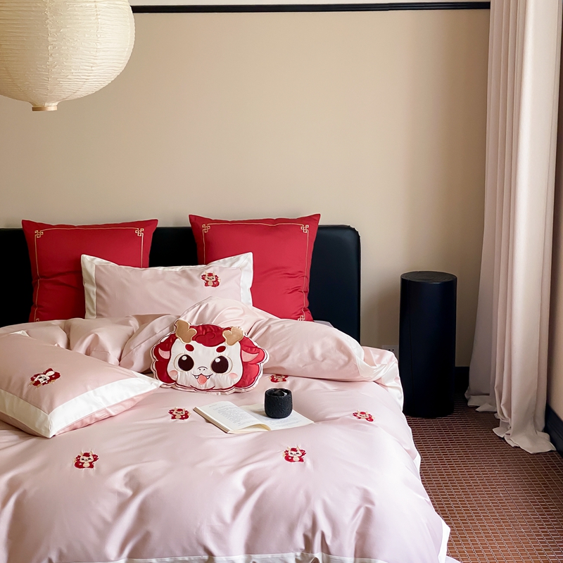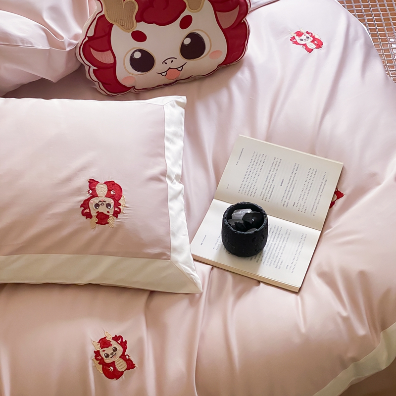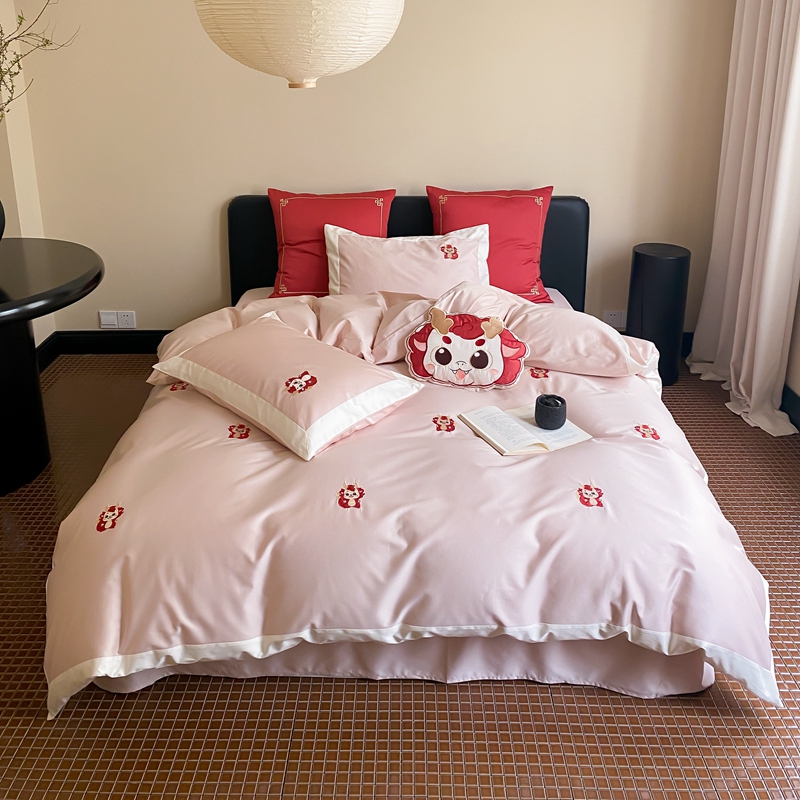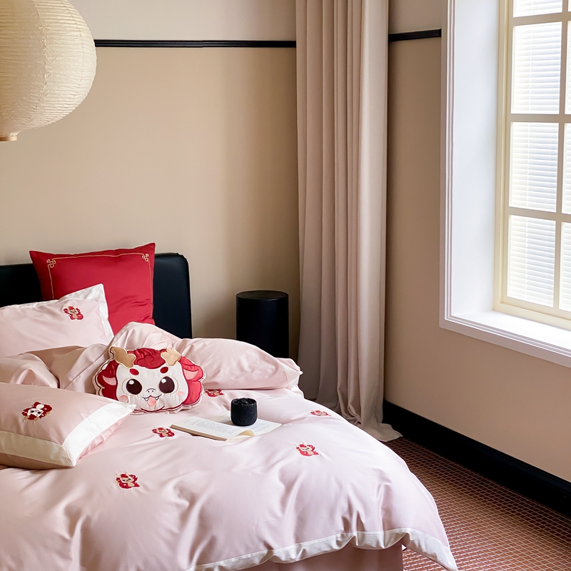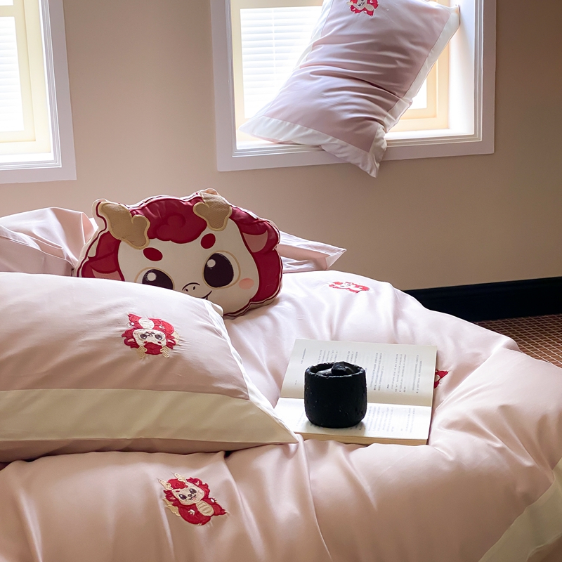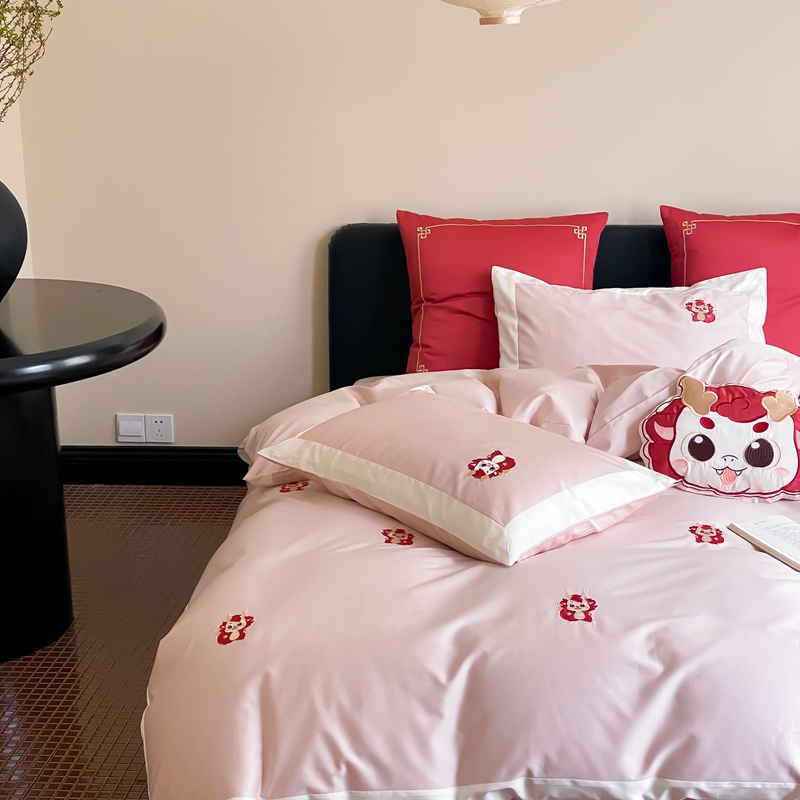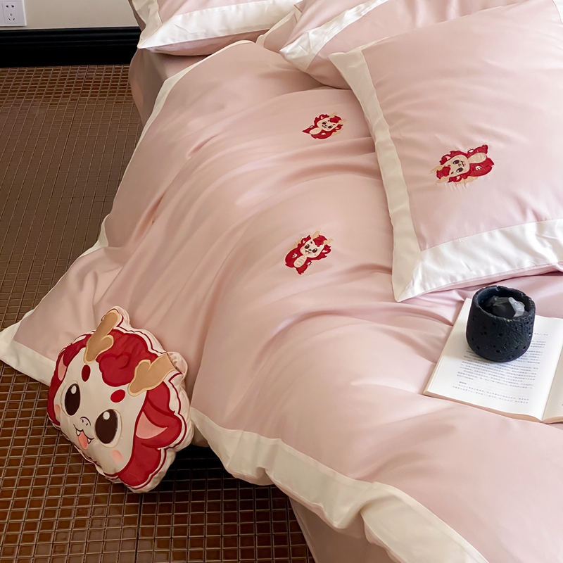 商品名称:曼布缇 2025春夏新品100s长绒棉绣花四件套-万事兴龙 万事兴龙-粉