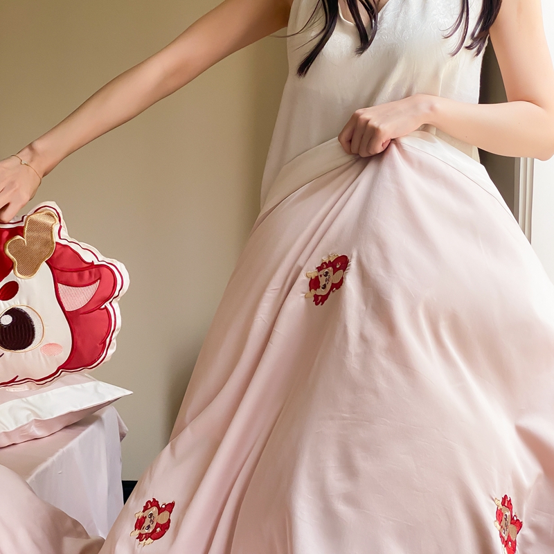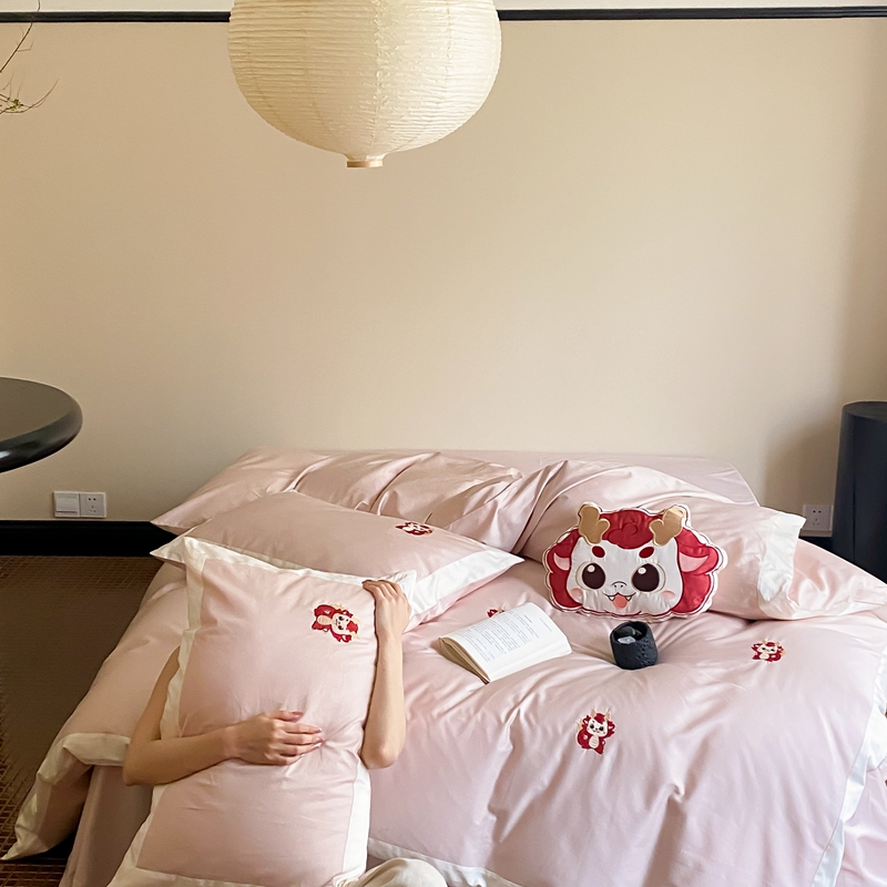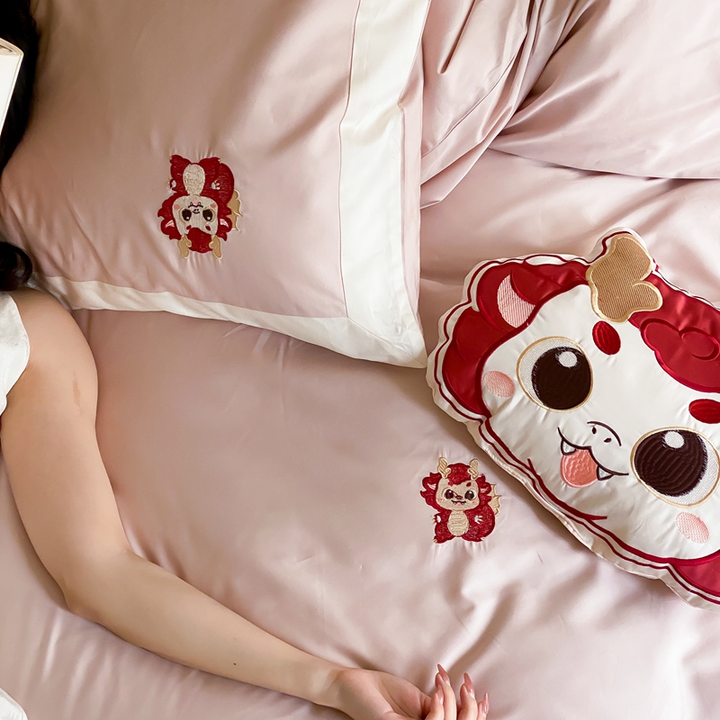 曼布缇 2025春夏新品100s长绒棉绣花四件套-万事兴龙 万事兴龙-粉