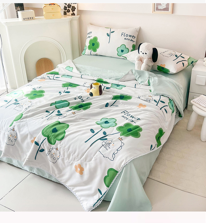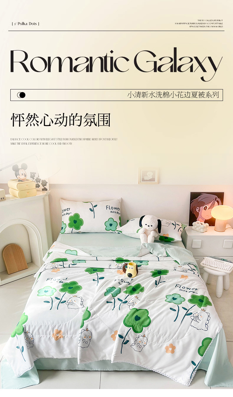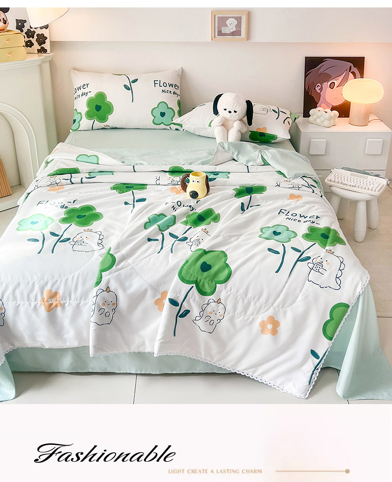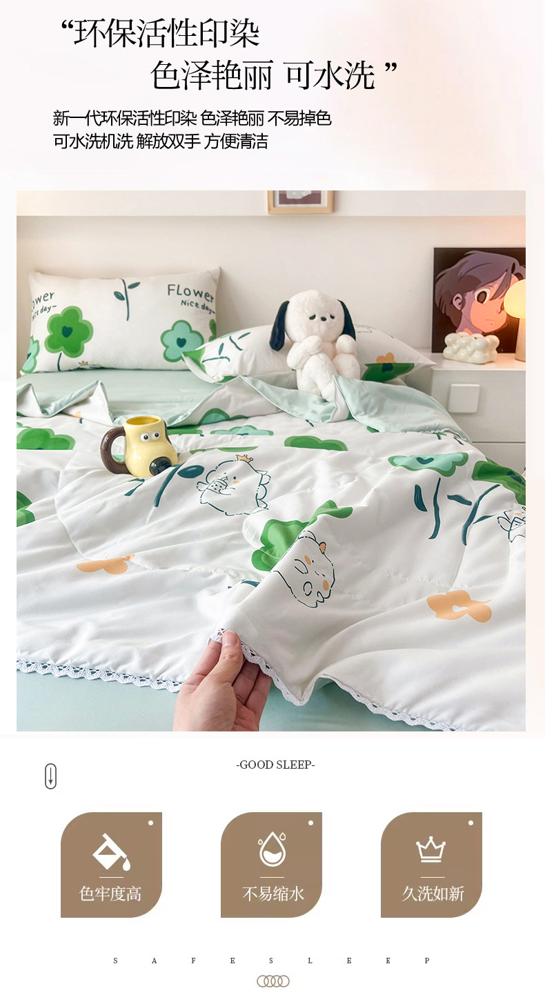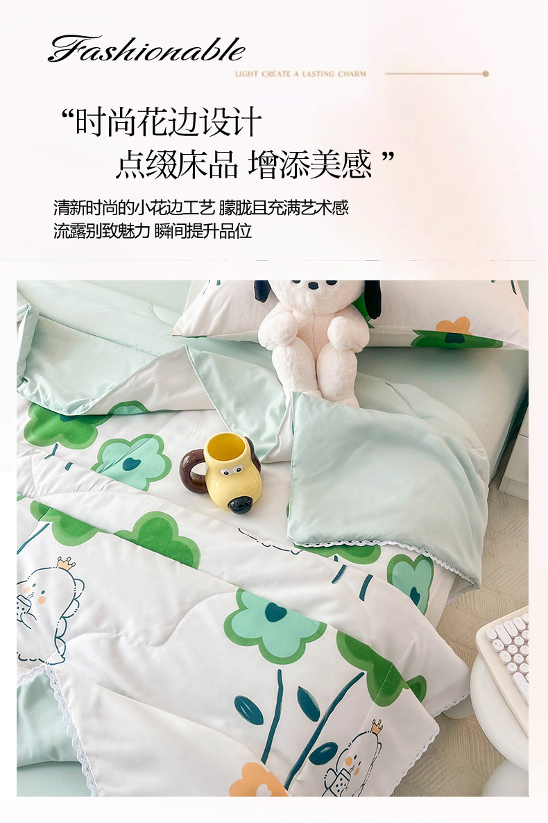 倾慕家纺 新款A类小清新水洗棉小花边夏被系列 绿叶小恐龙