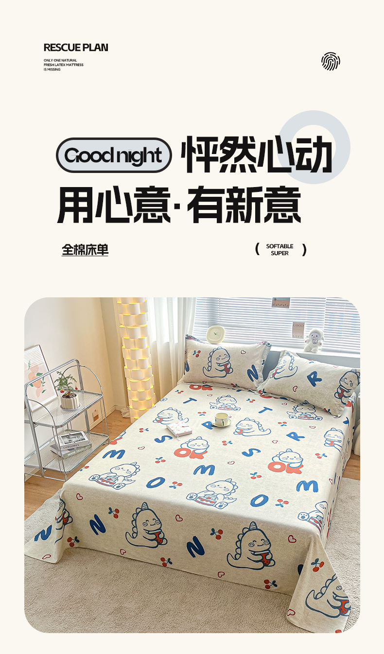 涵宸家纺 2024新款全棉小清新印花单品套件--单床单 床单-皮皮龙