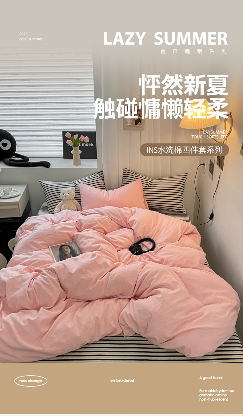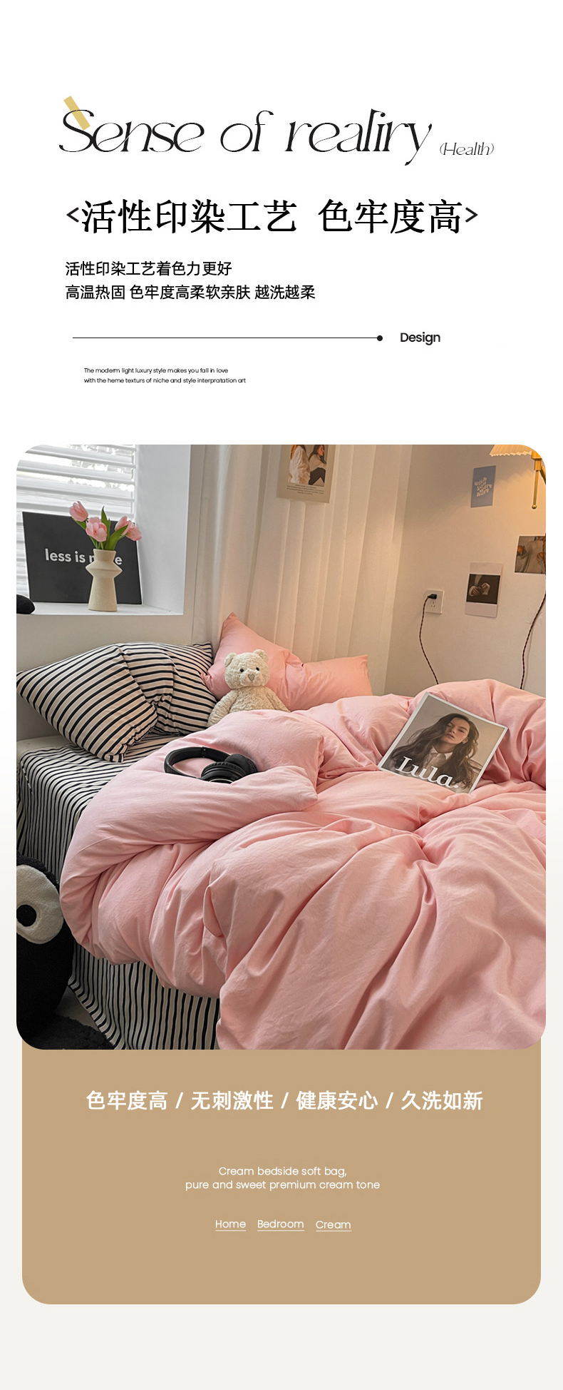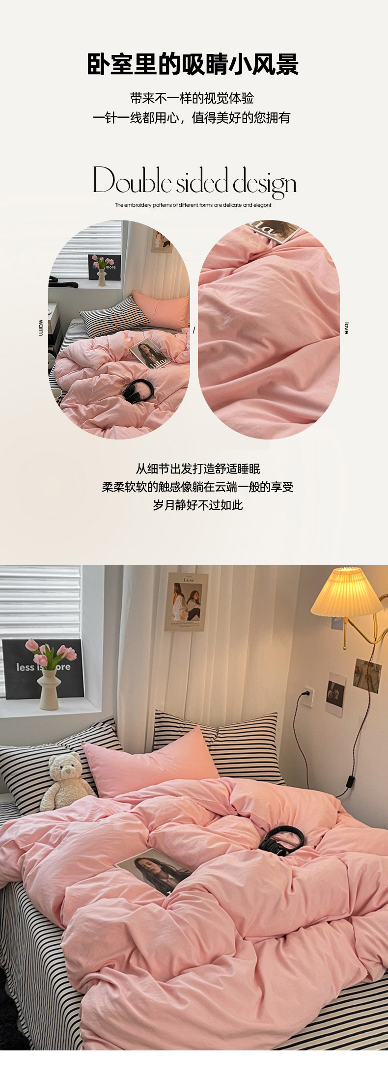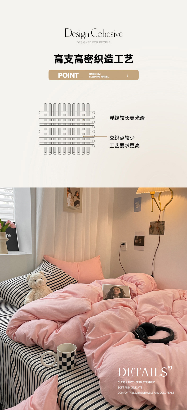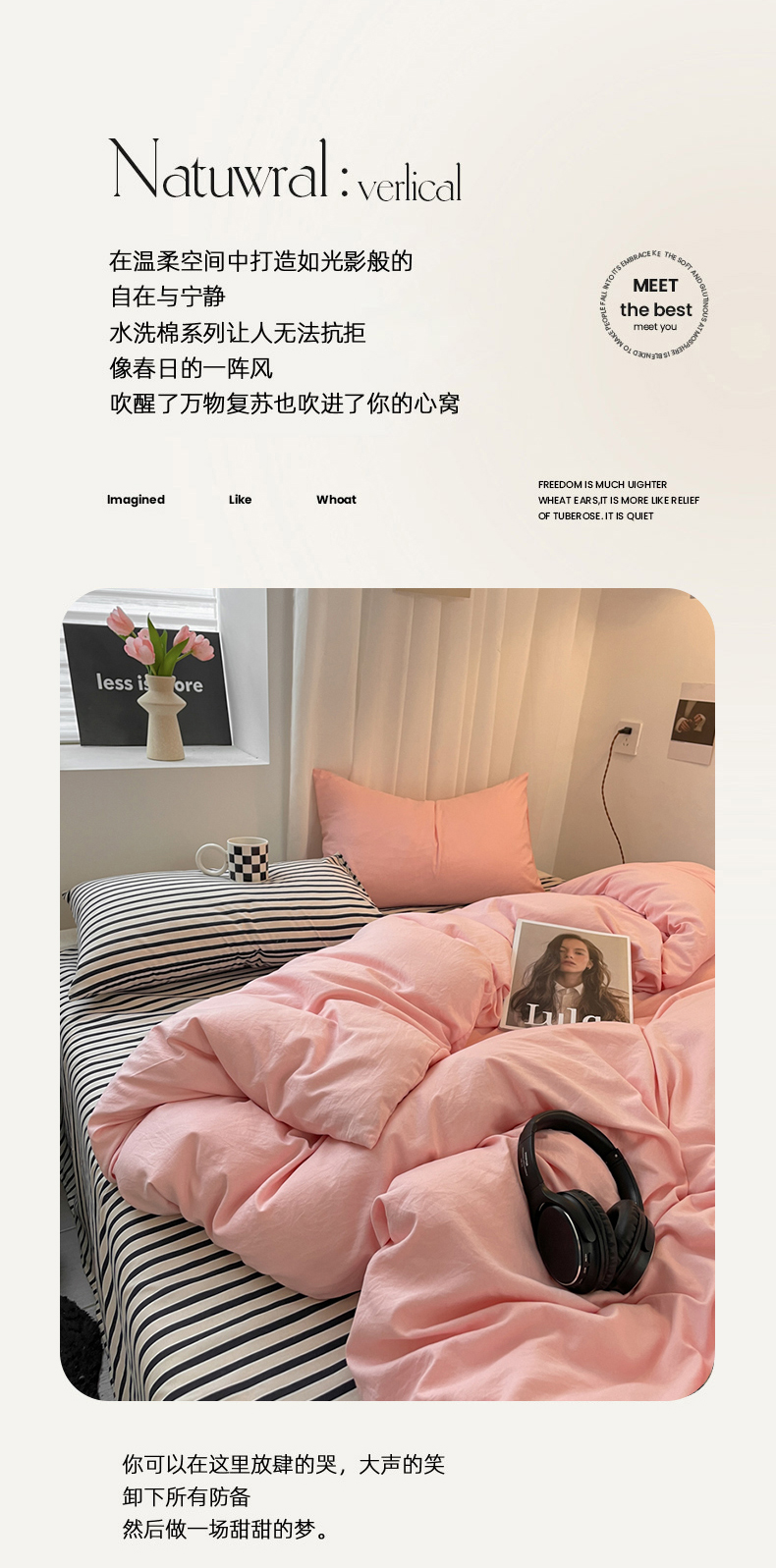当前位置: 91家纺网 > 商品网购 > 床品套件 > 四件套 > 水洗棉四件套 > 耀达家居 2024新款ins 纯色双拼条纹水洗棉四件套 奶油粉