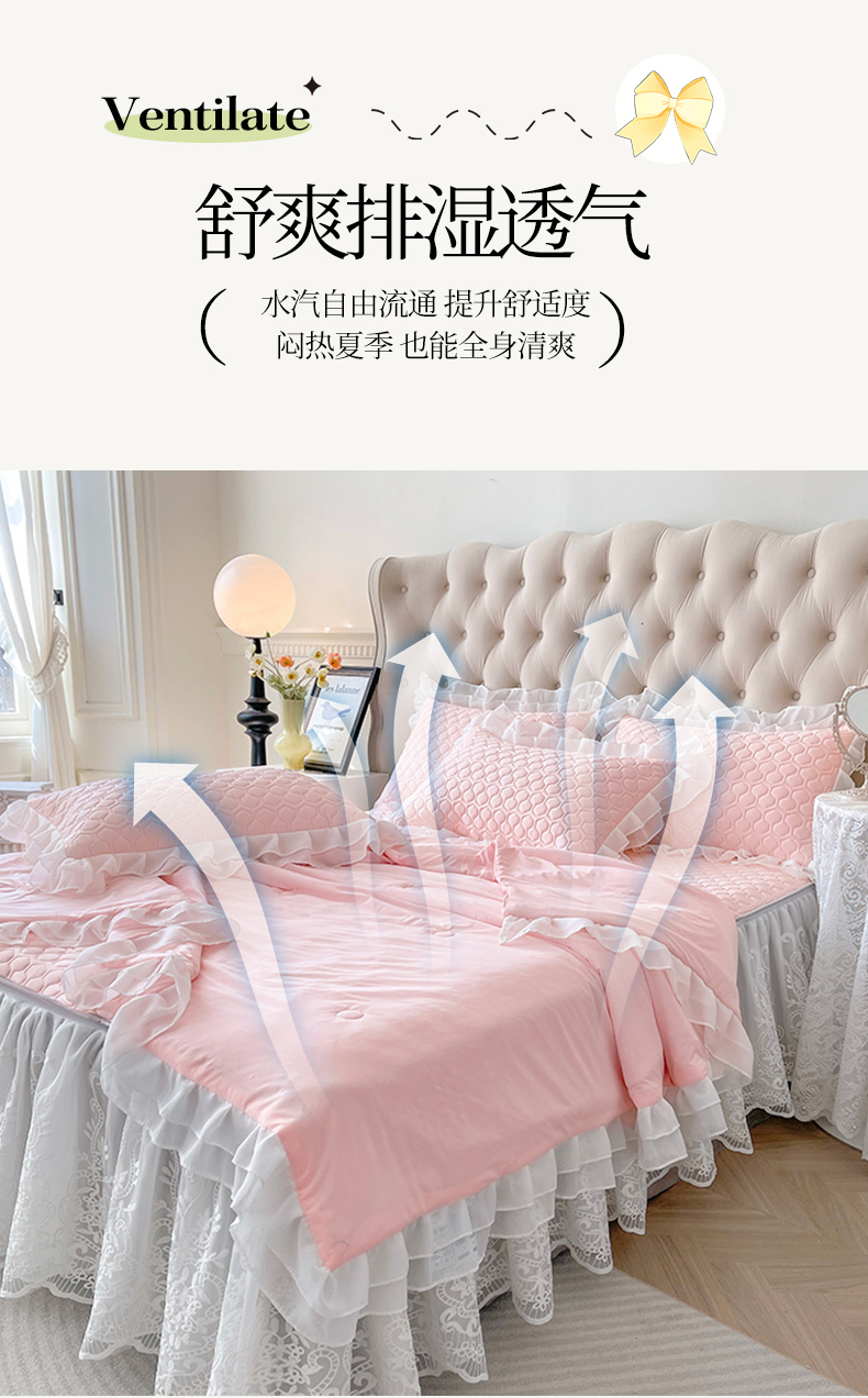 虹星家纺 2024新款凉感丝印花可拆床裙套件-夏被凉席四件套 仙女粉