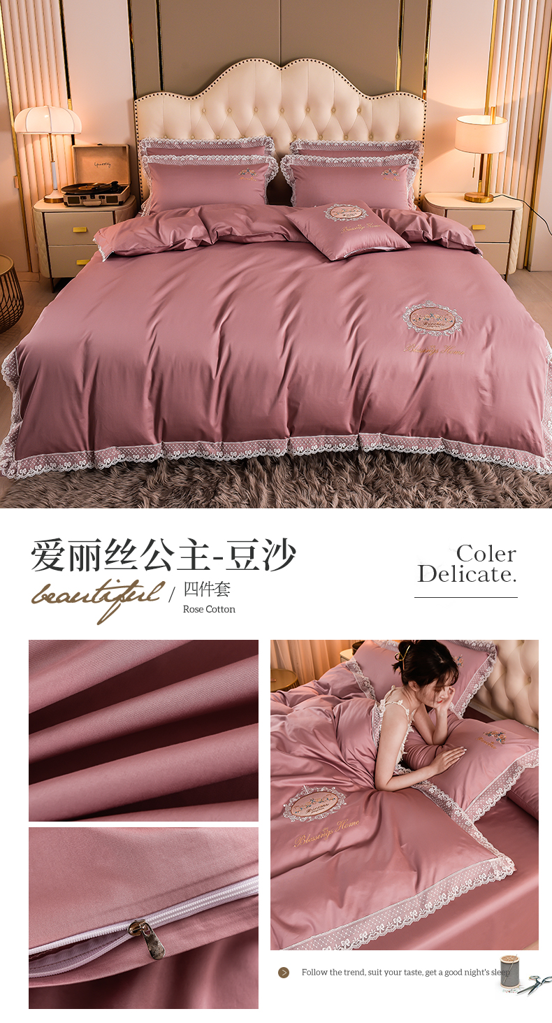 (总)瑞驰家纺 长绒棉绣花四件套-锦瑟,豆沙红,宫廷黄,极光红,金属咖,魅影蓝,藕粉,圣女紫,松绿,香芋紫
