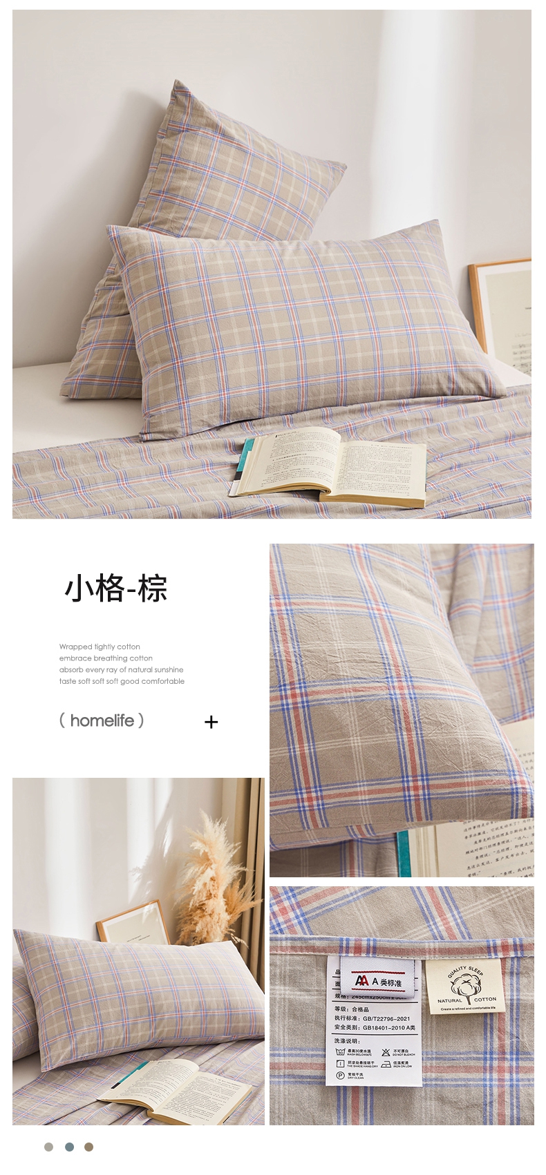 雅萱家纺 2024新款A类色织全棉水洗棉单枕套 小格-棕