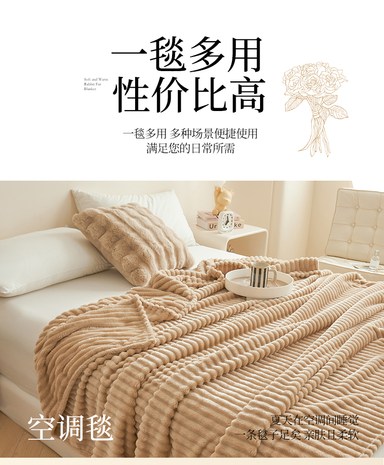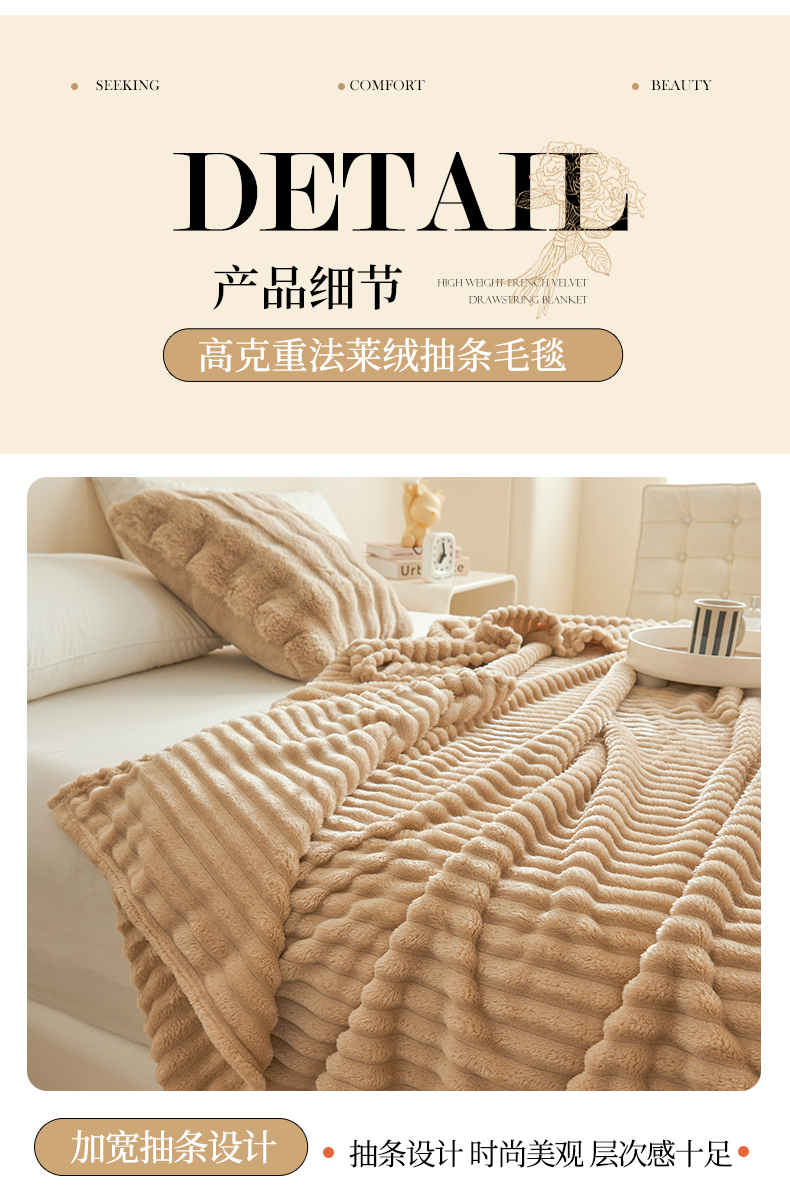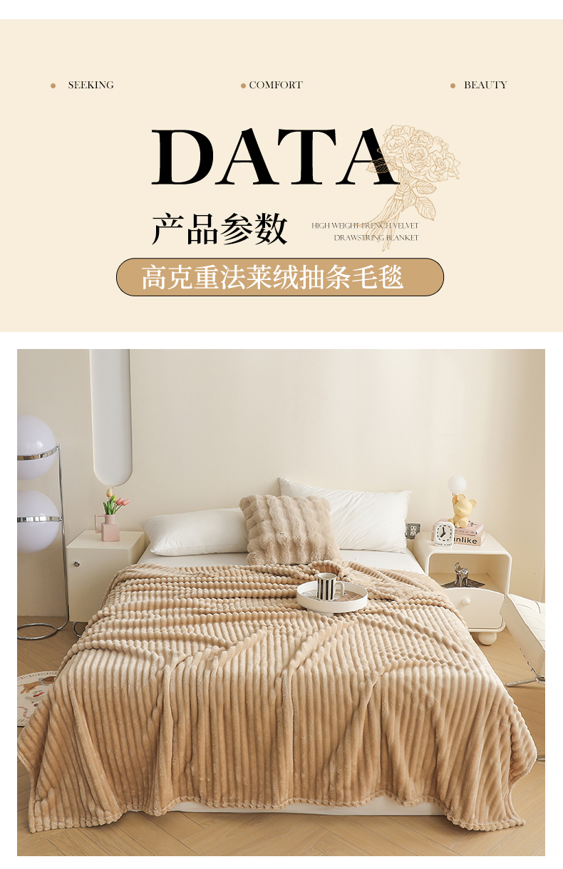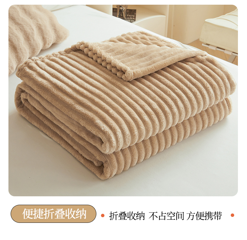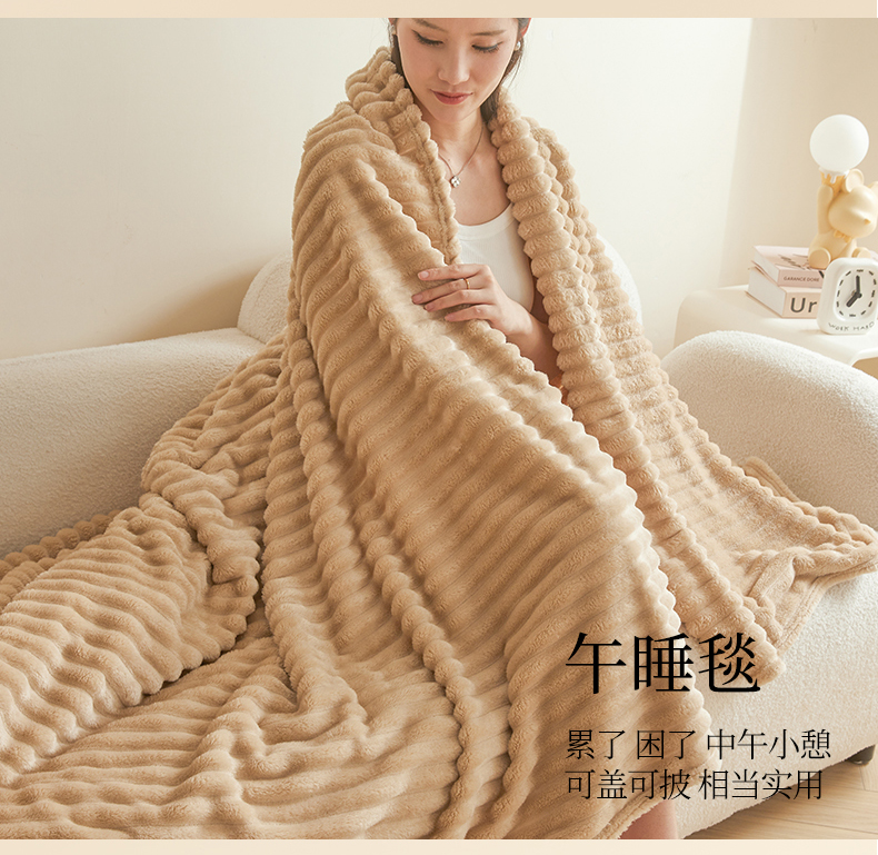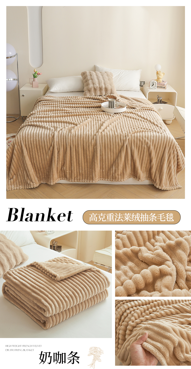 商品名称:予梦家纺 2024新款加厚纯色宽抽条剪花仿兔毛绒牛奶绒法兰绒盖毯(可供跨境) 奶咖条