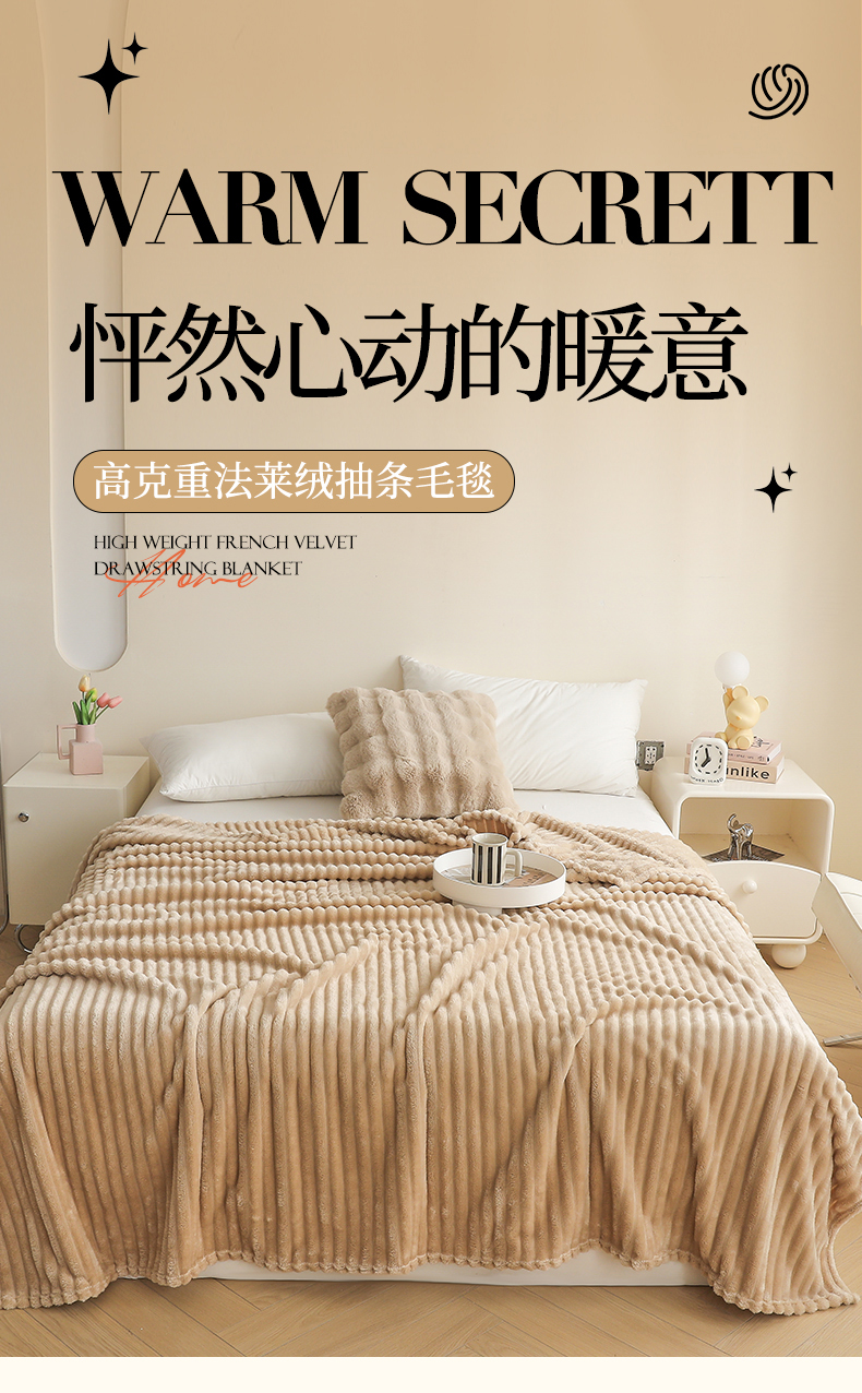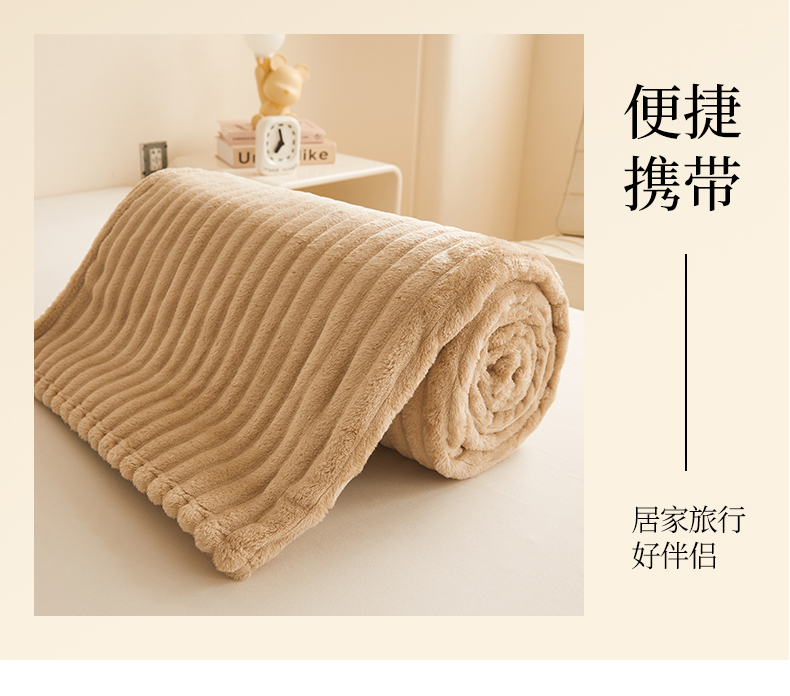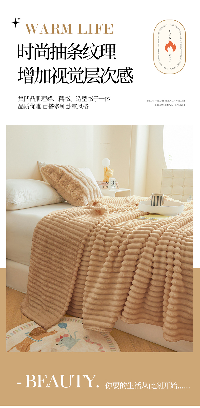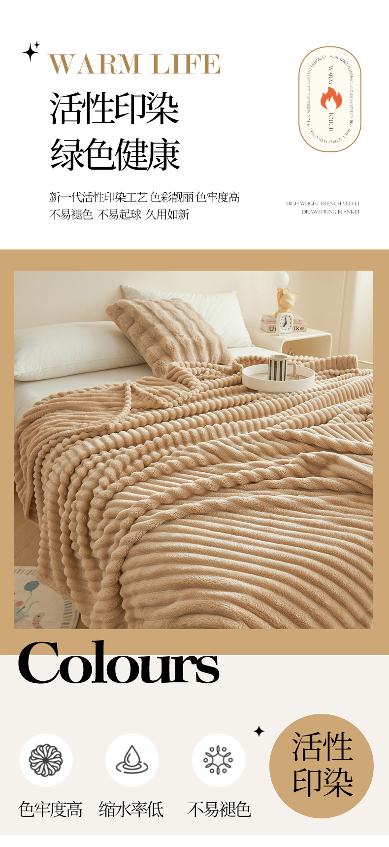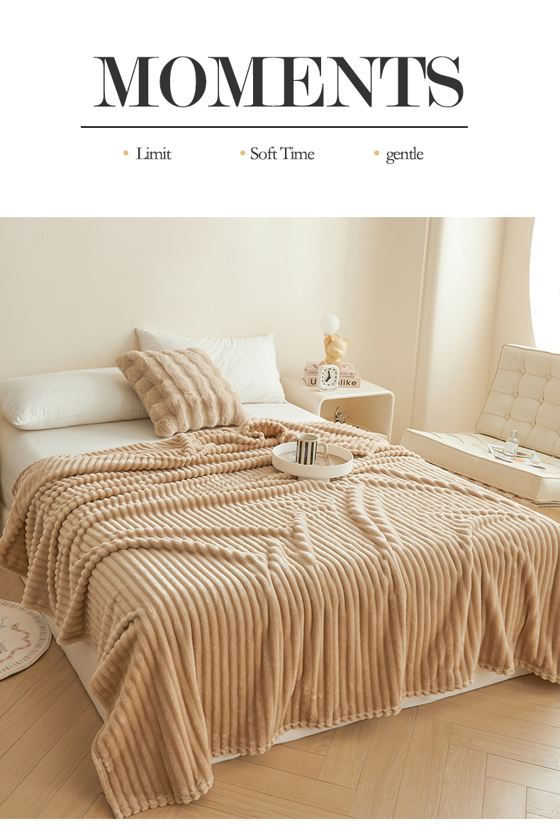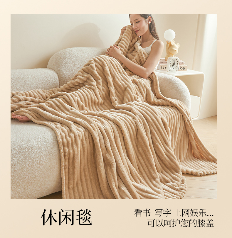 商品名称:予梦家纺 2024新款加厚纯色宽抽条剪花仿兔毛绒牛奶绒法兰绒盖毯(可供跨境) 奶咖条