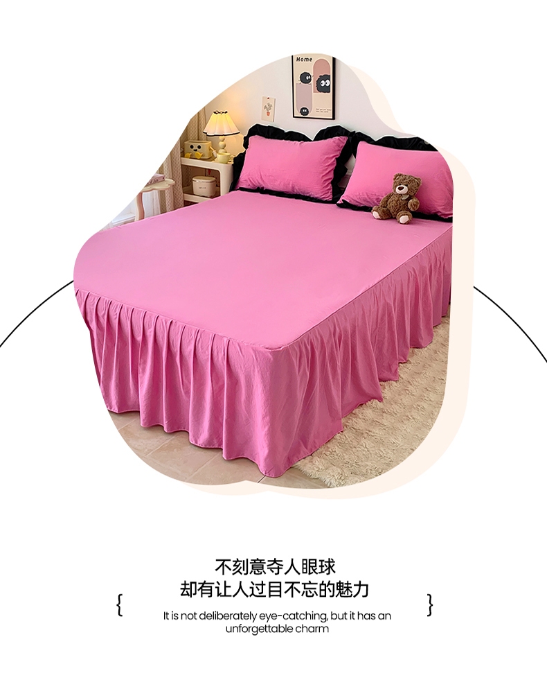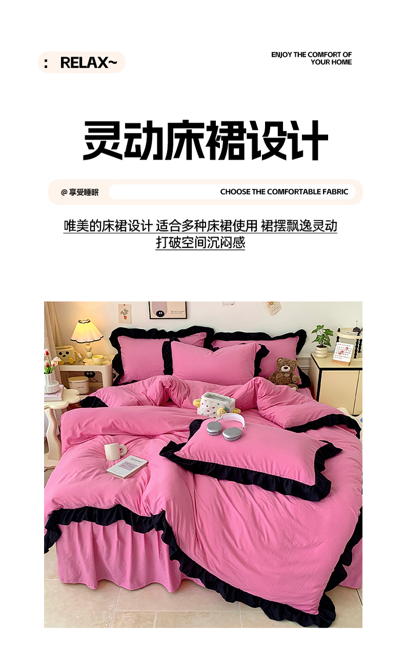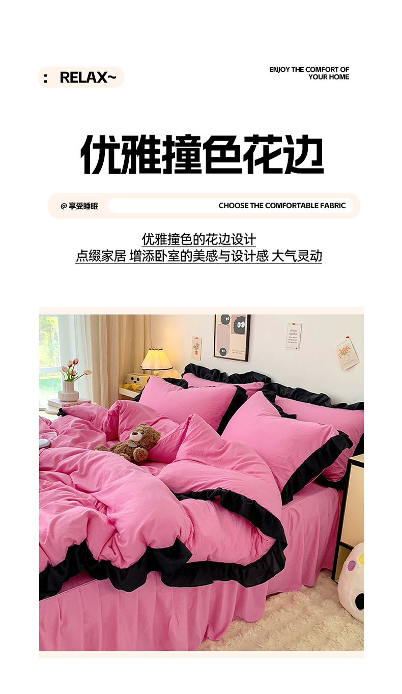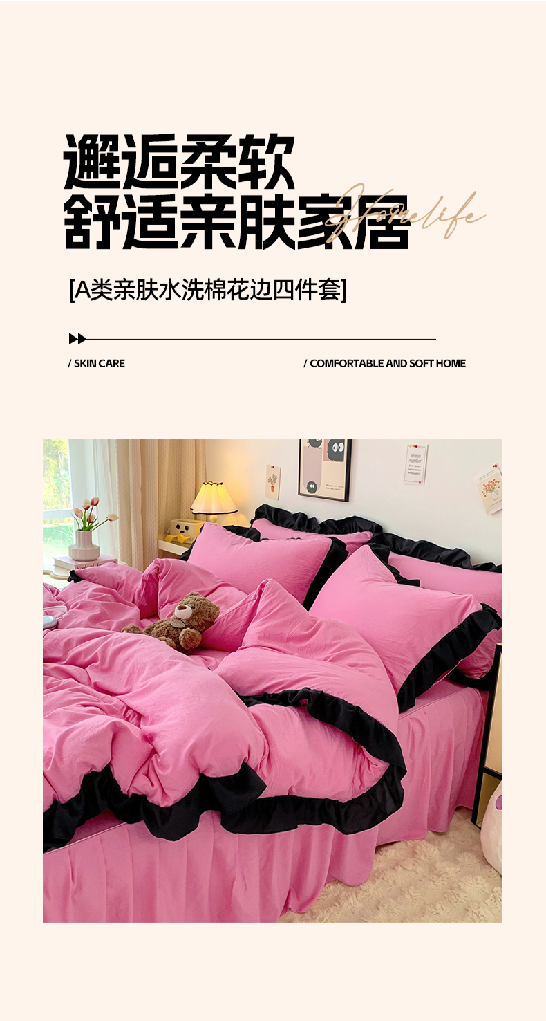 当前位置: 91家纺网 > 商品网购 > 床品套件 > 四件套 > 水洗棉四件套 > 2024新款水洗棉知梦系列黑花边四件套 知梦-樱玫红